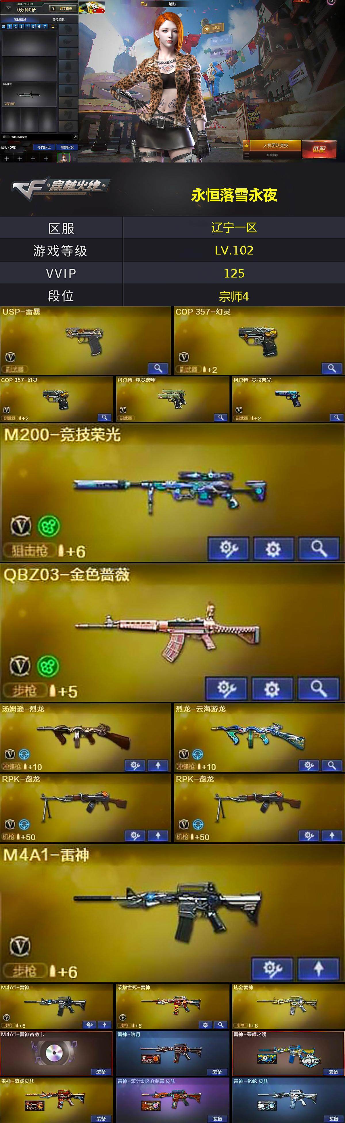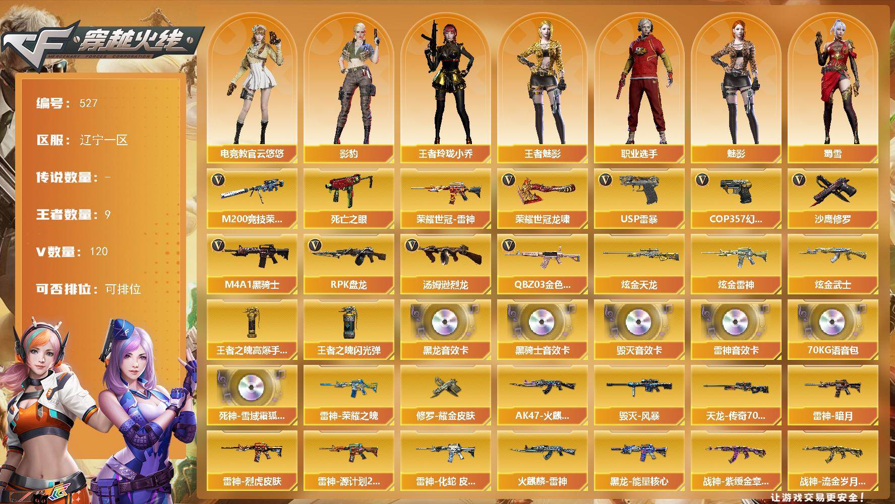 [14825962]辽宁一区-120V-9王者-3炫金 【热门武器】:QBZ03-金色蔷薇,M200-竞技荣光,死亡之眼*2,荣耀世冠-雷神,M4A1-黑骑士,汤姆逊-烈龙,RPK-盘龙*2,USP-雷暴,COP 357-幻灵*2,沙鹰-修罗*4,荣耀世冠-龙啸 【王者炫金武器】:炫金雷神,炫金武士,炫金天龙,王者之魄高爆手雷,王者之魄闪光弹 【音效卡】:M4A1-雷神音效卡,M4A1-黑龙音效卡,M4A1-黑骑士音效卡,Barrett-毁灭音效卡,70KG语音包,死神-雪域霜狐-怀旧音效卡 【皮肤】:雷神-暗月,雷神-荣耀之魄,雷神-烈虎皮肤,雷神-源计划2.0专属 皮肤,雷神-化蛇 皮肤,火麒麟-雷神,AK47-火麒麟-传奇EVEN,毁灭-风暴,黑龙-能量核心,战神-紫绶金章皮肤,战神-流金岁月皮肤,AK47-B-常胜将军-刘备,AWM-天龙-传奇70KG,极光-能量核心,修罗-能量核心,修罗耀金皮肤 【角色】:魅影,影豹,电竞教官-云悠悠,王者-魅影,王者玲珑-小乔,雪域霜狐,奇洋探员,乔伊教练,修道士,云海玲珑,暗夜-X,初恋灵狐,芳心审判者,风暴女*2,虎妞,嘉年华灵狐,疾风,娟娟,0号玩家,灵狐者-X,灵狐者-七夕宝贝,龙儿,龙儿-小淘气,曼陀罗-X,曼陀罗-礼服,娜塔莉娅,潘多拉-X,潘多拉-甜心教官,潜龙队-X,邱刚敖,蛇姬,斯沃特-X,蜀雪,铁骑荣耀,新娜塔莎,雪莉杨-摸金校尉,夜玫瑰-幻能朋克,影武者-X,职业选手 【人偶武器】:AWM-灵狐-15周年嘉年华,COP-旗袍,迷你深渊冰龙*3,迷你裂空之翼,迷你波特博士*3,夺魂,迷你牛牛,深渊终结者手雷,闪光弹-小乔,迷你艾比,迷你超能女侍,迷你巨石泰坦-魔花研究所,灵狐娃娃手雷*2 【暴走生化】:死亡之眼*2,超级对讲机 【挑战大师】:AK47-冰龙粉碎者,冰龙粉碎者-白马银枪,激光毁灭者III-白马银枪*2,激光毁灭者III,机甲撕裂者III,神圣爆裂者-末日III,阐释者III 【英雄级武器】:M4A1-千变,AK47-火麒麟*2,AK47-麒麟,M4A1-黑龙,M4A1-雷神*2,M4A1-黑骑士,M4A1-死神,AK47-黑武士,M4A1-武圣,AK47-机械迷城,AK47-黑鲨,M4A1-龙血,M4A1-夜魔,M4A1-幻灵,无影-神兵利器,死神-雪域霜狐,M4A1-玫瑰精灵,QBZ03-金色蔷薇,M4