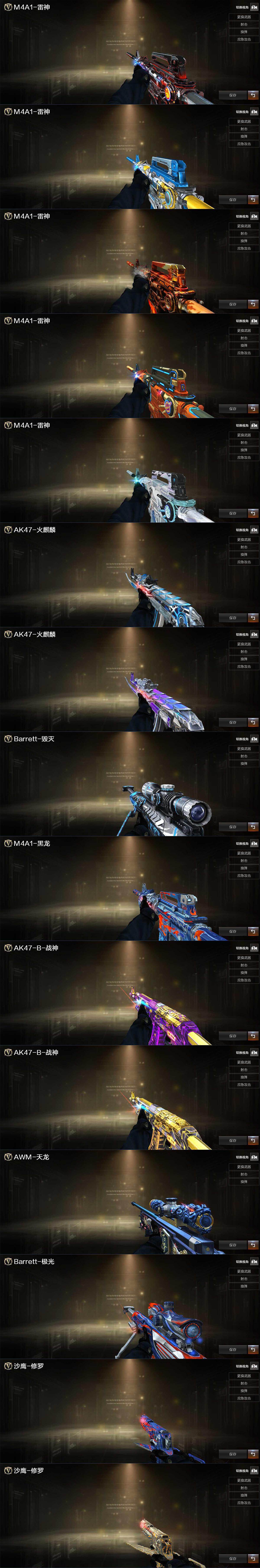 【皮肤】:雷神-暗月,雷神-荣耀之魄,雷神-烈虎皮肤,雷神-源计划2.0专属 皮肤,雷神-化蛇 皮肤,火麒麟-雷神,AK47-火麒麟-传奇EVEN,毁灭-风暴,黑龙-能量核心,战神-紫绶金章皮肤,战神-流金岁月皮肤,AK47-B-常胜将军-刘备,AWM-天龙-传奇70KG,极光-能量核心,修罗-能量核心,修罗耀金皮肤