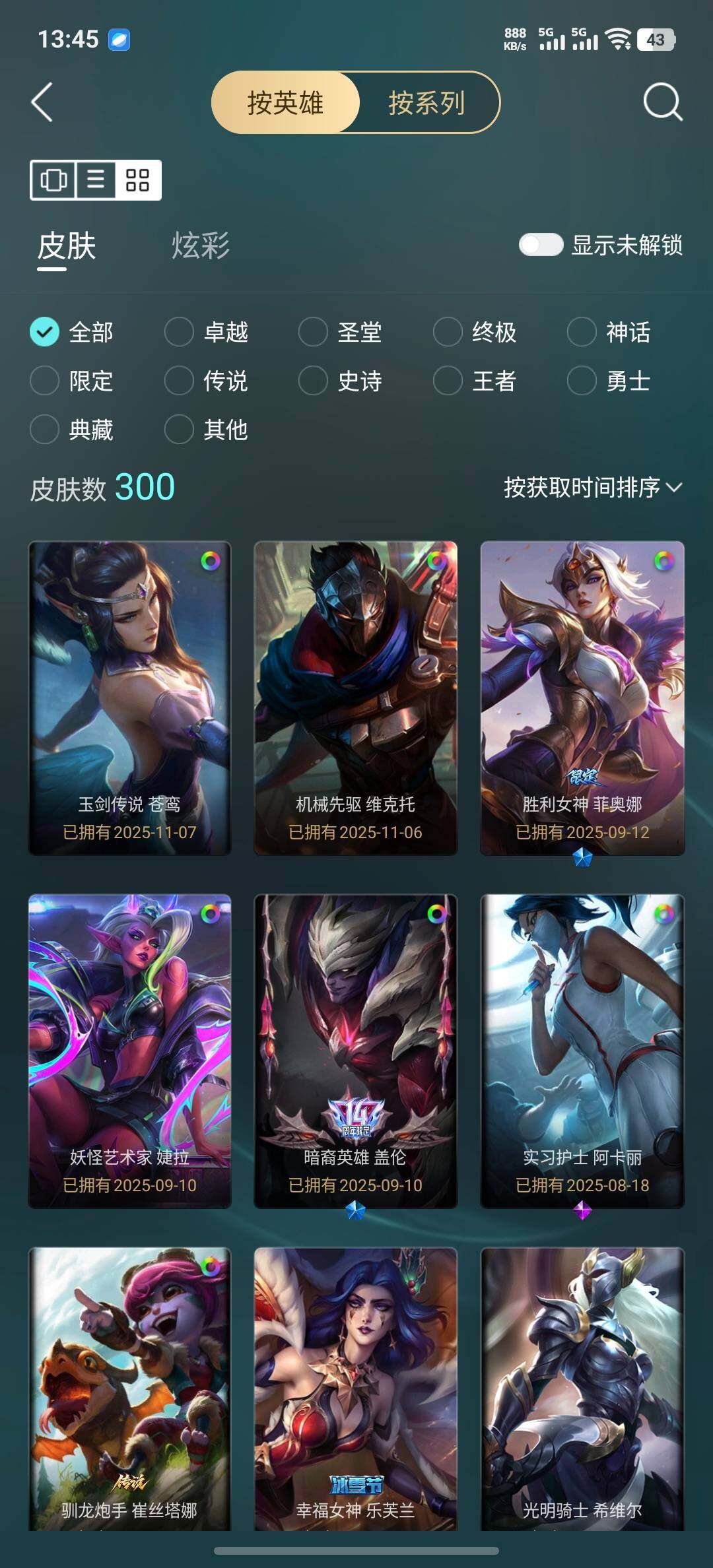 【神话皮肤】:十周年纪念安妮,源代码乐芙兰,十五周年纪念希维尔,神凰行者瑞羽圣凰艾尼维亚,海克斯科技雷克顿,摄魂使者薇恩,至臻真实伤害赛娜,至臻真实伤害亚索,至臻暗星墨菲特,至臻奥术师佐伊,至臻福牛守护者菲奥娜,至臻黑夜使者李青,至臻KDAALLOUT卡莎,至臻灵能特工伊泽瑞尔,至臻魅惑女巫莫甘娜,至臻魔女乐芙兰,至臻神龙尊者炎龙瑟提,至臻王国机神玄武盖伦,至臻未来战士卢锡安,至臻源计划逆流塞拉斯,至臻玉剑传说武剑仙