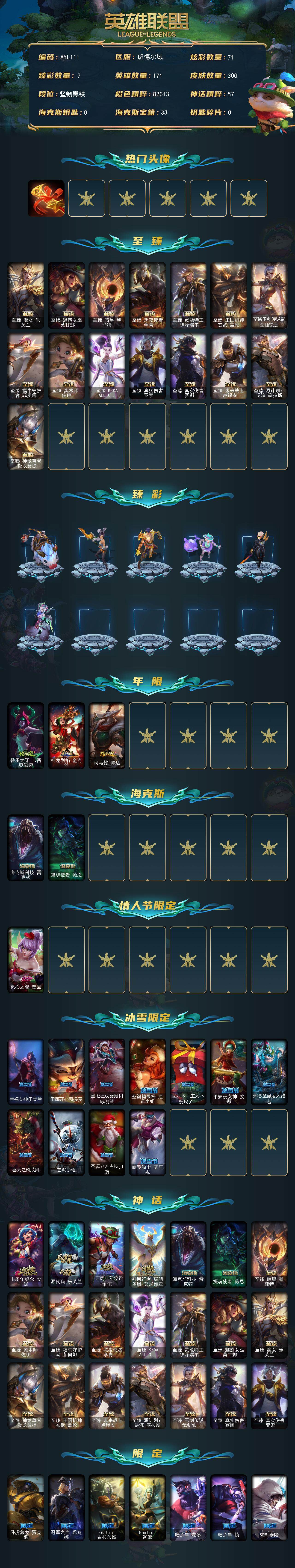 [14759414]【店主推荐捡漏号!可直接换绑】未定级段位-171英雄-300皮肤-71炫彩-0终极-21神话-50限定-32传说-67史诗