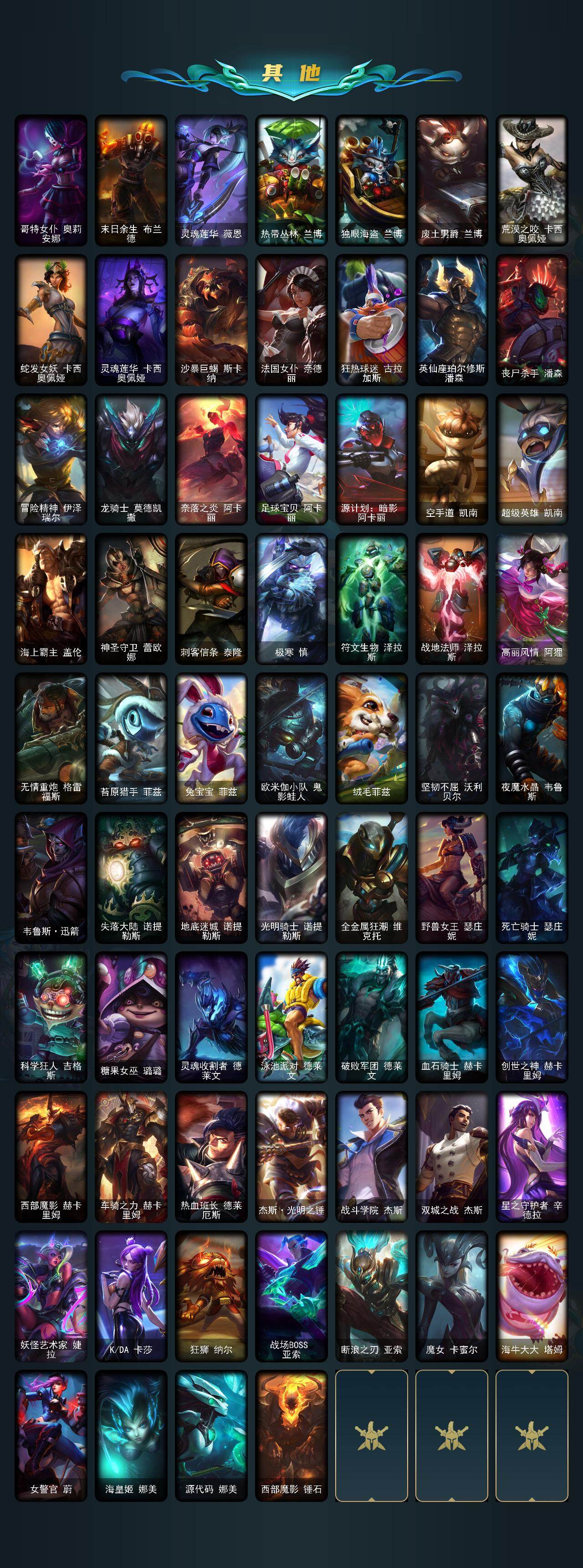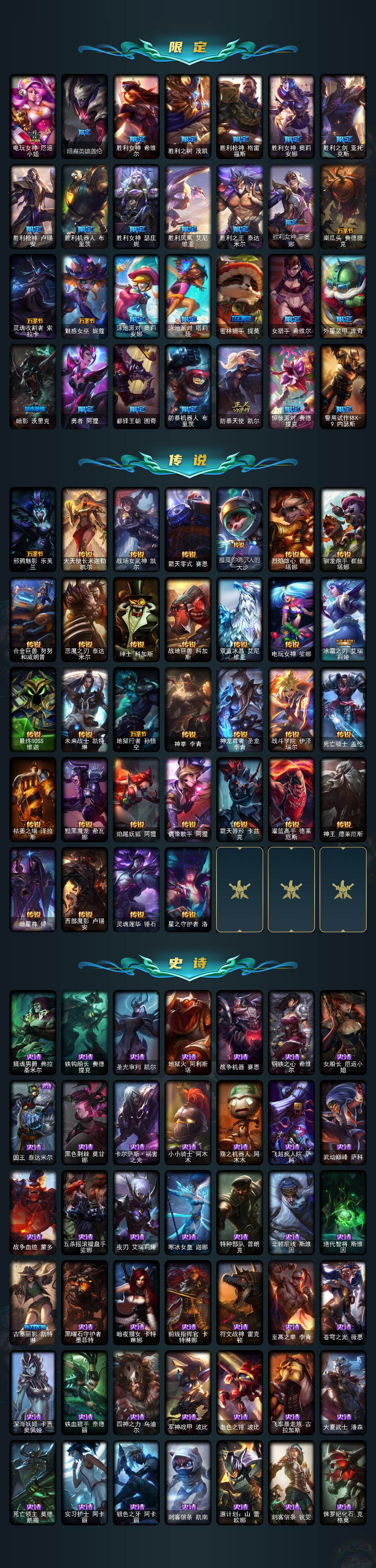 【冰雪限定】:幸福女神乐芙兰,圣诞开心鬼提莫,圣诞狂欢努努和威朗普,圣诞糖果棒厄运小姐,阿木木“主人不要我了”,平安夜女神娑娜,邪恶圣诞老人维迦,喜庆之树茂凯,雪默丁格,圣诞老人古拉加斯,魄罗骑士瑟庄妮