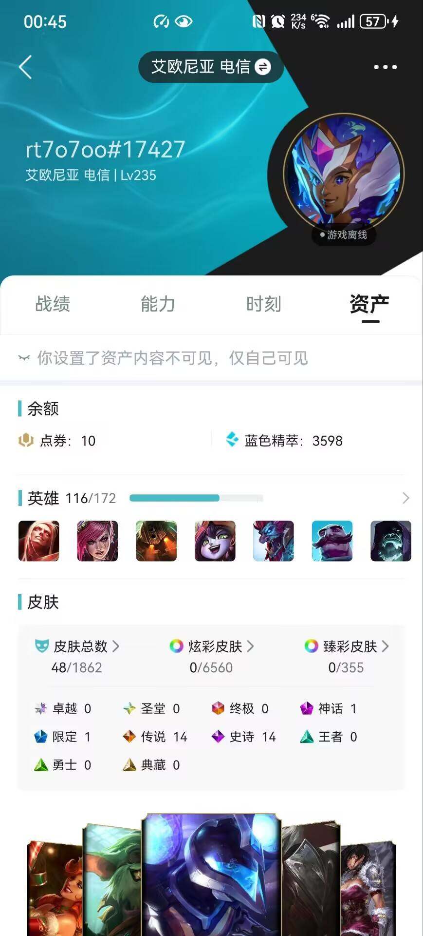 [14832650]可二次【店主推荐捡漏号!可直接换绑】黑铁段位-116英雄-48皮肤-0炫彩-0终极-1神话-1限定-14传说-14史诗