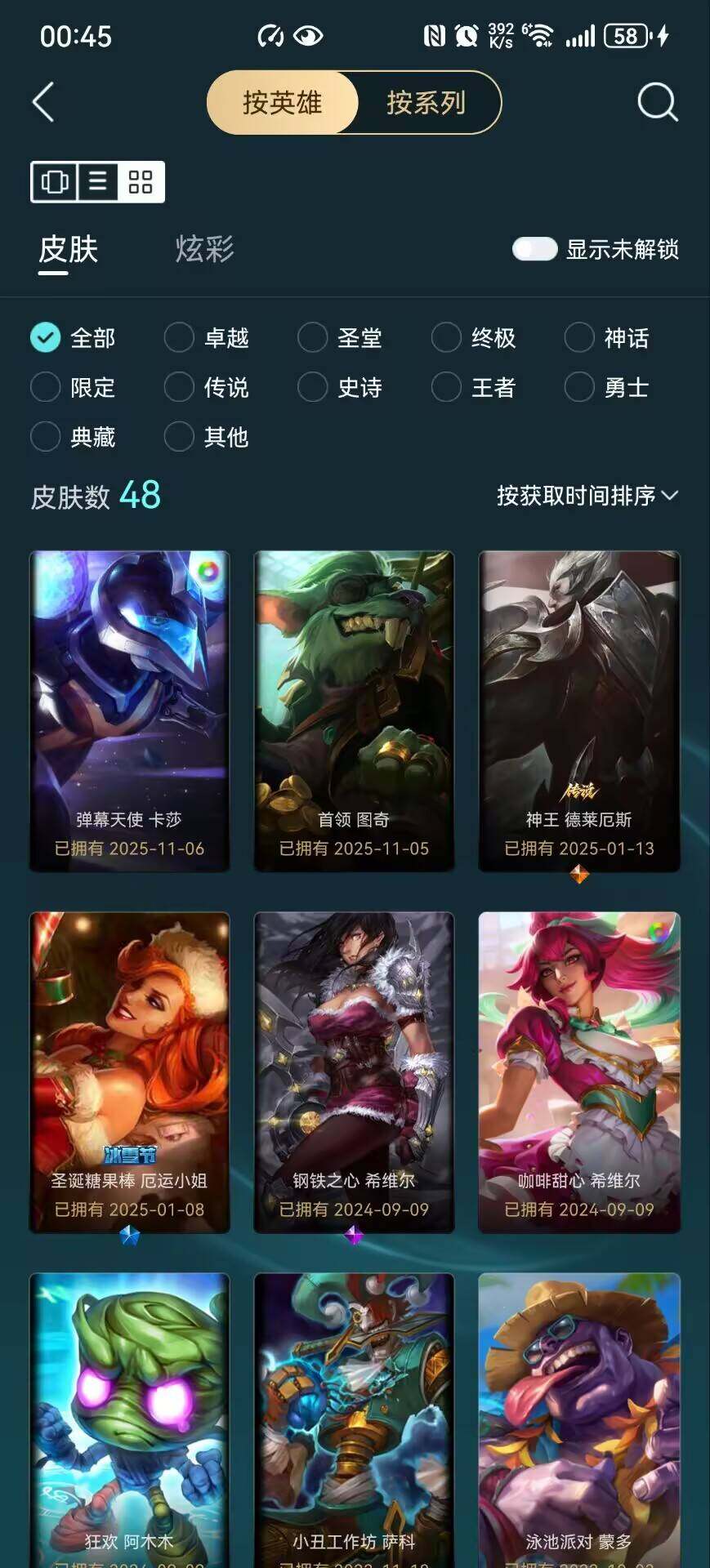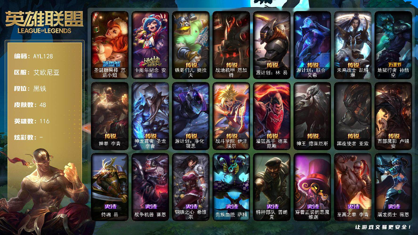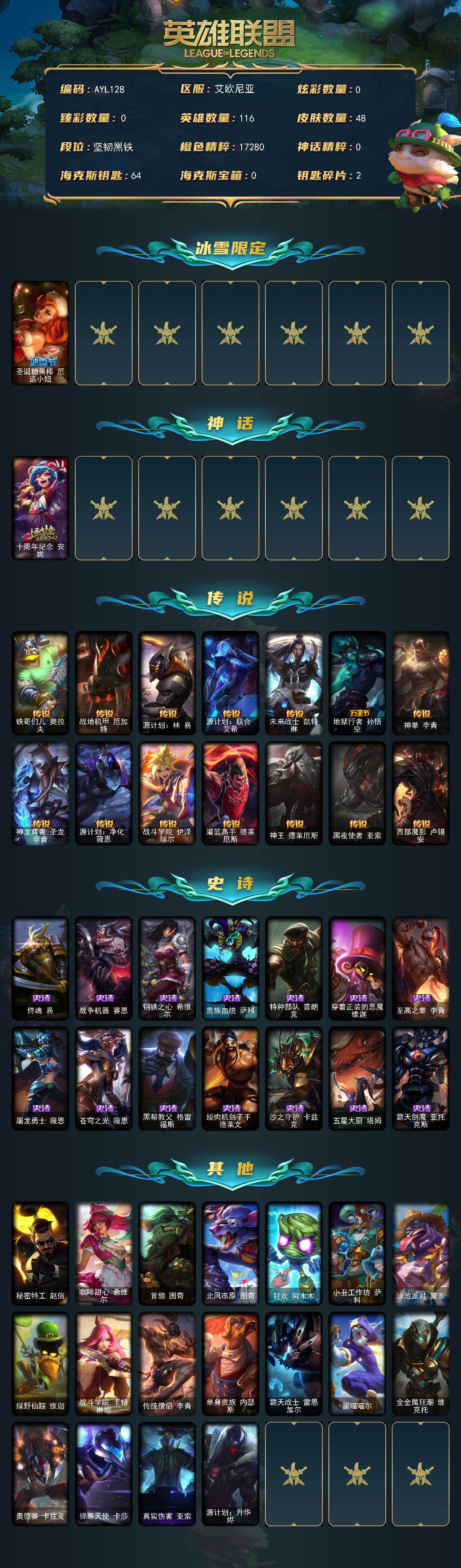 [14832650]可二次【店主推荐捡漏号!可直接换绑】黑铁段位-116英雄-48皮肤-0炫彩-0终极-1神话-1限定-14传说-14史诗 【冰雪限定】:圣诞糖果棒厄运小姐 【神话皮肤】:十周年纪念安妮 【传说皮肤】:铁哥们儿奥拉夫,战地机甲厄加特,源计划林易,源计划联合艾希,未来战士凯特琳,地狱行者孙悟空,神拳李青,神龙尊者圣龙李青,源计划净化薇恩,战斗学院伊泽瑞尔,灌篮高手德莱厄斯,神王德莱厄斯,黑夜使者亚索,西部魔影卢锡安 【史诗皮肤】:侍魂易,战争机器赛恩,钢铁之心希维尔,贵族血统萨科,特种部队普朗克,穿着正装的恶魔维迦,至高之拳李青,屠龙勇士薇恩,苍穹之光薇恩,黑帮教父格雷福斯,绞肉机刽子手德莱文,沙之守护卡兹克,五星大厨塔姆,霸天剑魔亚托克斯 【其他皮肤1】:秘密特工赵信,咖啡甜心希维尔,首领图奇,北风冻原图奇,狂欢阿木木,小丑工作坊萨科,泳池派对蒙多,绿野仙踪维迦,战斗学院卡特琳娜,传统僧侣李青,单身贵族内瑟斯,霸天战士雷恩加尔,雷喵喵尔,全金属狂潮维克托,奥德赛卡兹克,弹幕天使卡莎,真实伤害亚索,源计划升华烬