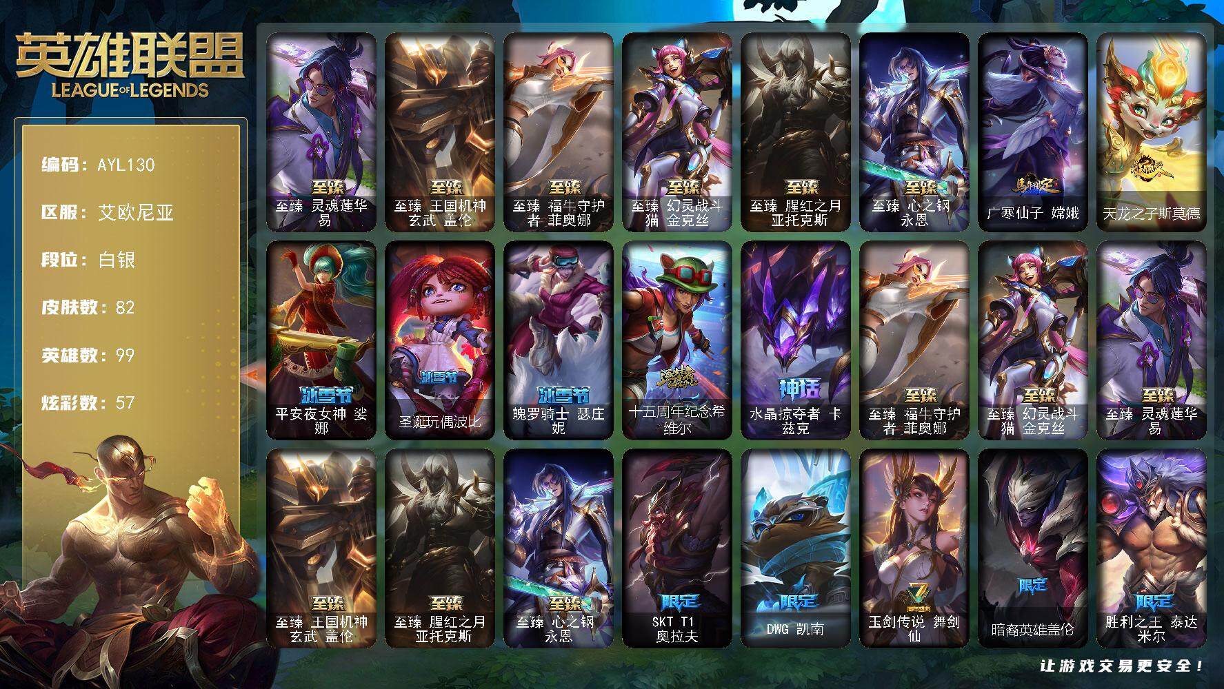 [14833018]可二次【店主推荐捡漏号!可直接换绑】白银段位-99英雄-82皮肤-57炫彩-0终极-8神话-12限定-10传说-10史诗 【至臻皮肤】:至臻灵魂莲华易,至臻王国机神玄武盖伦,至臻福牛守护者菲奥娜,至臻幻灵战斗猫金克丝,至臻腥红之月亚托克斯,至臻心之钢永恩 【臻彩皮肤】:无畏骑士瑟庄妮赤子初心,泳池派对辛德拉荔枝枝连击,霸天巨兽雪崩墨菲特,玉剑传说神机花火青竹 【年限皮肤】:广寒仙子嫦娥,天龙之子斯莫德 【冰雪限定】:平安夜女神娑娜,圣诞玩偶波比,魄罗骑士瑟庄妮 【神话皮肤】:十五周年纪念希维尔,水晶掠夺者卡兹克,至臻福牛守护者菲奥娜,至臻幻灵战斗猫金克丝,至臻灵魂莲华易,至臻王国机神玄武盖伦,至臻腥红之月亚托克斯,至臻心之钢永恩 【限定皮肤】:SKTT1奥拉夫,DWG凯南,玉剑传说舞剑仙,暗裔英雄盖伦,胜利之王泰达米尔,胜利巨口克格莫,胜利剑圣易 【传说皮肤】:烈焰雄心崔丝塔娜,魔女伊芙琳,最终BOSS维迦,战斗学院凯特琳,上古战魂魔腾,绝息圣堂锐雯,灵魂莲华阿狸,霸天异形卡兹克,神王德莱厄斯,暗星锤石 【史诗皮肤】:冰霜烈焰安妮,腥红之月崔斯特,摄魂男爵弗拉基米尔,法国皇室厄运小姐,苍穹之光薇恩,钢之逆鳞希瓦娜,海牛猎手菲兹,虚空海灵菲兹,暗黑女武神黛安娜,源计划自由艾克 【其他皮肤1】:太空律动万能舞王崔斯特,魔女乐芙兰,绝息圣堂弗拉基米尔,五杀摇滚女声主唱凯尔,星战易,小蜜蜂提莫,欧米伽小队魔鬼伞兵,梦魇泰达米尔,至高天贾克斯,玉剑传说苍鸾,青花瓷艾瑞莉娅,我怒角维迦,巅峰之星布里茨,苍穹之光布兰德,太空律动串烧大师兰博,单身贵族内瑟斯,心之钢伊泽瑞尔,喵里克,战斗教授格雷福斯,神龙尊者均衡之龙沃利贝尔,西部魔影天使韦鲁斯,刃执事德莱文,西部魔影德莱厄斯,青花瓷德莱厄斯,抵抗军雷神杰斯,黑夜使者凯隐,KDAALLOUT卡莎,银河魔装机神纳尔,香浓芝士扎克,山海绘卷烬,丧尸杀手金克丝,源计划疯狂金克丝,五杀摇滚之噪音佛耶戈,正义之枪卢锡安,源计划裁决蔚,灵能特工蔚,深渊恐惧锤石,黯晶巨兽雷克塞,灌篮高手艾翁,战斗学院永恩,心之钢瑟提,花仙贤者米利欧