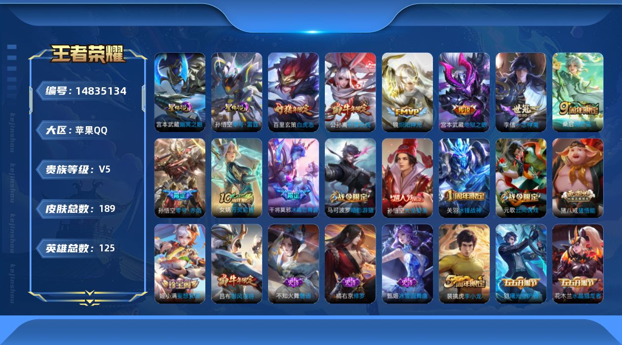 - PX_2087264-实名: 可修改 贵族等级: V5 英雄数: 124 皮肤数: 143 传说皮: 久胜战神 限定皮: 梁祝,飞衡,凤求凰,至尊宝,傲雪梅枪,五谷丰年