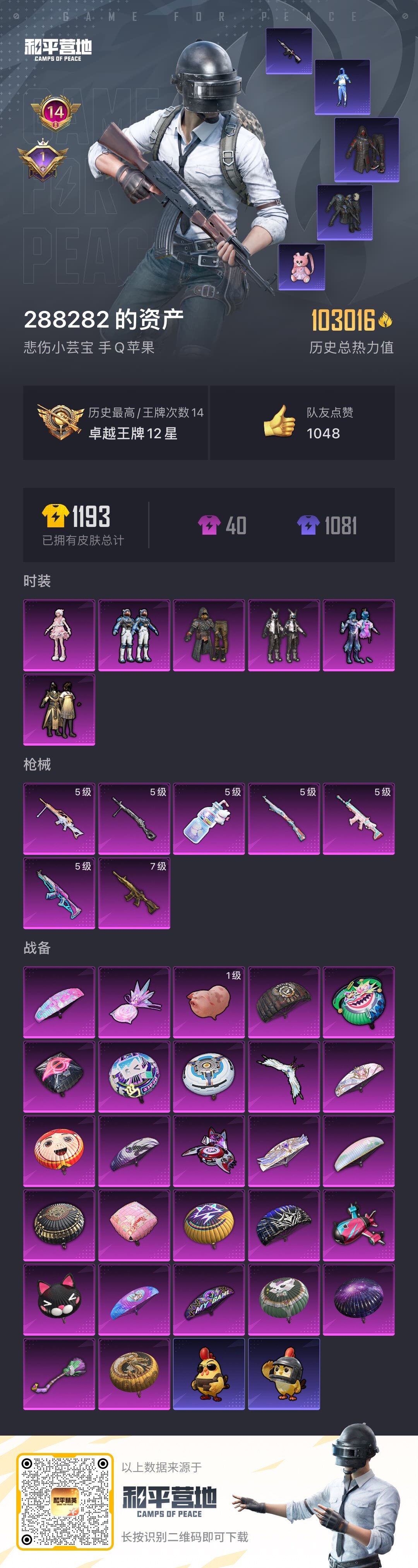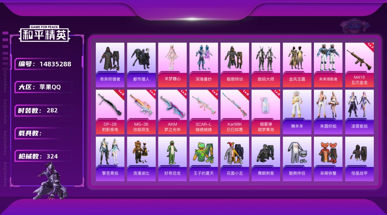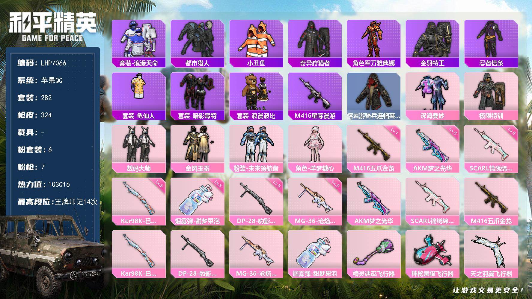 [14835288]agfxo套装!【店主推荐捡漏号!可直接换绑】苹果 手Q-6粉装-7特效枪-0载具-6粉色飞行器-103016热力值-14王牌印记-282套装-324枪皮