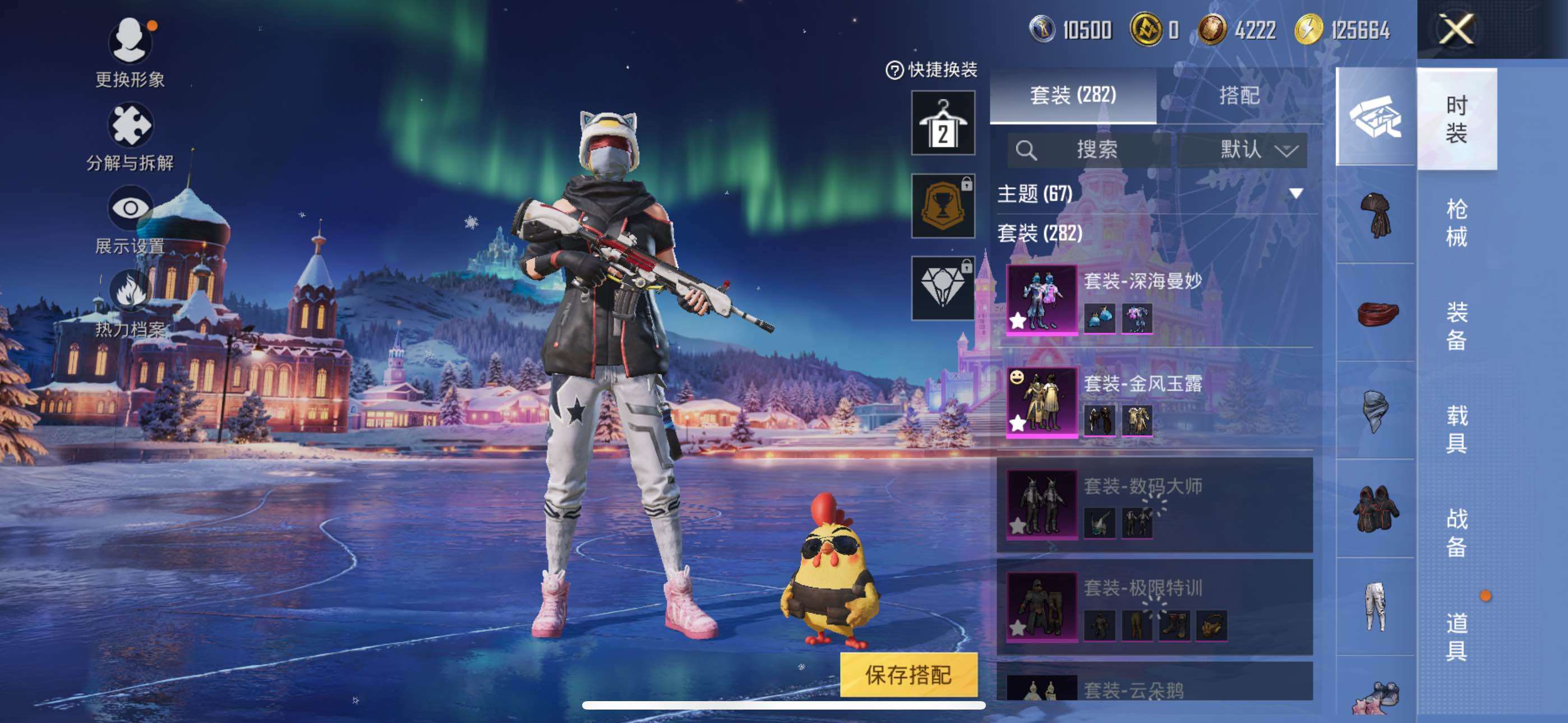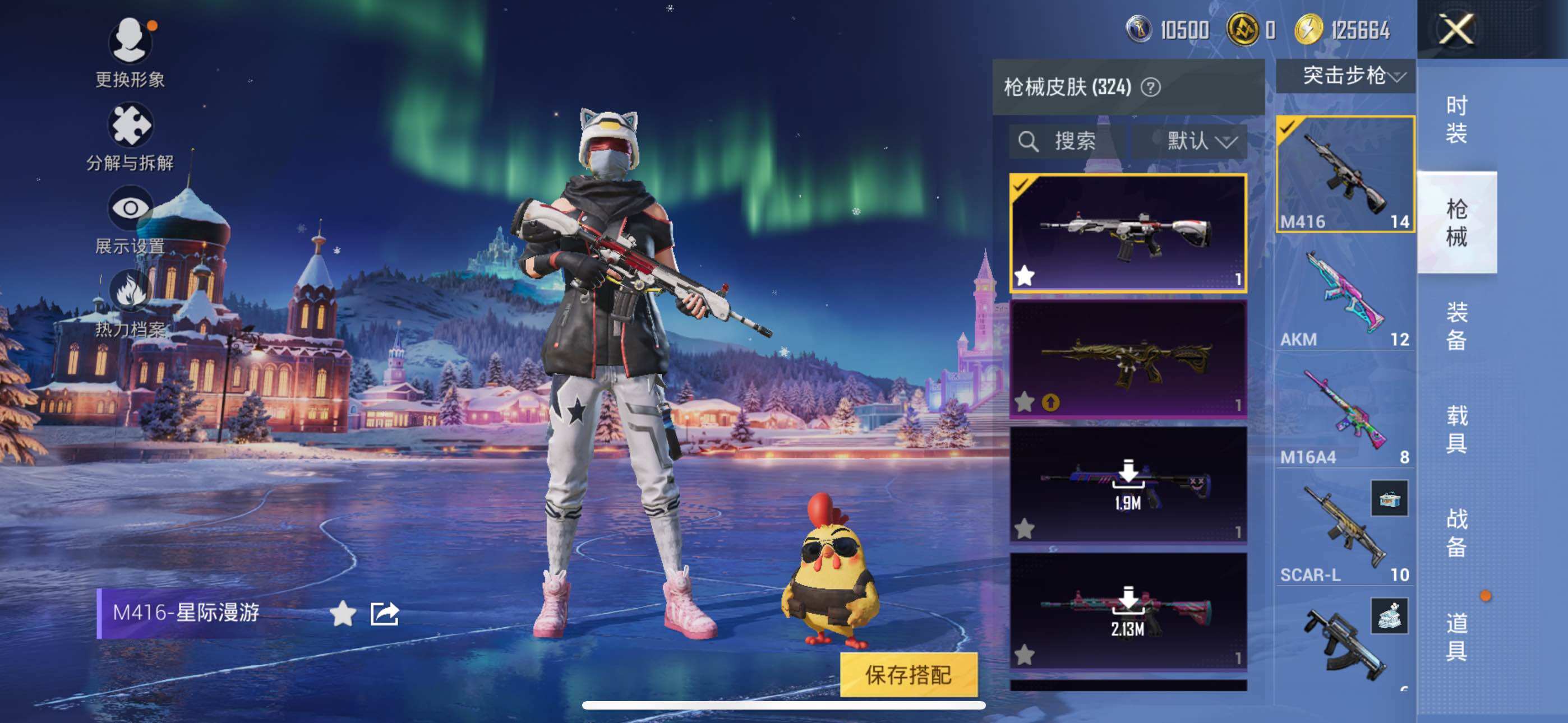 M416-星际漫游,AKM-奇异狩猎者,AKM-缤纷海域,M416-仓鼠灰灰,M416-快乐主宰,M762-奇异狩猎者,Kar98K-深海曼妙,M24-奇异狩猎者,S686-奇异狩猎者,M249-古堡领主