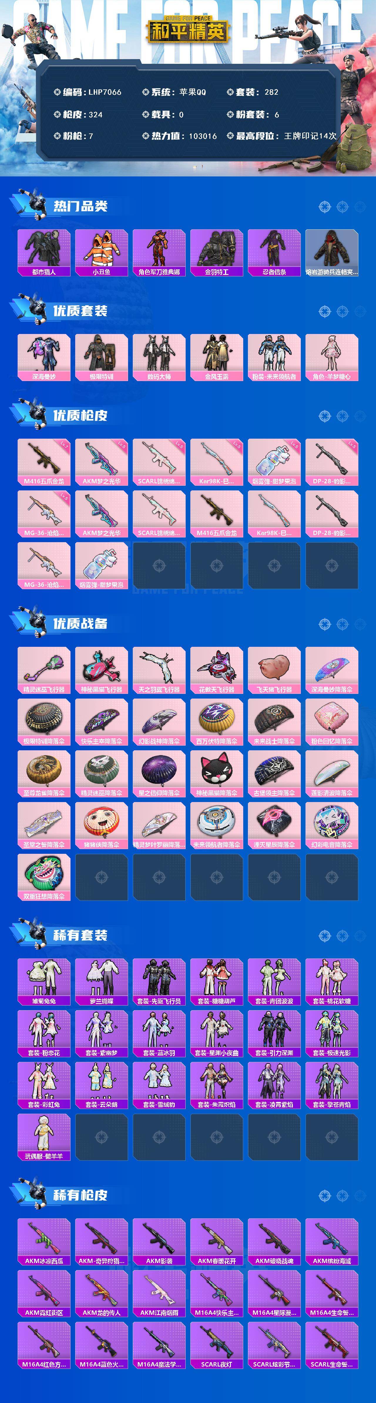 - [12955102]苹果 手Q-4粉装-2特效枪-2载具-3.2w热力值-6王牌印记-77套装-103枪皮【热门品类】:套装-龟仙人,套装-暗影哥特【粉色载具】:迈凯伦570S(天际蓝),鬼马风驰【粉色套装】:角色-白勺歌姬,角色-呆萌星弥,角色-小可学妹,角色-千金淑猫【粉色枪皮等级】:Kar98K-巳巳如意(四级),MG3-梦幻舞会(七级)