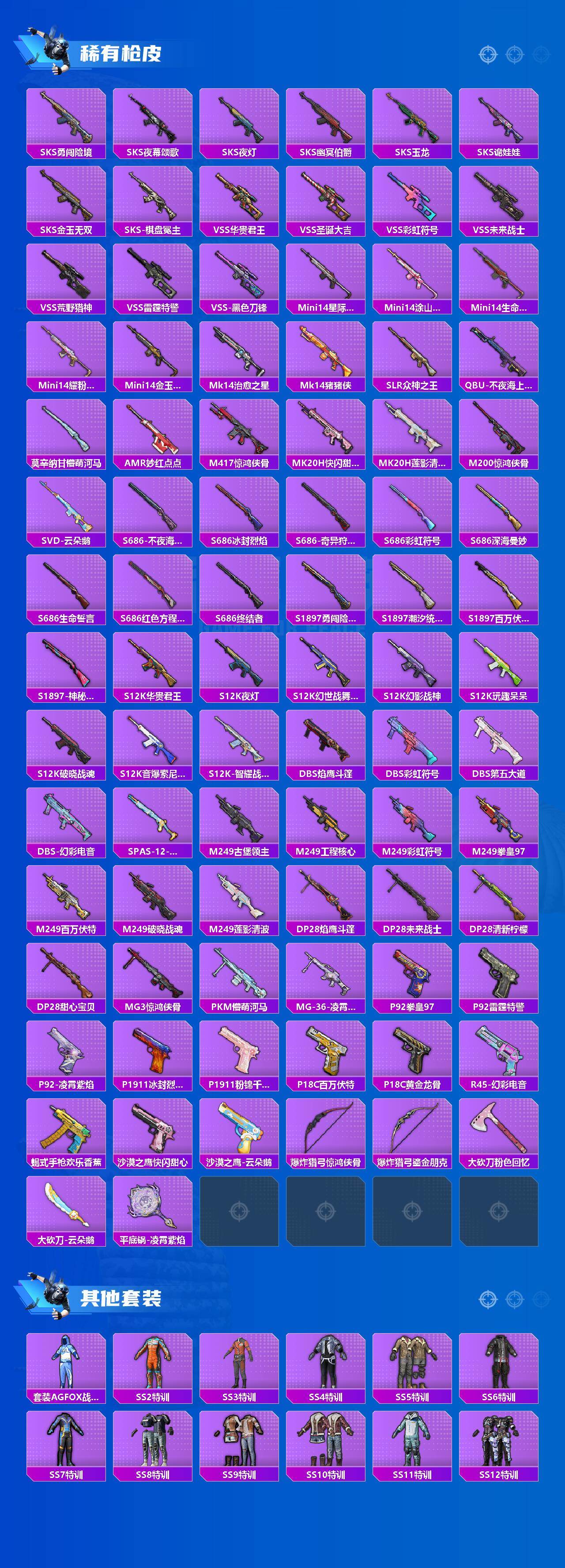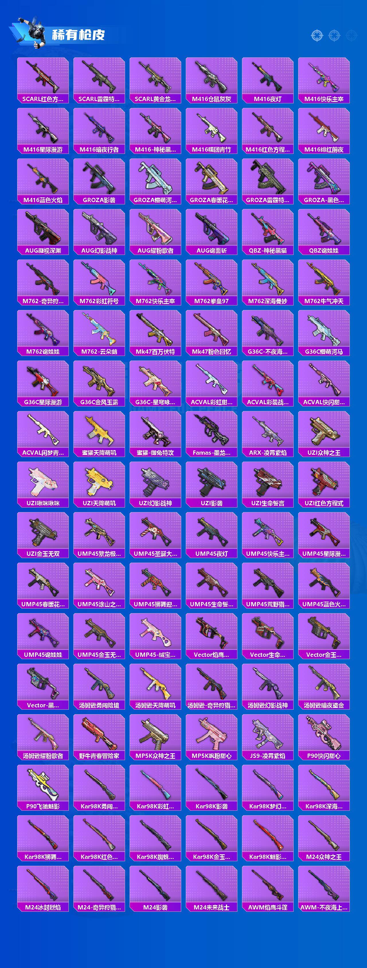 【稀有枪皮】:AKM-冰凉西瓜,AKM-奇异狩猎者,AKM-影袭,AKM-春暖花开,AKM-江南烟雨,AKM-破晓战魂,AKM-缤纷海域,AKM-霓虹街区,AKM-龙的传人,M16A4-快乐主宰,M16A4-星际漫游,M16A4-生命誓言,M16A4-红色方程式,M16A4-蓝色火焰,M16A4-魔法学院,SCAR-L-夜灯,SCAR-L-炫彩节奏,SCAR-L-生命誓言,