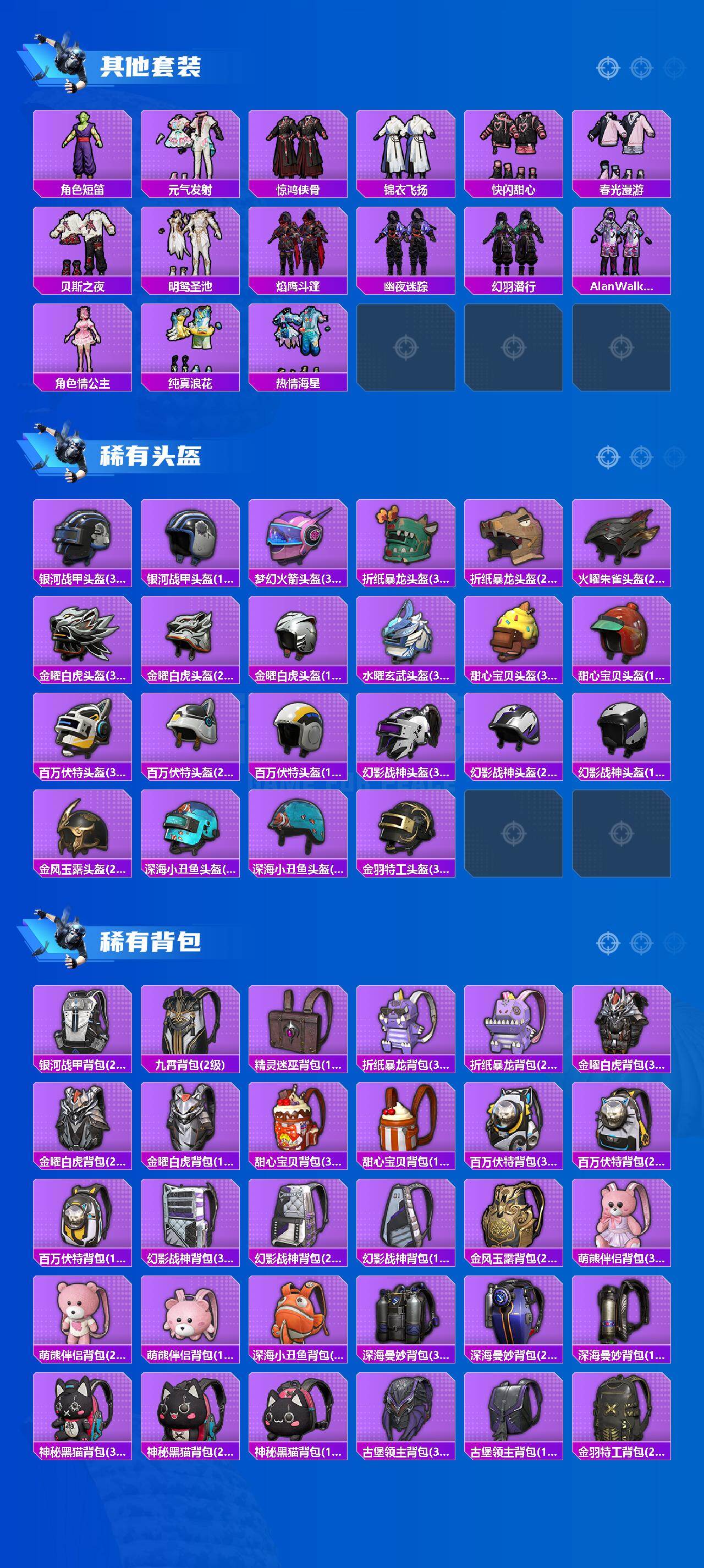 - [15506980],【店主推荐捡漏号!可直接换绑】113944k哈伏币-155m流动资产-50烽火等级-钻石-1战场等级-无军衔 【干员外观】:骇爪-维什戴尔,红狼-电锯惊魂 【近战皮肤】:近战-黑鹰 【传说外观】:SCAR-H战斗步枪-启航,KC17突击步枪-电锯惊魂,R93狙击步枪-维什戴尔 【史诗外观】:腾龙突击步枪-猎鳄行动,MP5冲锋枪-战术竞备,MP5冲锋枪-竞技风,Vector冲锋枪-阿萨拉文明,勇士冲锋枪-工业狂潮 【稀有外观】:AKM突击步枪-肃杀,QBZ95-1突击步枪-公平竞技,M7战斗步枪-捣蛋鬼,SCAR-H战斗步枪-荣耀列队,腾龙突击步枪-冰天雪地,MP5冲锋枪-哈夫克卫队,P90冲锋枪-黄昏,P90冲锋枪-捣蛋鬼,Vector冲锋枪-先锋,UZI冲锋枪-亚特兰蒂斯,SMG-45-行动开启,勇士冲锋枪-冰天雪地,M1014霰弹枪-幻影结构,QJB201轻机枪-哈夫克卫队,Mini-14射手步枪-荣耀列队,SV-98狙击步枪-星链科技,SV-98狙击步枪-哈夫克航天,SV-98狙击步枪-精英联盟,G18-星链科技,G18-哈夫克航天 【普通外观】:M4A1突击步枪-高雅黑,QBZ95-1突击步枪-海浪,QBZ95-1突击步枪-海色,K416突击步枪-高雅黑,M16A4突击步枪-高雅黑,M7战斗步枪-红色涂装,SCAR-H战斗步枪-数码迷彩,G3战斗步枪-高雅黑,MP5冲锋枪-海色,MP5冲锋枪-黄蜂,野牛冲锋枪-高雅黑,M249轻机枪-黄蜂,M250通用机枪-条纹,SVD狙击步枪-高雅黑,QSZ92G-条纹,沙漠之鹰-海浪,沙漠之鹰-高雅黑 【载具外观】:轮式突击炮-荣耀 【军牌】:军牌-永恒,军牌-信誉优秀,军牌-小心鳄鱼 【挂饰】:挂饰-羊角威龙,挂饰-维什戴尔,挂饰-蚀金玫瑰,挂饰-阿萨拉狙击兵*4,挂饰-诡影狙击兵,挂饰-暗行哨兵*4,挂饰-启程,挂饰-阿萨拉徽章*6,挂饰-阿萨拉狙击兵,挂饰-暗行哨兵