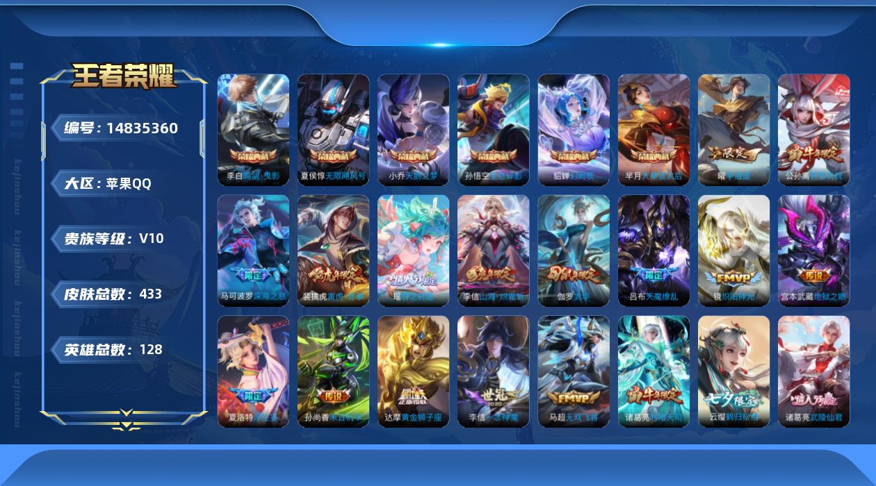 [14835360]小国服橘右京!【店主推荐捡漏号!可直接换绑】苹果Q-V10-最强王者段位-128英雄-433皮肤-6典藏皮肤-1典藏英雄-64传说-124史诗 【英雄全皮】:达摩全皮,孙权全皮,娜可露露全皮,橘右京全皮,鬼谷子全皮,李信全皮,猪八戒全皮,蒙恬全皮,影全皮 【荣耀典藏】:武则天英雄,孙悟空全息碎影,夏侯惇无限飓风号,小乔天鹅之梦,芈月大秦宣太后,李白鸣剑曳影,貂蝉幻阙歌 【传说皮肤】:裴擒虎祥瑞亨通,桑启鸣野蒿,艾琳觅芳踪,云缨鹤归松栖,诸葛亮鹤羽星尊,亚瑟追逃游戏,安琪拉追逃游戏,夏洛特浮生妄,干将莫邪画中仙,花木兰燃星之曲,虞姬无限倾心,项羽无限倾心,伽罗炽翼辉光,李信山海炽霜斩,狄仁杰神器狴犴令,王昭君星穹之声,橘右京枫霜尽,娜可露露前尘镜,孙尚香音你闪耀,马可波罗深海之息,后羿无尽星芒,马超无双飞将,大乔挚爱花嫁,孙策挚爱之约,露娜启示之音,女娲补天,瑶时之祈愿,裴擒虎寅虎赤拳,鲁班七号寅虎瑞焰,孙尚香异界灵契,貂蝉遇见胡旋,赵云淬星耀世,王昭君乞巧织情,曜李逍遥 ,周瑜音你心动,小乔音你心动,李元芳飞鸢探春,公孙离祈雪灵祝,诸葛亮时雨天司,铠绛天战甲,镜炽阳神光,虞姬启明星使,孙悟空零号赤焰,关羽武圣,曜云鹰飞将,李信一念神魔,刘备时之恋人,伽罗太华,貂蝉猫影幻舞,张良黄金白羊座,干将莫邪久胜战神,虞姬云霓雀翎,达摩黄金狮子座,花木兰冠军飞将,梦奇胖达荣荣,后羿黄金射手座,诸葛亮武陵仙君,貂蝉仲夏夜之梦,孙尚香末日机甲,宫本武藏地狱之眼,孙悟空地狱火,吕布天魔缭乱,武则天海洋之心,狄仁杰超时空战士 【限定皮肤】:狄仁杰阴阳师,廉颇寅虎御盾,赵云皇家上将,赵云引擎之心,墨子神迹守卫,妲己时之奇旅,嬴政优雅恋人,孙尚香异界灵契,鲁班七号乒乒小将,鲁班七号寅虎瑞焰,庄周高山流水,钟无艳超时空战士,孙膑天狼运算者,扁鹊奇幻香踪,白起夜都怪侠,芈月白晶晶,芈月幻夜卜梦,吕布天魔缭乱,吕布御风骁将,周瑜赤莲之焰,元歌云间偶戏,元歌无心,夏侯惇朔风刀,甄姬女儿国国王,甄姬游园惊梦,甄姬落雪兰心,典韦蓝屏警告,马可波罗暗影游猎,马可波罗深海之息,狄仁杰魔术师,狄仁杰万华元夜,狄仁杰神器狴犴令,达摩星际陆战队,达摩沙漠行僧,项羽海滩派对,项羽无限倾心,老夫子醍醐杖,老夫子航海奇遇记,关羽冰锋战神,关羽武圣,貂蝉遇见胡旋,安琪拉追逃游戏,程咬金演武夺筹,露娜一生所爱,露娜启示