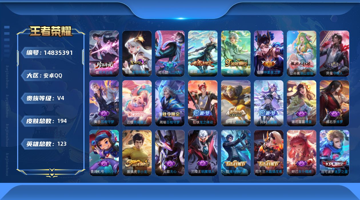 - [12116990]V9 2典藏 17传说 125英雄 352皮肤 典藏英雄武则天 可修改实名 优质装备:杀手不太冷,弑枪猎影(韩信典藏),黄金射手座,冠军飞将,猫影幻舞,云霓雀翎,末日机甲-孙尚香(绿蚂蚱),地狱火,仲夏夜之梦(大飞蛾),海洋之心,涂山容容 传说皮:幻光神枪 珍宝阁皮:妄想食味 限定皮:鸣野蒿,白虎志(电光耗子),凤求凰(白切鸡),凤凰于飞,梅西,武陵仙君(小桃花),神威(电光马子),飞衡(韩信年限),遇见飞天,高山流水,冰锋战神,游园惊梦,梁祝,龙胆,逐梦之翼,天狼征服者,李小龙,朱雀志(守约年限),永曜之星,圣诞老人,孙行者,猪悟能,一生所爱,引擎之心,天魔缭乱,青春决赛季,冰霜恋舞曲,蜜橘之夏,热情桑巴,启示之音 史诗皮:琥珀纪元伽罗,星界战将,茶境仙,百相守梦-黄忠,芈月浮光幕影,百相守梦-百里守约,紫霞仙子,电玩小子(小书包),白龙吟,黄金分割率,特工魅影,千年之狐,永昼,冰冠公主,真我赫兹(镜),江河有灵,青蛇,高渐离燃音魔法,蒙恬荣光圣徽,魅语,无限星赏官,偶像歌手,龙骑士(小龙虾),暗夜猫娘,末日机甲-吕布,猫狗日记-孙策,猫狗日记-大乔,乱世虎臣,节奏热浪,修罗,女仆咖啡,摇滚巨星,水果甜心,绅士熊喵,天才门将,星夜王子,心灵骇客,时之奇旅-安琪拉,功夫厨神,德古拉伯爵,暗隐猎兽者,幽灵船长,鬼剑武藏,心灵战警,天秀·启明,舞动绿茵,地狱岩魂,诗语江南,繁星吟游(呼啦呼啦),拒霜思,缤纷独角兽,乘风破浪,逐浪之夏,水晶猎龙者,曙光守护者,箭羽风息,金属风暴,原初追逐者,圣诞狂欢,圣诞恋歌,鹰眼统帅,王者之锤,暗夜贵公子,魅力维加斯,黎明之约,未来纪元-赵云