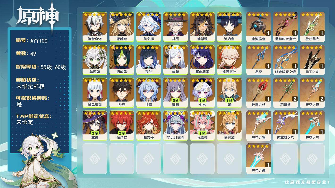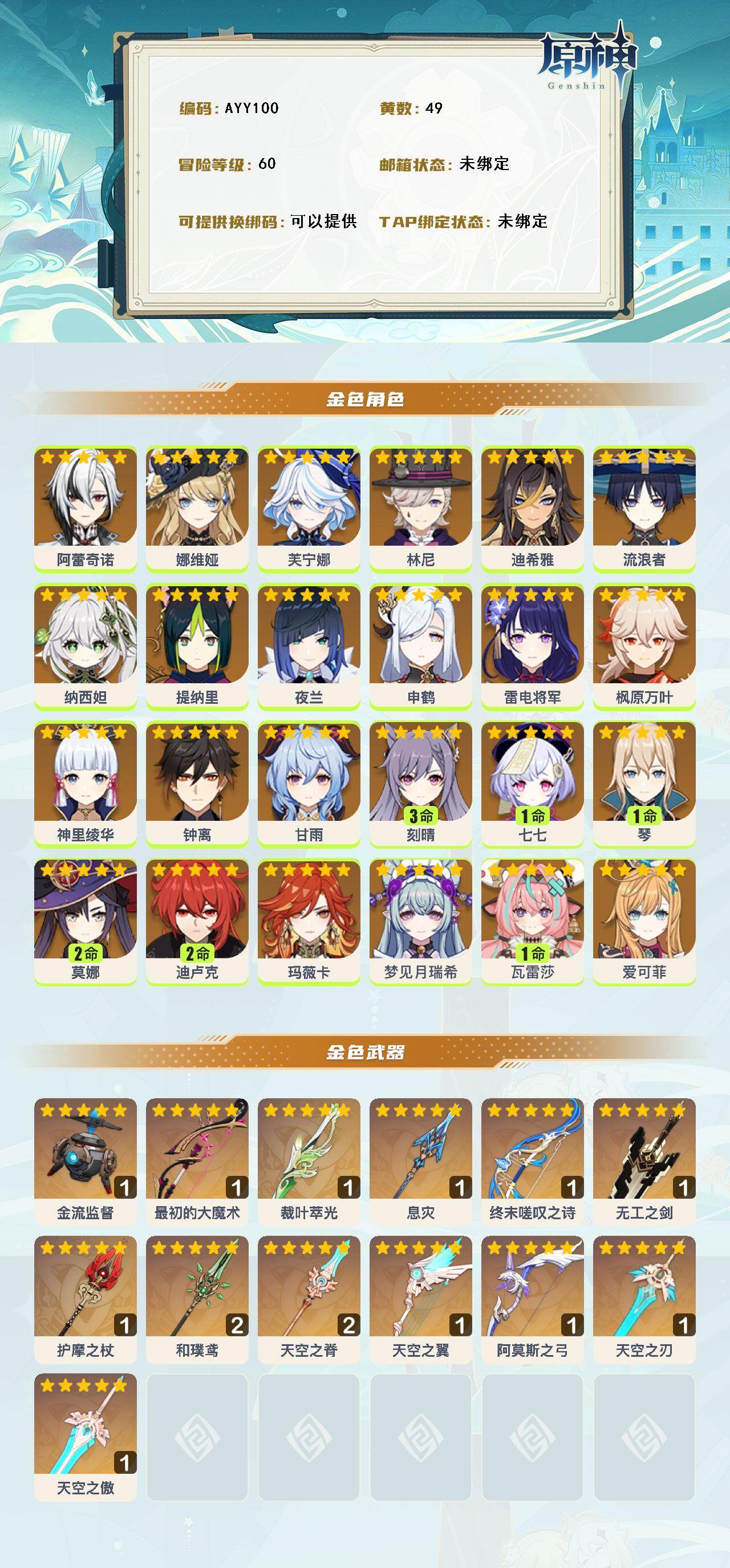 [14835479]60级/49黄/女主/24个五星角色/13个五星武器 0命阿蕾奇诺,0命娜维娅,0命芙宁娜,0命林尼,0命迪希雅,0命流浪者,0命纳西妲,0命提纳里,0命夜兰,0命申鹤,0命雷电将军,0命枫原万叶,0命神里绫华,0命钟离,0命甘雨,3命刻晴,1命七七,1命琴,2命莫娜,2命迪卢克,0命玛薇卡,0命梦见月瑞希,1命瓦雷莎,0命爱可菲,精1金流监督,精1最初的大魔术,精1裁叶萃光,精1息灾,精1终末嗟叹之诗,精1无工之剑,精1护摩之杖,精2和璞鸢,精2天空之脊,精1天空之翼,精1阿莫斯之弓,精1天空之刃,精1天空之傲