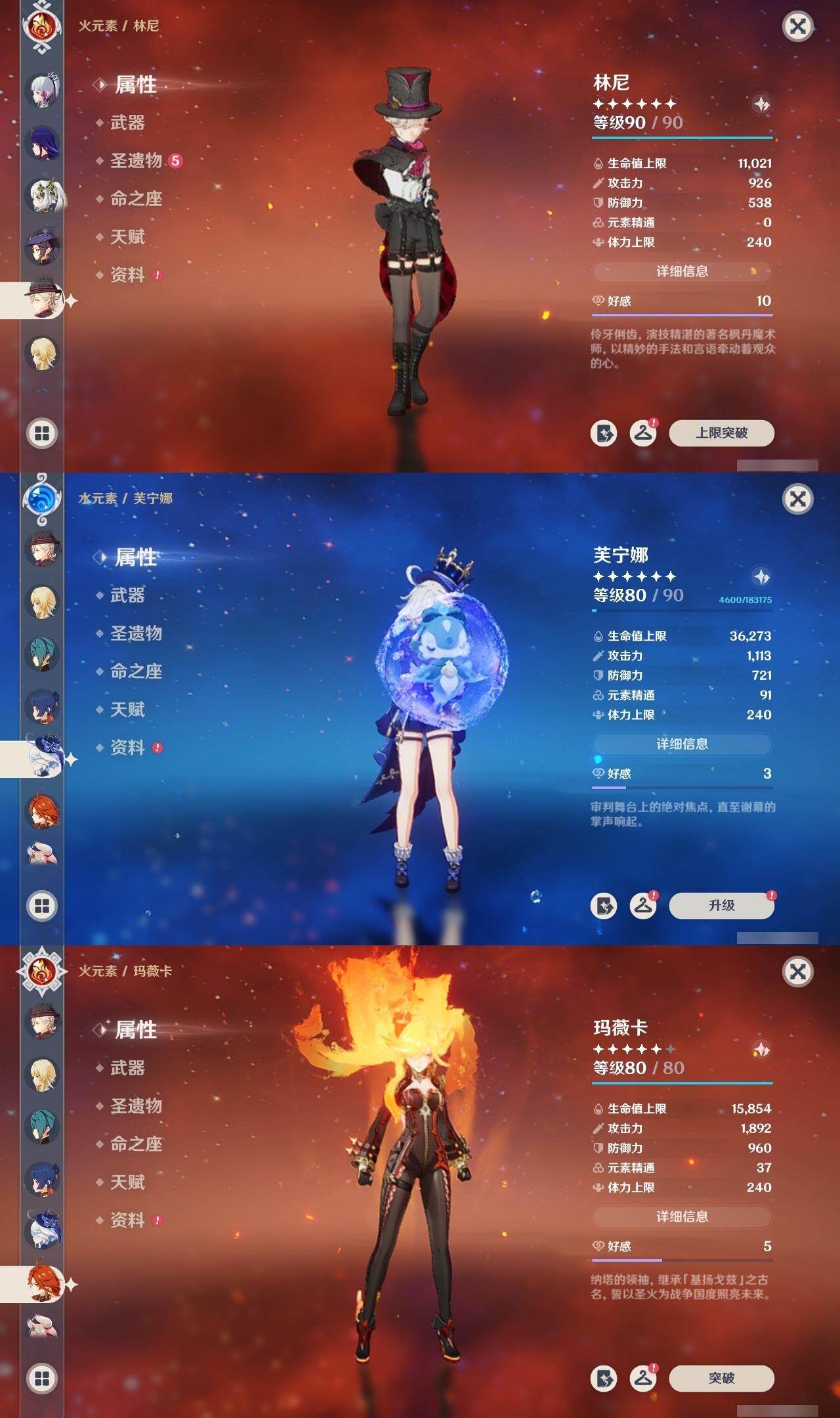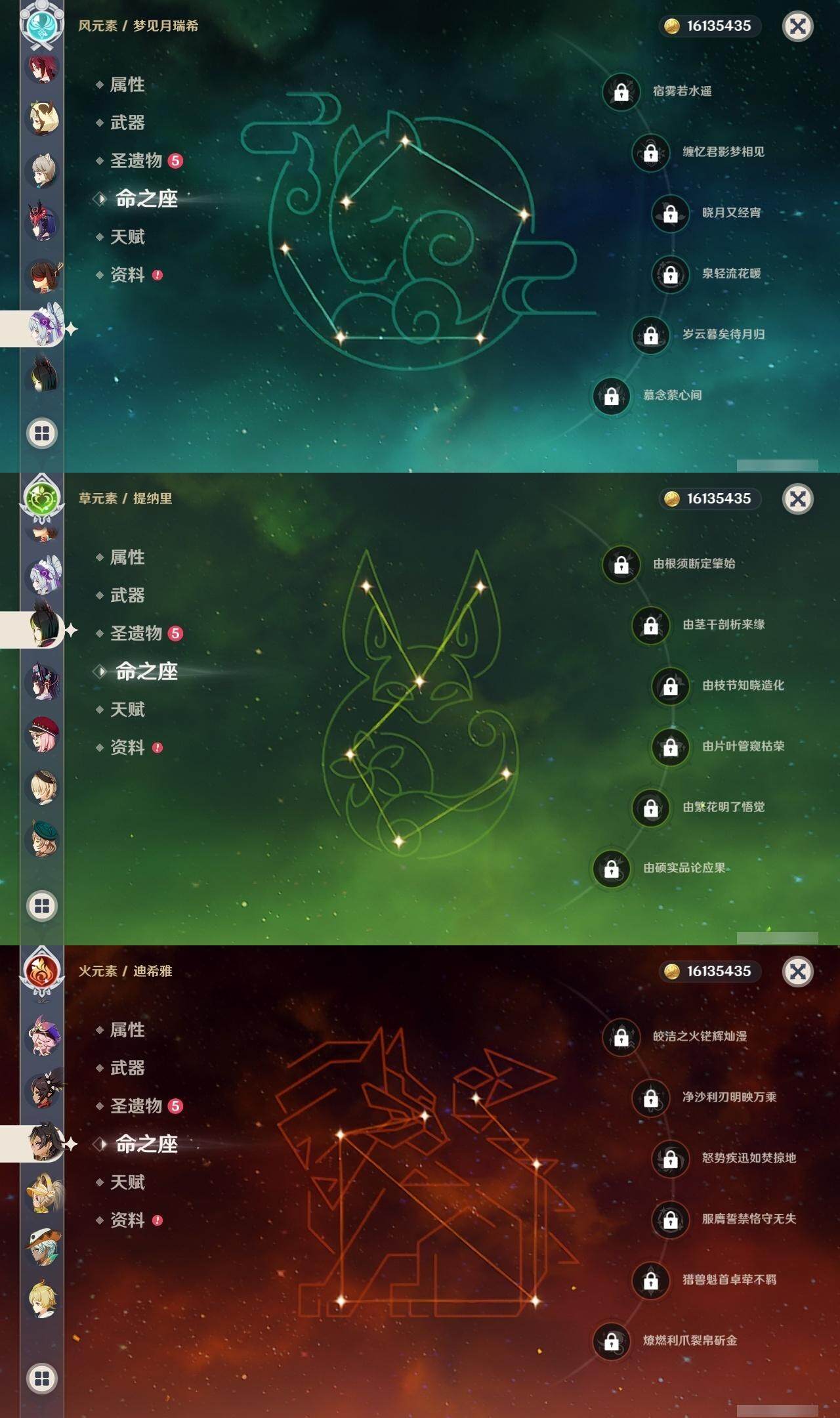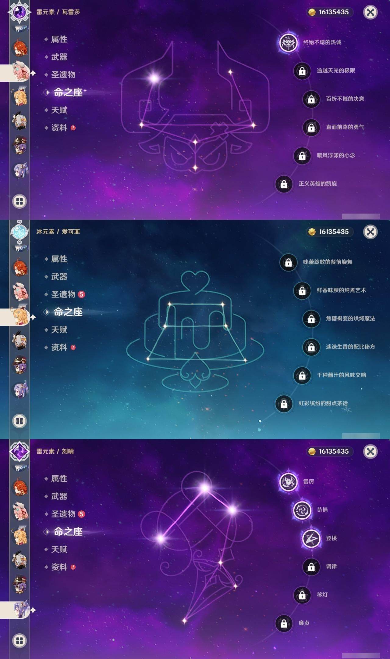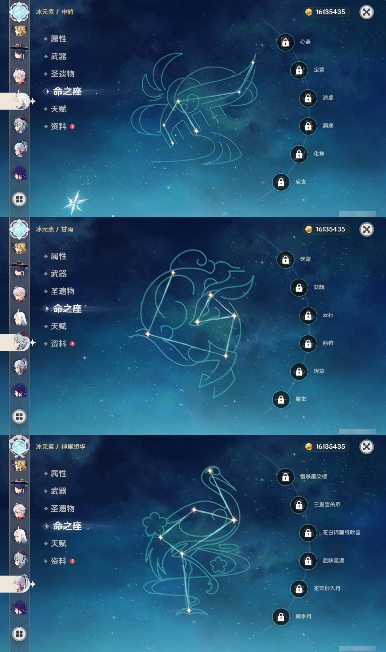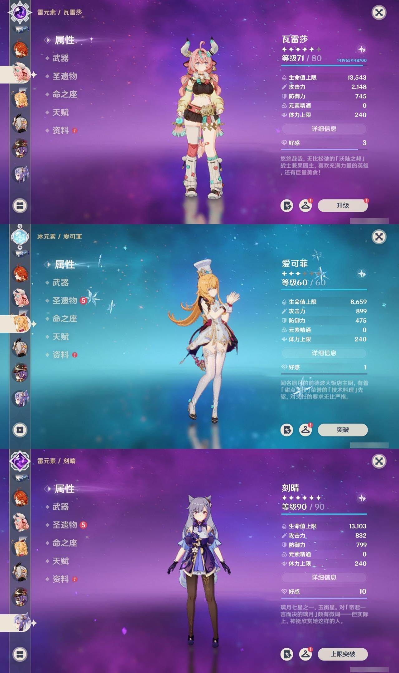 0命阿蕾奇诺,0命娜维娅,0命芙宁娜,0命林尼,0命迪希雅,0命流浪者,0命纳西妲,0命提纳里,0命夜兰,0命申鹤,0命雷电将军,0命枫原万叶,0命神里绫华,0命钟离,0命甘雨,3命刻晴,1命七七,1命琴,2命莫娜,2命迪卢克,0命玛薇卡,0命梦见月瑞希,1命瓦雷莎,0命爱可菲,精1金流监督,精1最初的大魔术,精1裁叶萃光,精1息灾,精1终末嗟叹之诗,精1无工之剑,精1护摩之杖,精2和璞鸢,精2天空之脊,精1天空之翼,精1阿莫斯之弓,精1天空之刃,精1天空之傲