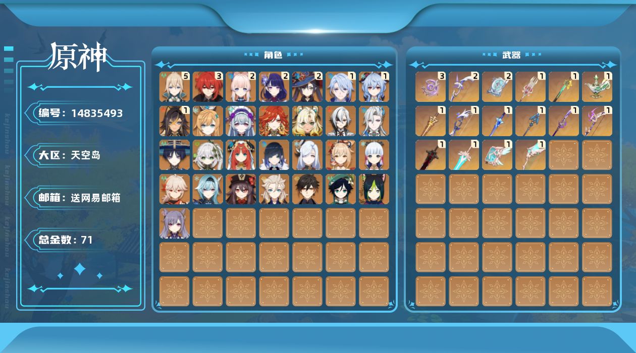 [14835493]60级/71黄/男主/31个五星角色/19个五星武器