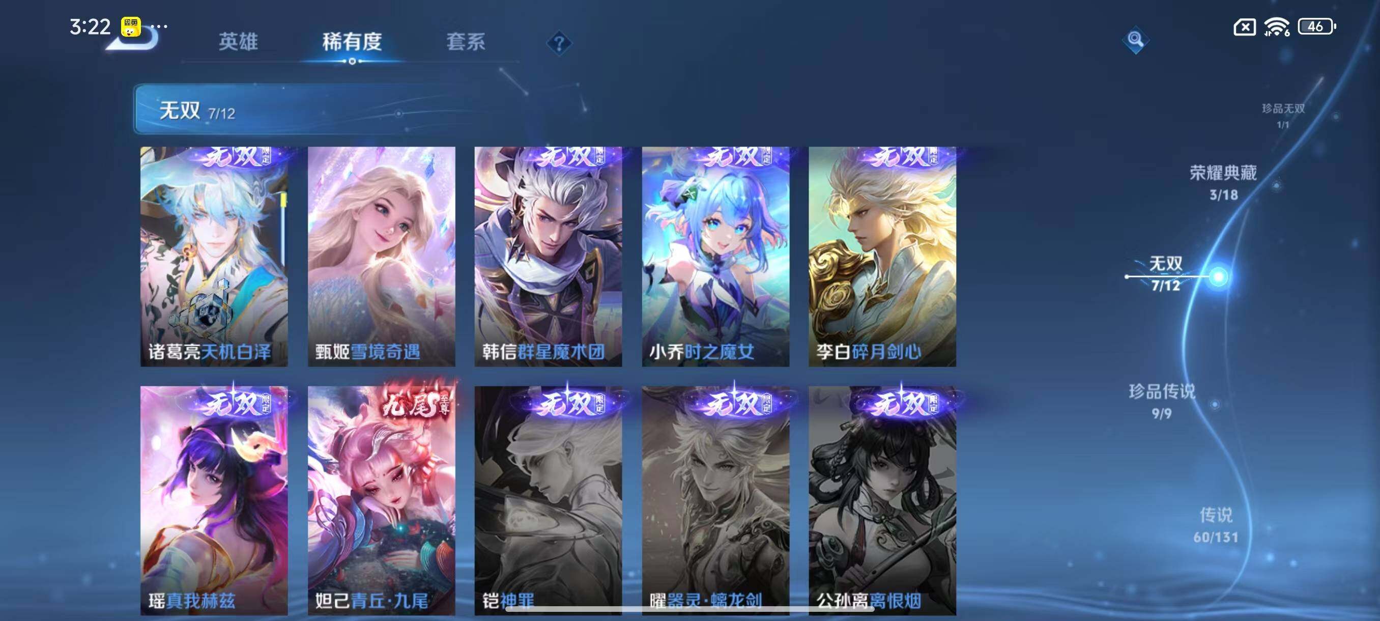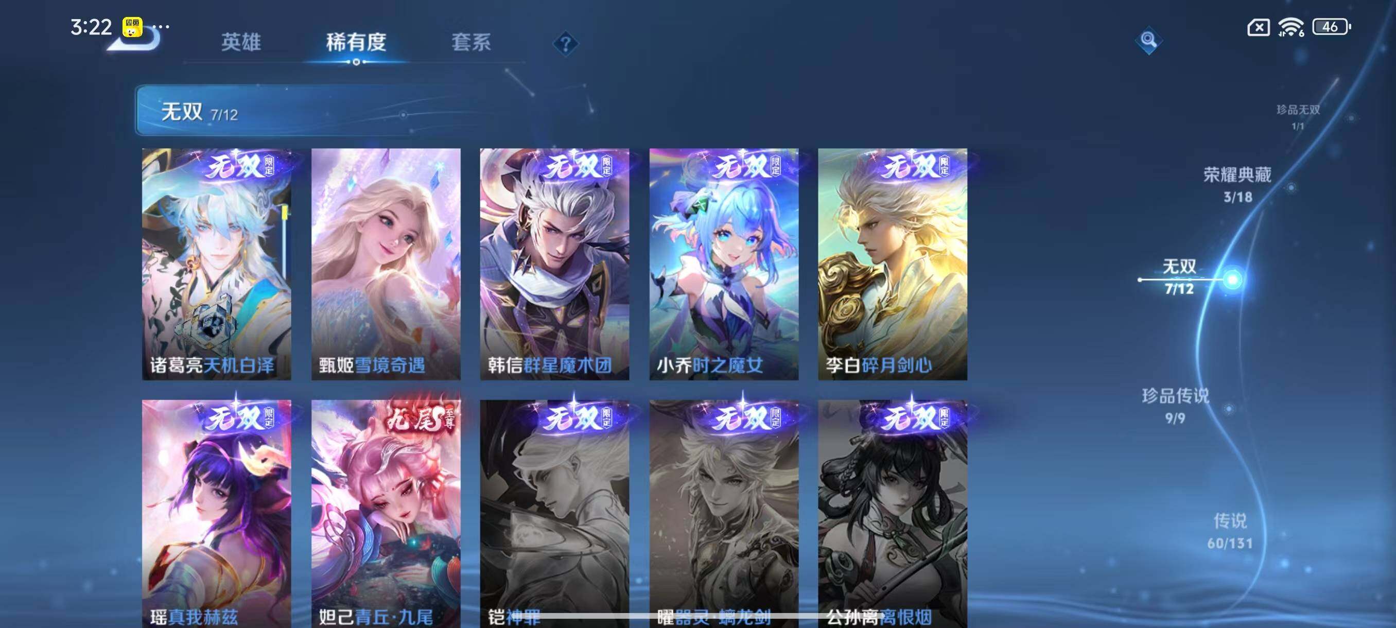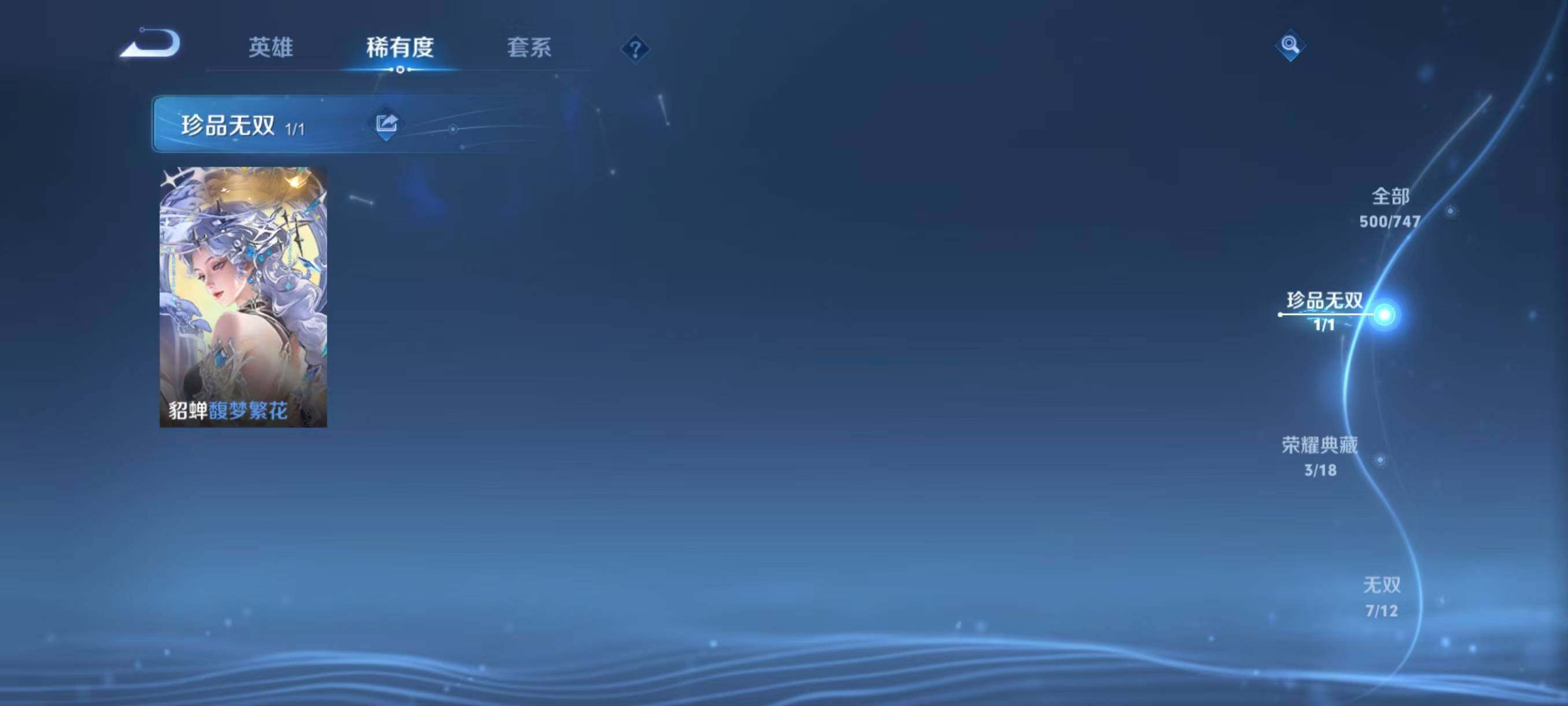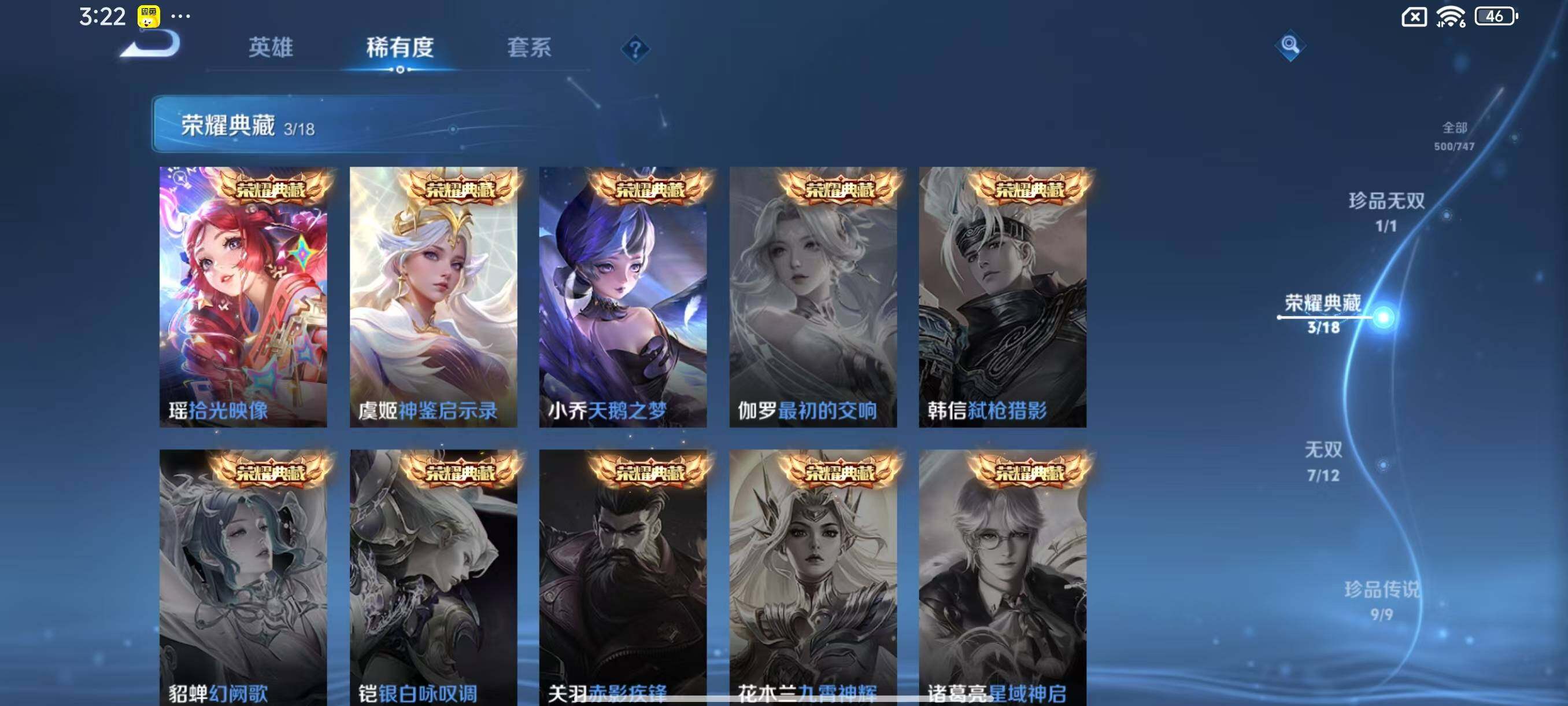 [14844339]安卓Q-V11-500皮肤-3典藏皮肤-1典藏英雄-1珍品无双-7无双-9珍品传说-60传说-155史诗