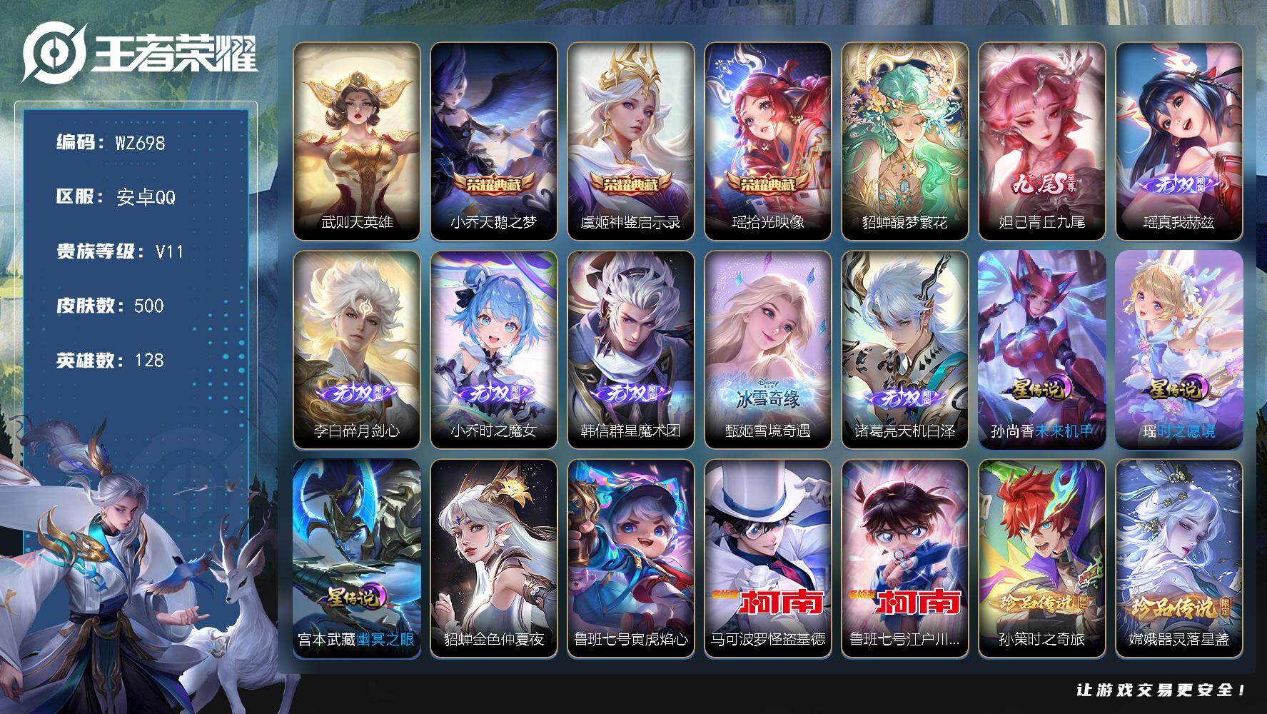 [14844339]安卓Q-V11-500皮肤-3典藏皮肤-1典藏英雄-1珍品无双-7无双-9珍品传说-60传说-155史诗 【英雄全皮】:刘禅全皮,元歌全皮,孙权全皮,艾琳全皮,朵莉亚全皮,鬼谷子全皮,大乔全皮,瑶全皮,嫦娥全皮,大司命全皮,西施全皮,蒙恬全皮,桑启全皮,司空震全皮,云缨全皮,暃全皮,赵怀真全皮,戈娅全皮,空空儿全皮,影全皮,少司缘全皮 【荣耀典藏】:武则天英雄,小乔天鹅之梦,虞姬神鉴启示录,瑶拾光映像 【珍品无双】:貂蝉馥梦繁花 【无双皮肤】:妲己青丘九尾,瑶真我赫兹,李白碎月剑心,小乔时之魔女,韩信群星魔术团,甄姬雪境奇遇,诸葛亮天机白泽 【珍品传说】:马可波罗怪盗基德,鲁班七号江户川柯南,孙策时之奇旅,嫦娥器灵落星盏,张飞兔狲蓬尾,瑶大耳狗之梦,安琪拉酷洛米之心,暃朽木白哉,宫本武藏黑崎一护 【传说皮肤】:杨戬纵目迁山,后羿神树通天,干将莫邪千山共赴,元歌诡秘之主,大司命死亡执政官,司马懿九山相柳,西施续相思,后羿千劫归真,司空震愿照山河定,女娲愿照千秋盛,妲己愿照众生和,澜愿照九州拓,蔡文姬愿照福禄聚,虞姬愿照岁时盈,云缨幻光神枪,王昭君映山客,桑启鸣野蒿,朵莉亚心动手记,亚连落雪白狼,貂蝉曦玄引,孙尚香乘龙问璇玑,孙策乘龙淬吴钩,赵云乘龙铭钟鼎,澜逐花归海,艾琳觅芳踪,露娜霜月吟,孙膑小动物乐团,大乔时之奇旅,云缨鹤归松栖,马可波罗妄想实况,安琪拉追逃游戏,花木兰燃星之曲,伽罗炽翼辉光,小乔山海琳琅生,百里守约碎云,马可波罗深海之息,大乔挚爱花嫁,露娜启示之音,蔡文姬花朝如约,瑶时之祈愿,裴擒虎寅虎赤拳,鲁班七号寅虎瑞焰,王昭君乞巧织情,西施游龙清影,小乔音你心动,李元芳飞鸢探春,公孙离祈雪灵祝,镜炽阳神光,虞姬启明星使,貂蝉猫影幻舞,干将莫邪久胜战神,达摩黄金狮子座,花木兰冠军飞将,梦奇胖达荣荣,后羿黄金射手座,杨戬永曜之星,貂蝉仲夏夜之梦,孙尚香末日机甲,宫本武藏地狱之眼,武则天海洋之心 【限定皮肤】:暃埋骨钱,蔡文姬夏日便利店,大乔绒语心约,虞姬夏日便利店,姜子牙天穹之誓,狄仁杰阴阳师,廉颇寅虎御盾,小乔山海琳琅生,赵云皇家上将,墨子降魔,妲己时之彼端,妲己时之奇旅,孙尚香蔷薇恋人,鲁班七号狮舞东方,鲁班七号寅虎瑞焰,庄周高山流水,钟无艳超时空战士,孙膑寅虎展翼,扁鹊奇幻香踪,白起夜都怪侠,芈月白晶晶,芈月幻夜卜梦,吕布猎兽之王,元歌云间偶戏,元歌无