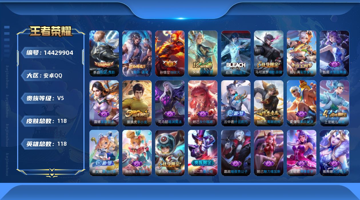[14429904]【店主推荐捡漏号!可直接换绑】安卓Q-V5-最强王者段位-118英雄-118皮肤-1典藏皮肤-1珍品传说-2传说-22史诗 【荣耀典藏】:李白鸣剑曳影 【珍品传说】:张飞兔狲蓬尾 【传说皮肤】:后羿神树通天,孙悟空地狱火 【限定皮肤】:白起狰,狄仁杰阴阳师,赵云皇家上将,芈月重明,曹操烛龙,典韦穷奇,马可波罗暗影游猎,狄仁杰魔术师,狄仁杰万华元夜,项羽海滩派对,老夫子醍醐杖,程咬金演武夺筹,牛魔御旌,李元芳银河之约,蔡文姬繁星吟游,太乙真人饕餮,鬼谷子原初探秘者,弈星混沌棋,沈梦溪星空之诺,明世隐疑决卦,裴擒虎李小龙,狂铁御狮,米莱狄御霄,云中君纤云弄巧,盾山御銮,猪八戒西部大镖客,上官婉儿梁祝,张良古海寻踪,姬小满妄想食味 【赛季限定】:白起狰,芈月重明,曹操烛龙,典韦穷奇,狄仁杰万华元夜,老夫子醍醐杖,程咬金演武夺筹,张良古海寻踪,牛魔御旌,太乙真人饕餮,鬼谷子原初探秘者,弈星混沌棋,明世隐疑决卦,狂铁御狮,米莱狄御霄,盾山御銮 【战令限定】:马可波罗暗影游猎,李元芳银河之约,沈梦溪星空之诺,猪八戒西部大镖客 【史诗皮肤】:露娜紫霞仙子,赵云皇家上将,甄姬冰雪圆舞曲,王昭君偶像歌手,狄仁杰魔术师,孙尚香水果甜心,嬴政暗夜贵公子,妲己魅力维加斯,妲己女仆咖啡,夏侯惇乘风破浪,雅典娜冰冠公主,狄仁杰鹰眼统帅,上官婉儿梁祝,蔡文姬繁星吟游,李元芳银河之约,马可波罗暗影游猎,裴擒虎李小龙,云中君纤云弄巧,司马懿暗渊魔法,姬小满妄想食味,后羿石田雨龙,女娲万灵启世 【其他皮肤】:项羽海滩派对,韩信教廷特使,韩信街头霸王,露娜哥特玫瑰,达摩大发明家,赵云忍炎影,白起白色死神,扁鹊化身博士,安琪拉玩偶对对碰,妲己少女阿狸,典韦黄金武士,亚瑟死亡骑士,达摩拳王,花木兰兔女郎,甄姬花好人间,宫本武藏万象初新,后羿阿尔法小队,狄仁杰阴阳师,刘备纽约教父,关羽龙腾万里,白起狰,钟无艳海滩丽影,太乙真人饕餮,宫本武藏霸王丸,曹操烛龙,芈月重明,狂铁命运角斗场,老夫子功夫老勺,典韦穷奇,诸葛亮掌控之力,李白敏锐之力,鬼谷子幻乐之宴,狂铁御狮,苏烈坚韧之力,项羽科学大爆炸,米莱狄御霄,明世隐虹云星官,牛魔御旌,小乔丁香结,盾山御銮,沈梦溪鲨炮海盗猫,姜子牙炽热元素使,沈梦溪星空之诺,弈星混沌棋,哪吒次元突破,鲁班七号黑桃队长,明世隐疑决卦,盾山圆桌骑士,老夫子醍醐杖,猪八戒西部大镖客,廉