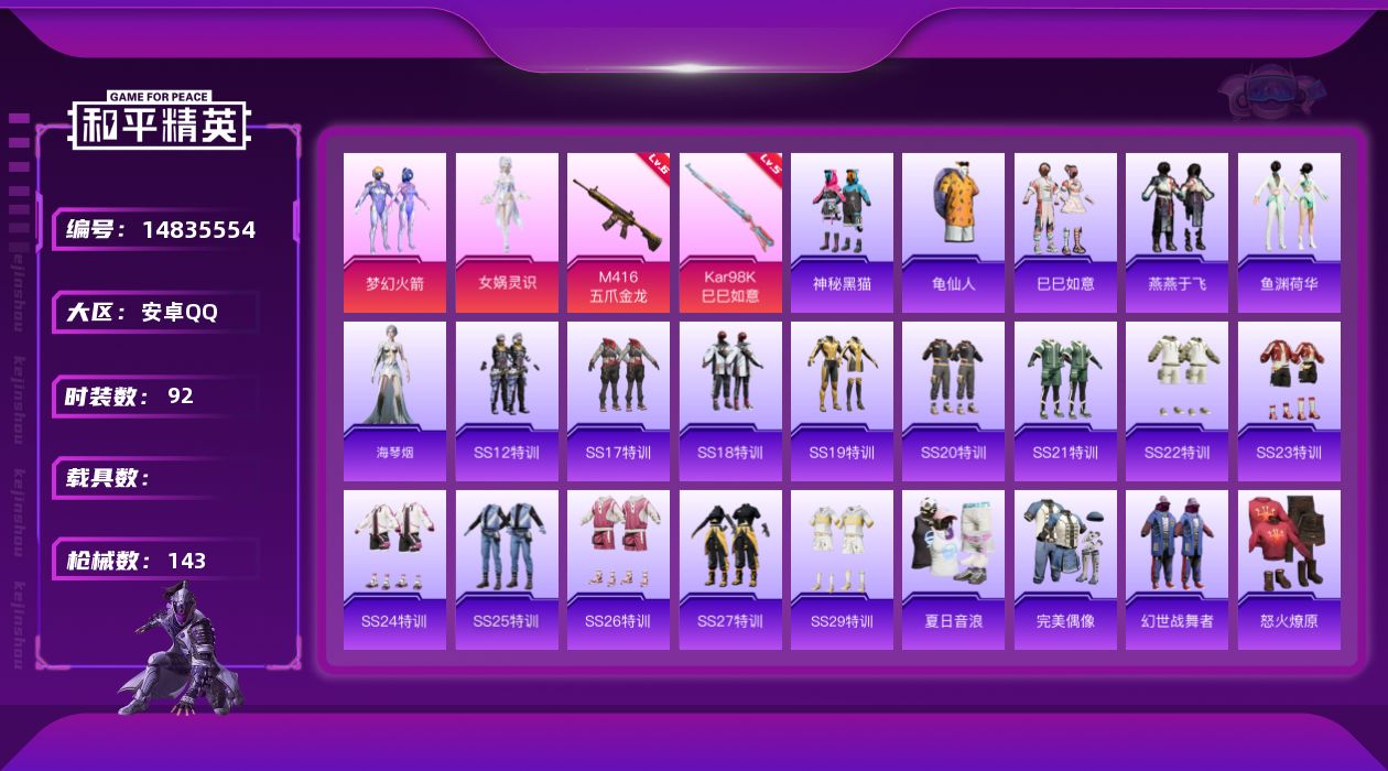 [14835554]【店主推荐捡漏号!可直接换绑】 安卓 手Q-2粉装-2特效枪-1粉色飞行器-4.1w热力值-7王牌印记-92套装-143枪皮【热门品类】:粉装-梦幻火箭,套装-龟仙人【粉色套装】:粉装-梦幻火箭,角色-女娲灵识【粉色枪皮等级】:M416-五爪金龙(六级),Kar98K-巳巳如意(五级)【粉色飞行器】:齐天大圣飞行器