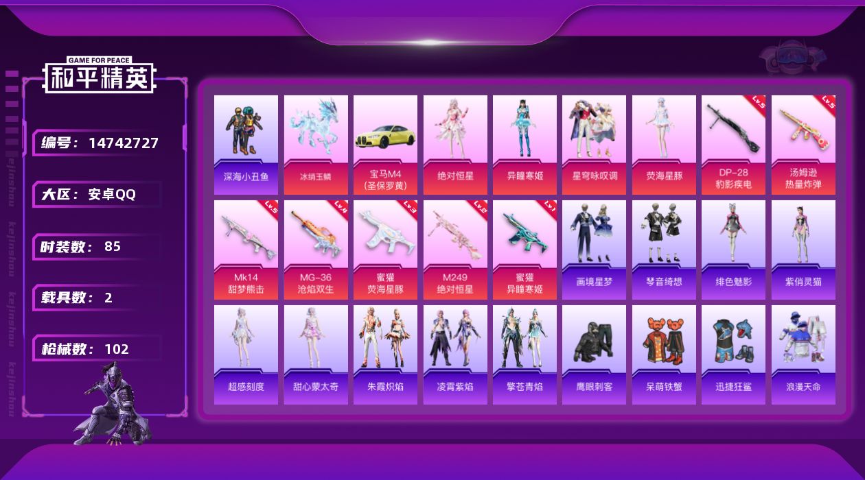 [14742727]【店主推荐捡漏号!可直接换绑】/绝世印记3 安卓 手Q-4粉装-7特效枪-2载具-3粉色飞行器-3.1w热力值-4王牌印记-85套装-102枪皮【热门品类】:套装-浪漫天命,套装-深海小丑鱼,套装-小丑鱼,套装-暗影哥特,套装-红熊茄茄【粉色载具】:宝马M4(圣保罗黄),冰绡玉鳞【粉色套装】:角色-绝对恒星,粉装-星穹咏叹调,角色-荧海星豚,角色-异瞳寒姬【粉色枪皮等级】:蜜獾-荧海星豚(三级),蜜獾-异瞳寒姬(一级),汤姆逊-热量炸弹(五级),Mk14-甜梦熊击(五级),M249-绝对恒星(二级),DP-28-豹影疾电(五级),MG-36-沧焰双生(四级)【粉色飞行器】:绝对恒星飞行器,灵珠游龙飞行器