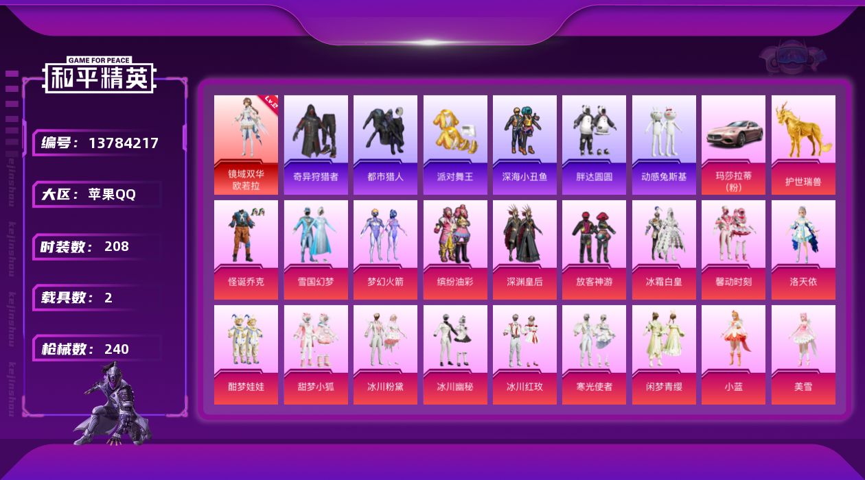 [13784217]苹果 手Q-1神装-23粉装-12特效枪-2载具-9粉色飞行器-94442热力值-14王牌印记-208套装-240枪皮