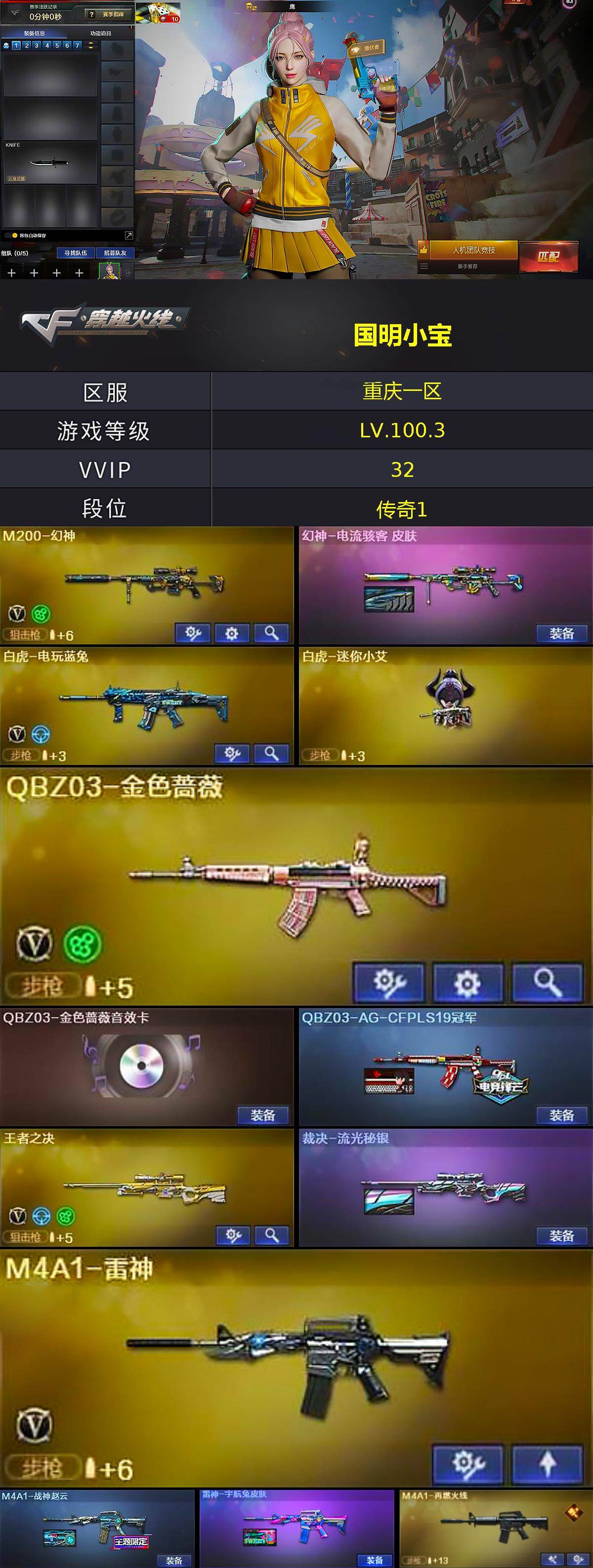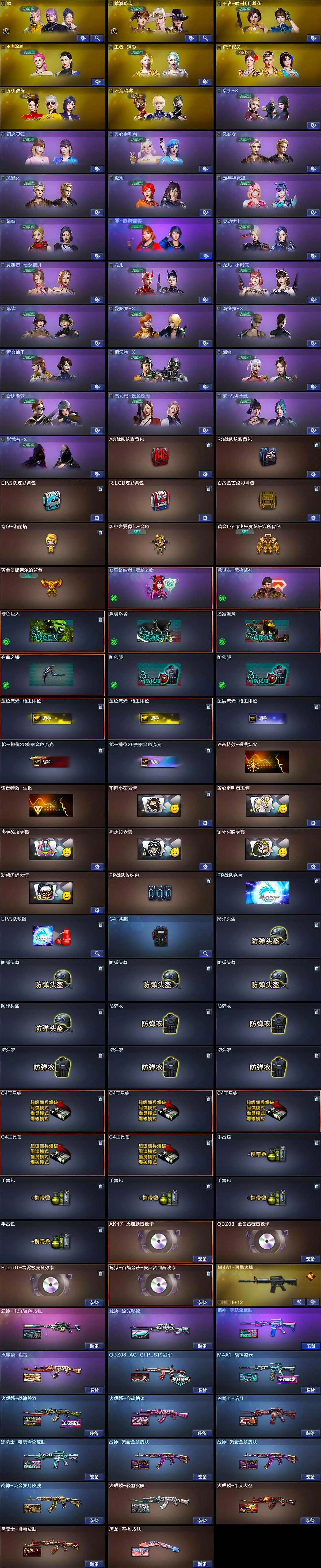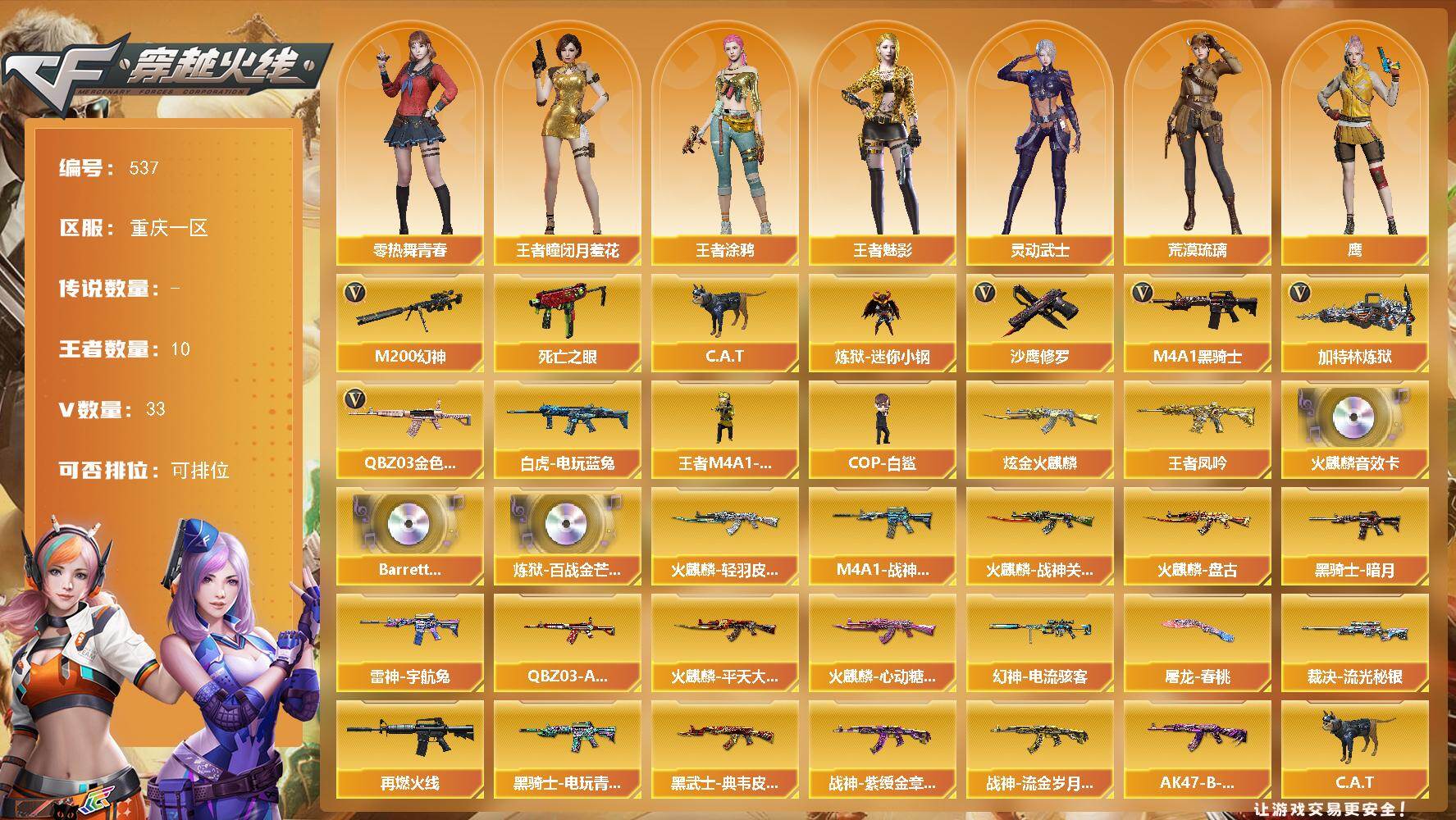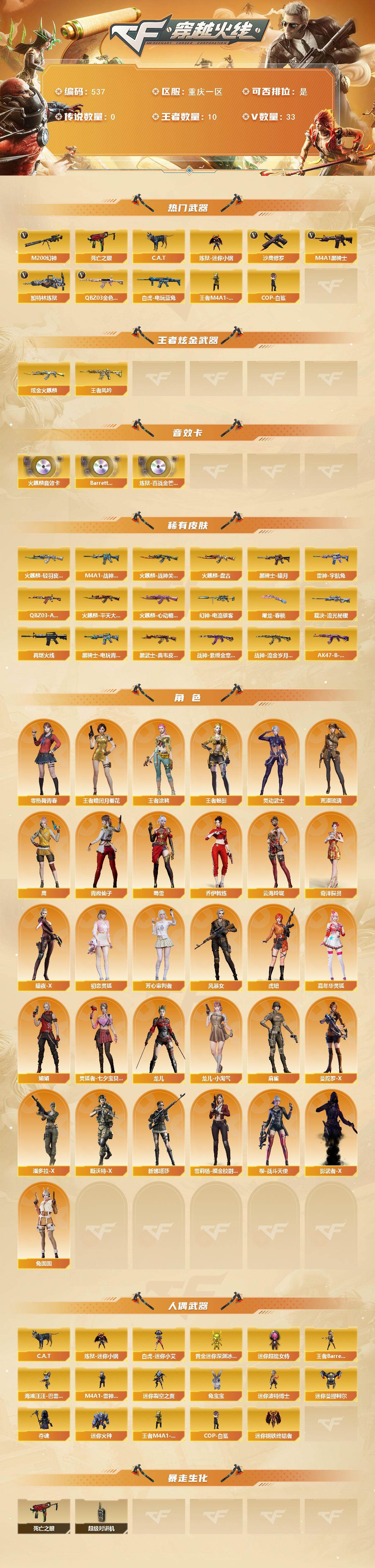 [14858656]重庆一区-33V-10王者-1炫金 【热门武器】:QBZ03-金色蔷薇,M200-幻神,死亡之眼,白虎-电玩蓝兔,C.A.T,炼狱-迷你小钢,M4A1-黑骑士,加特林-炼狱,王者M4A1-萌萌金发刀锋,COP-白鲨*2,沙鹰-修罗*3 【王者炫金武器】:王者凤吟,炫金火麒麟 【音效卡】:AK47-火麒麟音效卡,Barrett-碧霄极光音效卡,炼狱-百战金芒-庆典舞曲音效卡 【皮肤】:幻神-电流骇客 皮肤,QBZ03-AG-CFPLS19冠军,裁决-流光秘银,M4A1-战神赵云,雷神-宇航兔皮肤,M4A1-再燃火线,火麒麟-轻羽皮肤,火麒麟-战神关羽,火麒麟-平天大圣,火麒麟-盘古,火麒麟-心动糖果,黑骑士-暗月,黑骑士-电玩青兔皮肤,黑武士-典韦皮肤,战神-紫绶金章皮肤*2,战神-流金岁月皮肤,AK47-B-常胜将军-曹操,屠龙-春桃 皮肤 【角色】:鹰,荒漠琉璃,王者-瞳-闭月羞花,王者涂鸦,王者-魅影,奇洋探员,乔伊教练,云海玲珑,暗夜-X,初恋灵狐,芳心审判者,风暴女*2,虎妞,嘉年华灵狐,娟娟,零-热舞青春,灵动武士,灵狐者-七夕宝贝,龙儿,龙儿-小淘气,麻雀,曼陀罗-X,潘多拉-X,青霞仙子,斯沃特-X,蜀雪,兔囡囡,新娜塔莎,雪莉杨-摸金校尉,樱-战斗天使,影武者-X 【人偶武器】:COP-白鲨*2,王者M4A1-萌萌金发刀锋,白虎-迷你小艾,王者Barrett-英勇金戈,M4A1-雷神-精英刀锋,炼狱-迷你小钢,迷你钢铁终结者,海滩汪汪-巴雷特,C.A.T,黄金迷你深渊冰龙,迷你裂空之翼,兔宝宝,迷你波特博士*3,迷你曼提柯尔,夺魂,迷你火种,迷你超能女侍 【暴走生化】:死亡之眼,超级对讲机 【挑战大师】:暴君乱世-超越Max,神圣爆裂者III,冰龙粉碎者-白马银枪,激光毁灭者III-白马银枪,VEPR-12-金魔,激光毁灭者III,机甲撕裂者III*2,试炼破坏者III*2,KAC-圣炎切割者III*2,神圣爆裂者-末日III,惩戒者III 【英雄级武器】:AK47-火麒麟,M4A1-雷神,M4A1-黑骑士,AK47-黑武士,AN94-超新星,AK47-机械迷城,无影-神兵利器,QBZ03-金色蔷薇,烈火-动感闪耀,王者之势-觉醒版,王者之圣-觉醒版,王者龙血-觉醒版,白虎-电玩蓝兔,Barrett-毁灭,M200-幻神,王者之决-觉醒版,王者蔷薇
