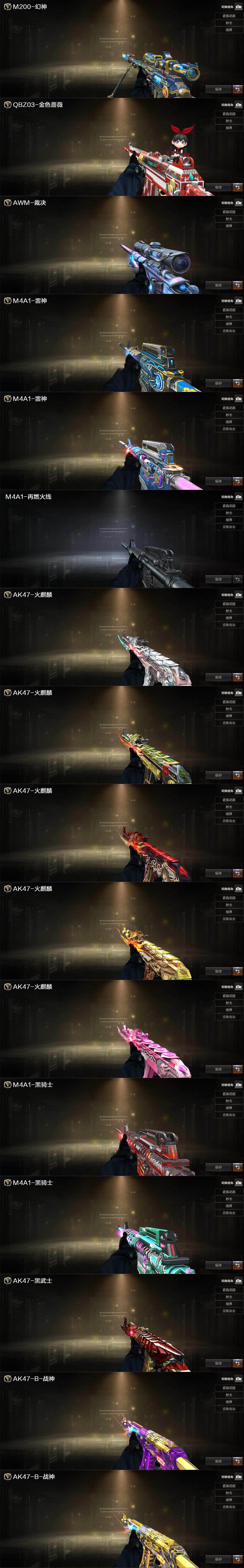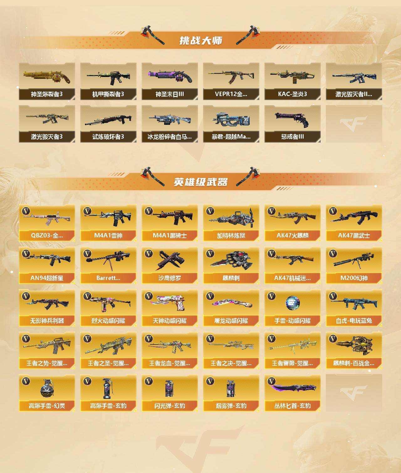 【英雄级武器】:AK47-火麒麟,M4A1-雷神,M4A1-黑骑士,AK47-黑武士,AN94-超新星,AK47-机械迷城,无影-神兵利器,QBZ03-金色蔷薇,烈火-动感闪耀,王者之势-觉醒版,王者之圣-觉醒版,王者龙血-觉醒版,白虎-电玩蓝兔,Barrett-毁灭,M200-幻神,王者之决-觉醒版,王者蔷薇