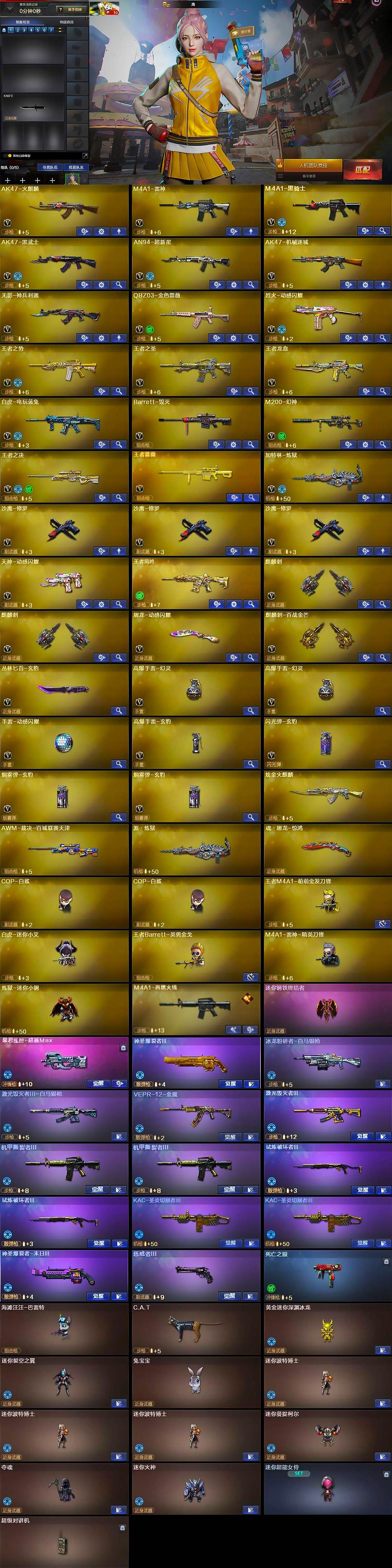 【人偶武器】:COP-白鲨*2,王者M4A1-萌萌金发刀锋,白虎-迷你小艾,王者Barrett-英勇金戈,M4A1-雷神-精英刀锋,炼狱-迷你小钢,迷你钢铁终结者,海滩汪汪-巴雷特,C.A.T,黄金迷你深渊冰龙,迷你裂空之翼,兔宝宝,迷你波特博士*3,迷你曼提柯尔,夺魂,迷你火种,迷你超能女侍