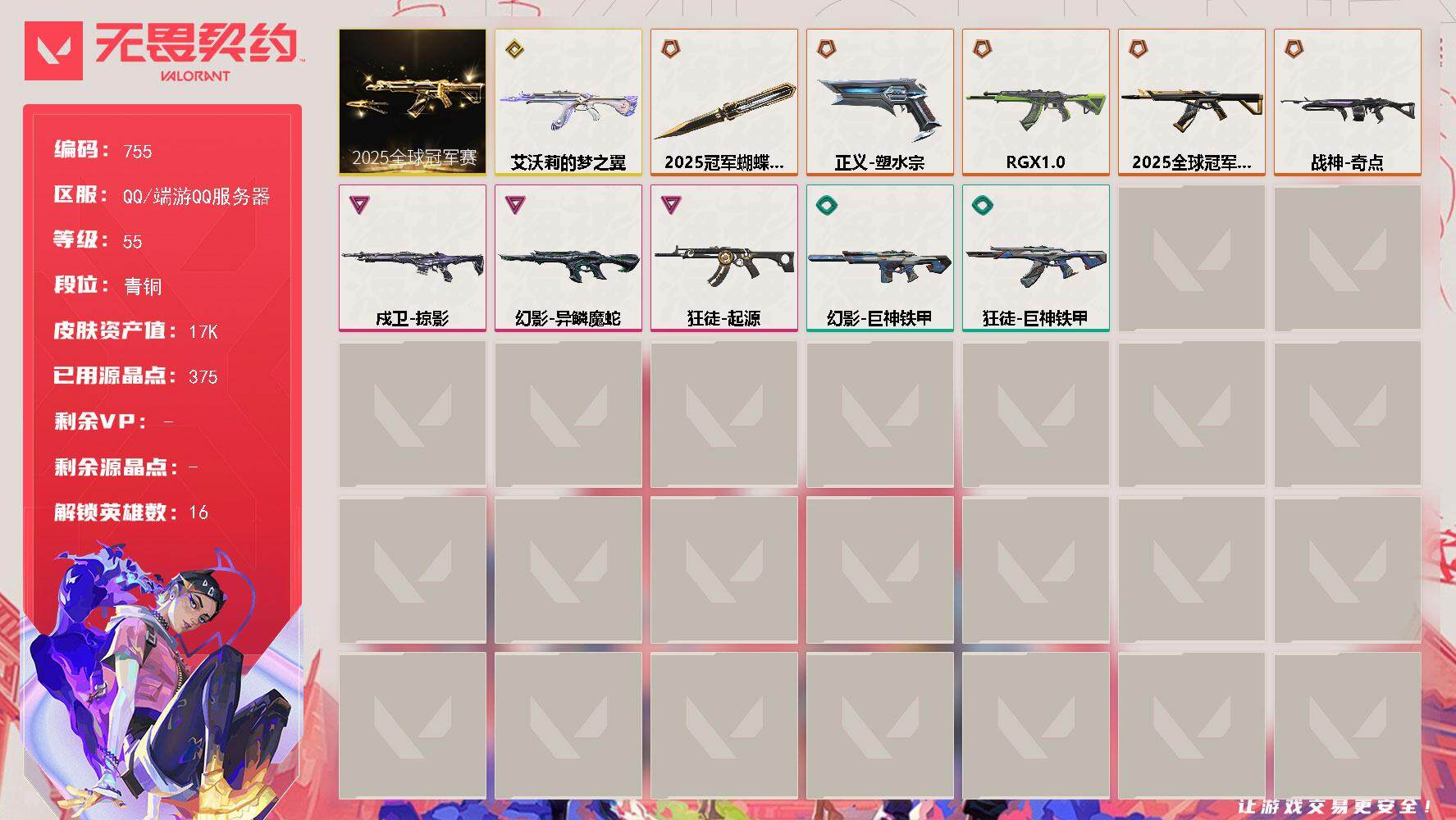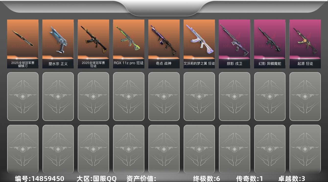 [14859450]【套装】:2025全球冠军赛套装 【英雄】:炼狱,暮蝶,壹决,捷风,雷兹,不死鸟,贤者,猎枭,零,芮娜,奇乐,尚勃勒,霓虹,夜露,K/O,盖可 【近战武器】:近战武器-2025全球冠军赛 蝴蝶刀 【狂徒】:狂徒-艾沃莉的梦之翼,狂徒-2025全球冠军赛,狂徒-RGX 11z Pro,狂徒-起源,狂徒-巨神铁甲 【幻影】:幻影-异鳞魔蛇,幻影-巨神铁甲 【戍卫】:戍卫-掠影 【战神】:战神-奇点 【正义】:正义-塑水宗 【卡面】:无畏契约GO!第一卷:零 卡面,代号红色 卡面,新兵报到 卡面,V契约 卡面,无畏契约 卡面 【喷漆】:买装还是存钱 喷漆,胜利属于无畏契约 喷漆,GLHF 喷漆,无畏契约 喷漆 【挂饰】:天外飞客 挂饰,无畏契约 纪念币 挂饰