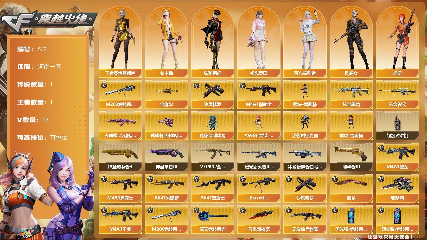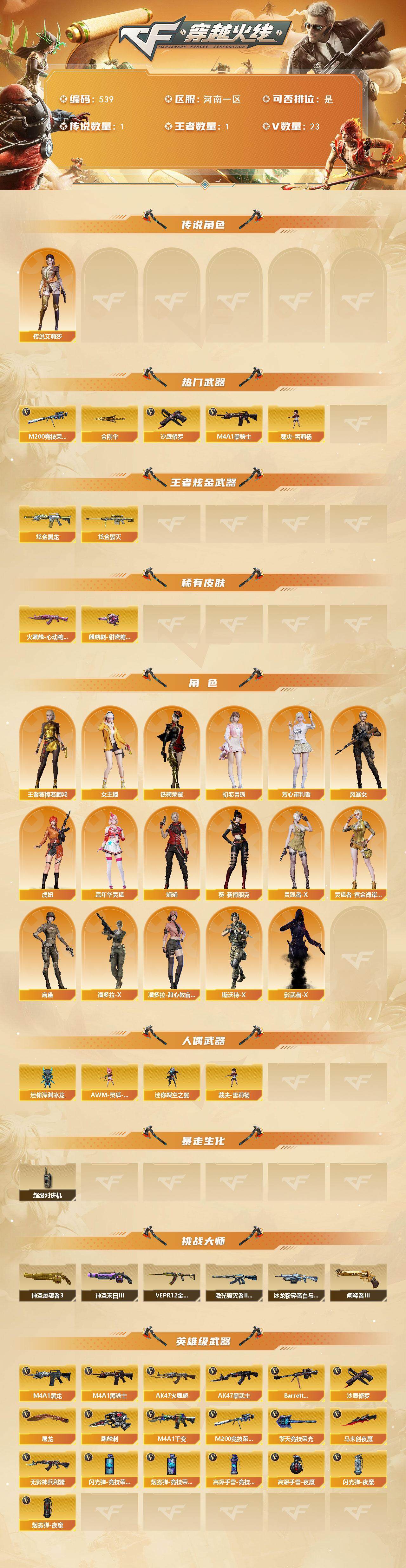 [14859864]河南一区-23V-1王者-2炫金 【传说角色】:传说艾莉莎 【热门武器】:M200-竞技荣光,M4A1-黑骑士,裁决-雪莉杨,沙鹰-修罗,金刚伞 【王者炫金武器】:炫金黑龙,炫金毁灭 【皮肤】:火麒麟-心动糖果,麒麟刺-甜蜜糖果 皮肤 【角色】:王者葵-惊若翩鸿,初恋灵狐,芳心审判者,风暴女,虎妞,嘉年华灵狐,娟娟,葵-赛博朋克,灵狐者-X,灵狐者-黄金海岸,麻雀,女主播,潘多拉-X,潘多拉-甜心教官,斯沃特-X,铁骑荣耀,影武者-X 【人偶武器】:裁决-雪莉杨,AWM-灵狐-15周年嘉年华,迷你深渊冰龙,迷你裂空之翼*4 【暴走生化】:超级对讲机 【挑战大师】:神圣爆裂者III*2,冰龙粉碎者-白马银枪*2,激光毁灭者III-白马银枪,VEPR-12-金魔,神圣爆裂者-末日III*2,阐释者III 【英雄级武器】:M4A1-千变,AK47-火麒麟,M4A1-黑龙,M4A1-黑骑士,AK47-黑武士,无影-神兵利器,Barrett-毁灭*2,M200-竞技荣光,沙鹰-修罗,屠龙,马来剑-夜魔,麒麟刺,擎天-竞技荣光,高爆手雷-夜魔,高爆手雷-竞技荣光,闪光弹-夜魔,闪光弹-竞技荣光*2,烟雾弹-夜魔,烟雾弹-竞技荣光 【道具】:亚洲杯纪念炫彩背包,绿色巨人,灵魂忍者,迷雾幽灵,夺命之镰,防化服*2,金色流光-枪王排位,枪王排位29赛季金色流光,电玩兔兔表情,炽雪表情,云海游龙表情,EP战队名片,防弹头盔*5,防弹衣*5,C4工具钳*4,手雷包*5 【特殊枪械】:1黑骑士