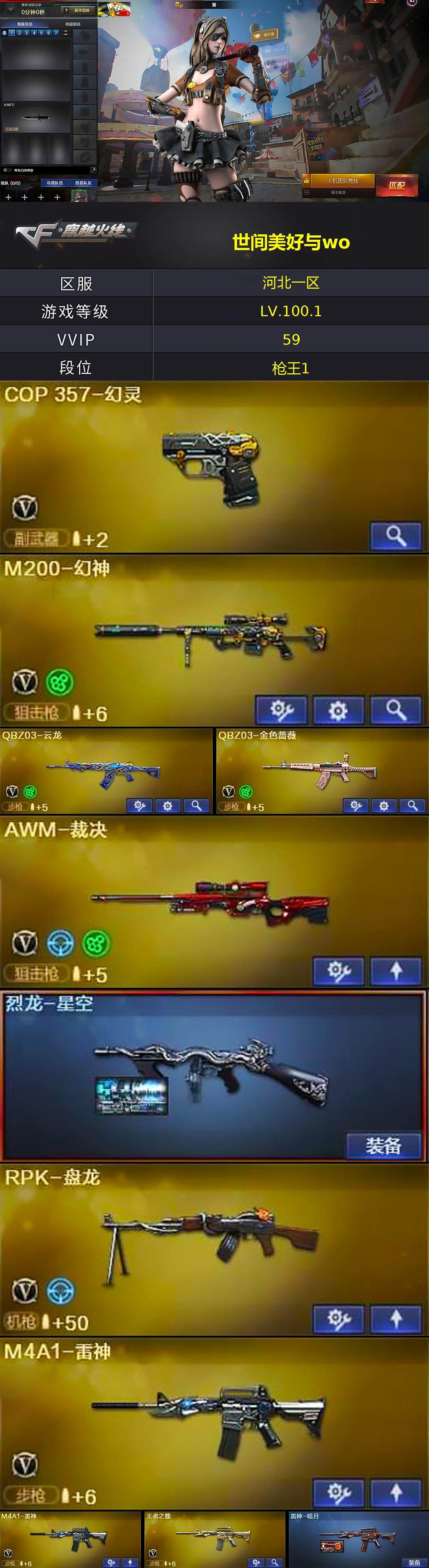【皮肤】:烈龙-星空,雷神-暗月,火麒麟-百城,毁灭-星空,战神-粉色甜心皮肤,战神-紫绶金章皮肤,天龙-能量核心,AWM-天龙-传奇白鲨,修罗-能量核心,屠龙-春桃 皮肤