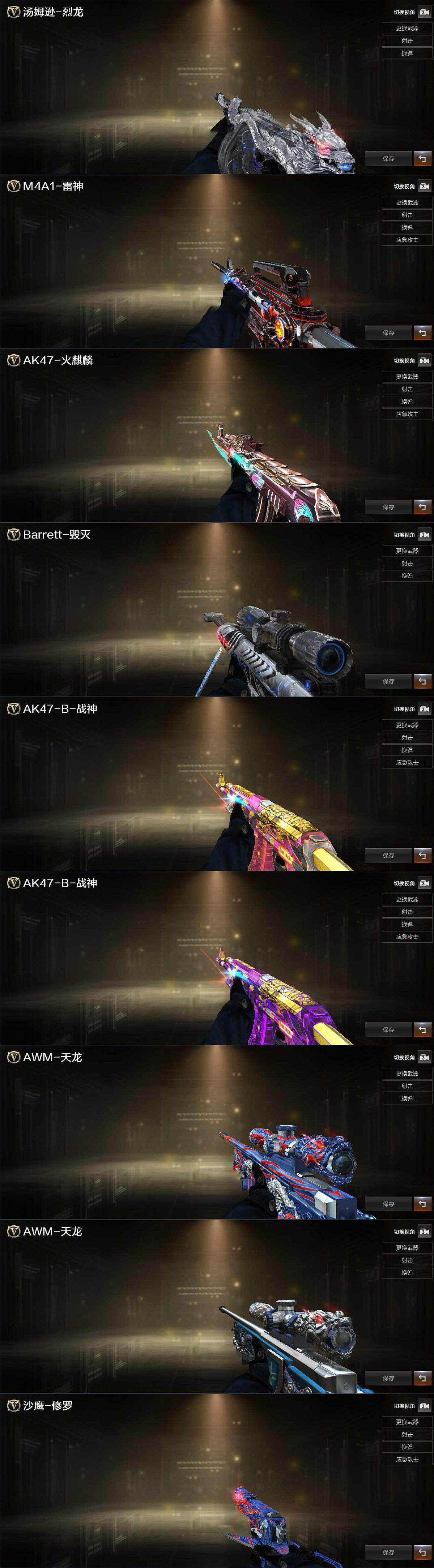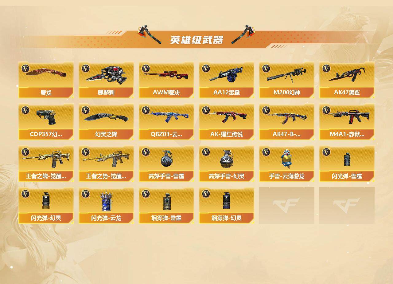 【英雄级武器】:AK47-火麒麟*2,M4A1-雷神*2,M4A1-黑骑士,AK47-无影,AK47-黑武士,AK12-天启,AK47-黑鲨,HK417-朱雀,QBZ03-云龙,M4A1-玫瑰精灵,QBZ03-金色蔷薇,王者之魄-觉醒版,王者之势-觉醒版,AK-47-猩红传说,AK47-B-战神,AWM-天龙,Barrett-毁灭*2,Barrett-极光,AWM-裁决,M200-幻神,RPK-盘龙,加特林-炼狱,AA-12-雷霆,沙鹰-修罗*3,沙鹰-天神*2,COP 357-幻灵,屠龙,龙啸,擎天*2,麒麟刺*2,幻灵之锋,高爆手雷-雷霆,高爆手雷-幻灵*2,手雷-云海游龙,闪光弹-雷霆,闪光弹-幻灵*2,闪光弹-云龙,烟雾弹-雷霆,烟雾弹-幻灵*2,M4A1-赤狱骑士