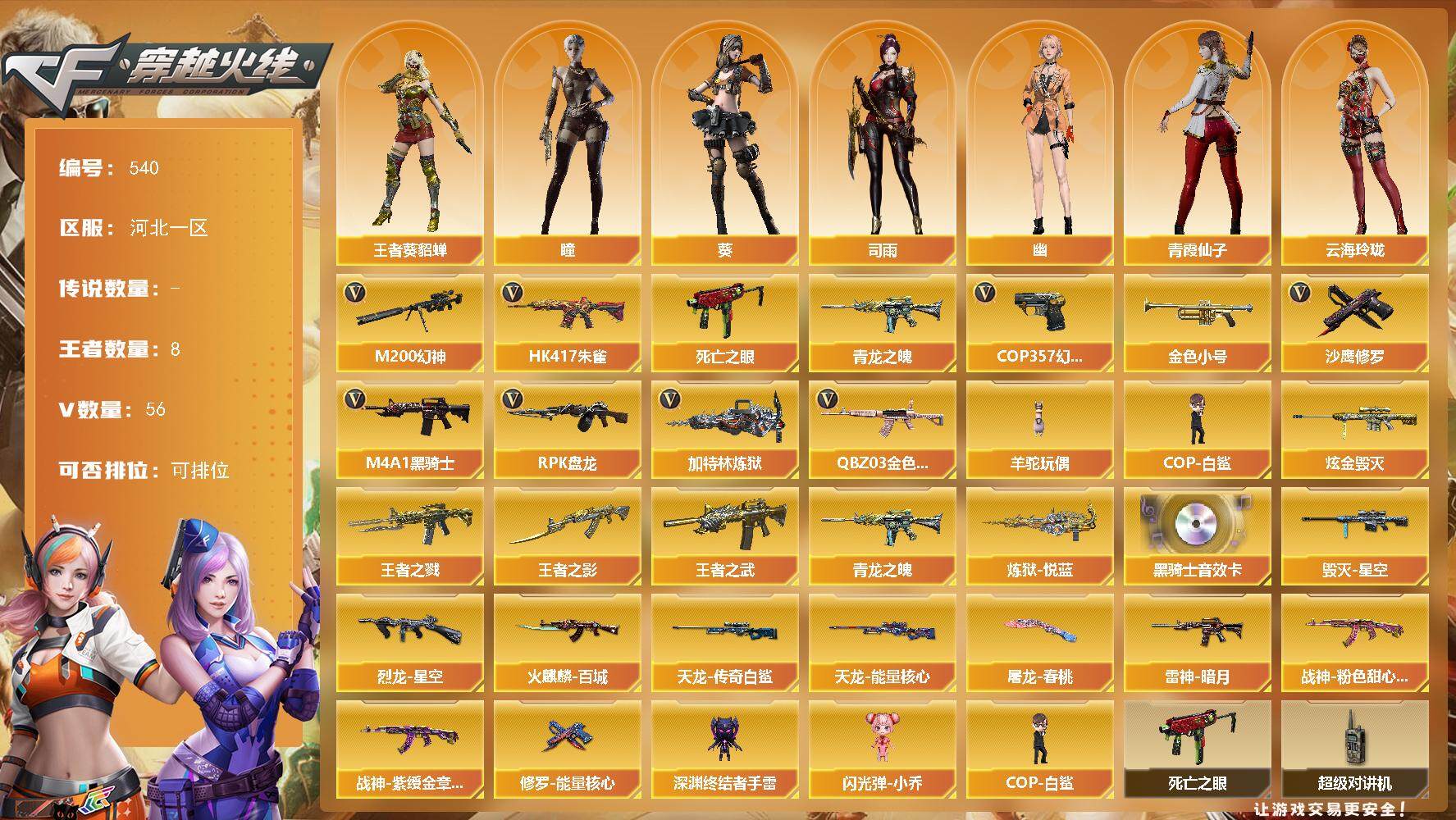 [14860017]河北一区-56V-8王者-1炫金 【热门武器】:QBZ03-金色蔷薇,HK417-朱雀,M200-幻神,死亡之眼,青龙之魄,金色小号,M4A1-黑骑士,RPK-盘龙,加特林-炼狱,羊驼玩偶,COP-白鲨,COP 357-幻灵,沙鹰-修罗*3 【王者炫金武器】:王者之戮,王者之武,王者之影,青龙之魄,炼狱-悦蓝,炫金毁灭 【音效卡】:M4A1-黑骑士音效卡 【皮肤】:烈龙-星空,雷神-暗月,火麒麟-百城,毁灭-星空,战神-粉色甜心皮肤,战神-紫绶金章皮肤,天龙-能量核心,AWM-天龙-传奇白鲨,修罗-能量核心,屠龙-春桃 皮肤 【角色】:葵,瞳,司雨,王者-葵-貂蝉,云海玲珑,空,电竞少女,芳心审判者,兰-新年限定,猎狐者-追月,灵狐-花神,灵狐者-X,灵狐者-黄金海岸,曼陀罗-X,曼陀罗-礼服,玫瑰花神,潘多拉-X,青霞仙子,兔囡囡,新娜塔莎,夜玫瑰-幻能朋克,夜玫瑰-宠粉,幽 【人偶武器】:COP-白鲨,深渊终结者手雷,闪光弹-小乔 【暴走生化】:死亡之眼,超级对讲机 【挑战大师】:激光毁灭者III 【英雄级武器】:AK47-火麒麟*2,M4A1-雷神*2,M4A1-黑骑士,AK47-无影,AK47-黑武士,AK12-天启,AK47-黑鲨,HK417-朱雀,QBZ03-云龙,M4A1-玫瑰精灵,QBZ03-金色蔷薇,王者之魄-觉醒版,王者之势-觉醒版,AK-47-猩红传说,AK47-B-战神,AWM-天龙,Barrett-毁灭*2,Barrett-极光,AWM-裁决,M200-幻神,RPK-盘龙,加特林-炼狱,AA-12-雷霆,沙鹰-修罗*3,沙鹰-天神*2,COP 357-幻灵,屠龙,龙啸,擎天*2,麒麟刺*2,幻灵之锋,高爆手雷-雷霆,高爆手雷-幻灵*2,手雷-云海游龙,闪光弹-雷霆,闪光弹-幻灵*2,闪光弹-云龙,烟雾弹-雷霆,烟雾弹-幻灵*2,M4A1-赤狱骑士 【道具】:超级背包,救世主-黑桃战神,妩媚妖姬,绿色巨人,灵魂忍者,迷雾幽灵,生化弹匣,夺命之镰,防化服*2,金色流光-枪王排位*2,星辰流光-枪王排位,枪王排位28赛季金色流光,枪王排位29赛季金色流光,防弹头盔*5,防弹衣*4,C4工具钳*3,手雷包*3 【特殊枪械】:1黑骑士,1盘龙,1炼狱