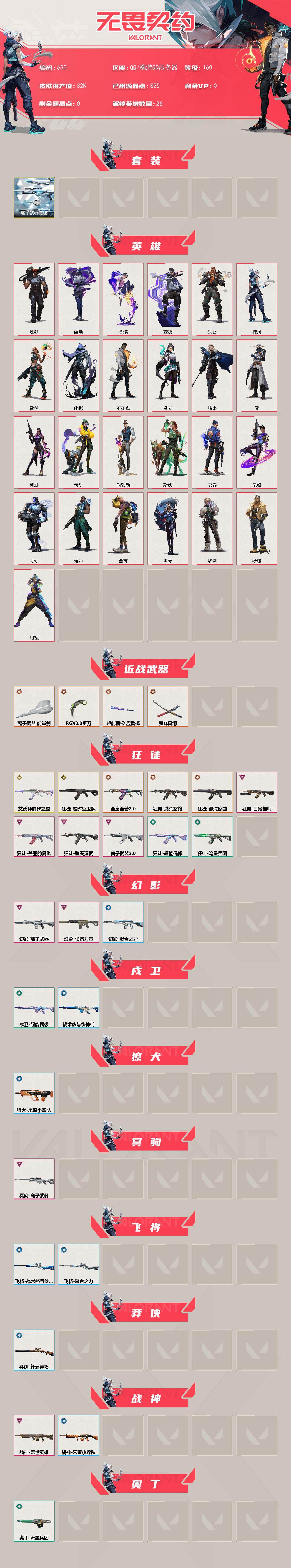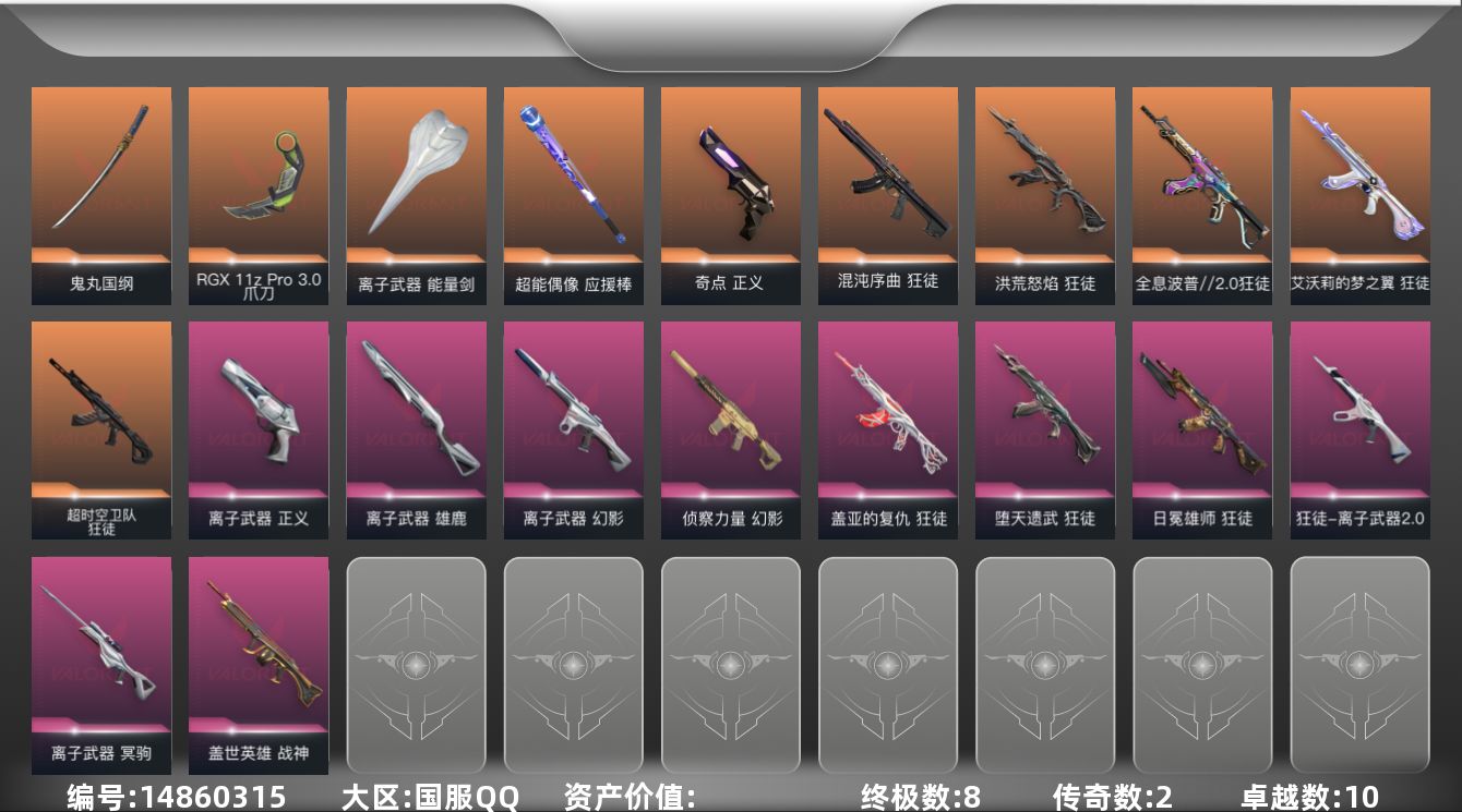 [14860315]【套装】:离子武器套装 【英雄】:幻棱,炼狱,维斯,暮蝶,钛狐,壹决,铁臂,捷风,雷兹,幽影,不死鸟,贤者,猎枭,零,芮娜,奇乐,尚勃勒,斯凯,夜露,星礈,K/O,海神,盖可,黑梦,钢锁 【近战武器】:近战武器-RGX 11z Pro//3.0 爪刀,近战武器-鬼丸国纲,近战武器-离子武器 能量剑,近战武器-超能偶像 应援棒 【狂徒】:狂徒-艾沃莉的梦之翼,狂徒-超时空卫队,狂徒-洪荒怒焰,狂徒-混沌序曲,狂徒-全息波普//2.0,狂徒-堕天遗武,狂徒-盖亚的复仇,狂徒-日冕雄师,狂徒-离子武器//2.0,狂徒-超能偶像,狂徒-流星兵团 【幻影】:幻影-离子武器,幻影-侦察力量,幻影-聚合之力 【戍卫】:戍卫-超能偶像,戍卫-战术熊与伙伴们 【獠犬】:獠犬-采蜜小蜂队 【冥驹】:冥驹-离子武器 【飞将】:飞将-聚合之力,飞将-战术熊与伙伴们 【莽侠】:莽侠-纤云弄巧 【战神】:战神-盖世英雄,战神-采蜜小蜂队 【奥丁】:奥丁-流星兵团 【判官】:判官-超能偶像,判官-采蜜小蜂队 【雄鹿】:雄鹿-离子武器 【骇灵】:骇灵-流星兵团 【蜂刺】:蜂刺-聚合之力,蜂刺-纤云弄巧 【标配】:标配-超能偶像,标配-战术熊与伙伴们 【正义】:正义-奇点,正义-离子武器,正义-纤云弄巧 【鬼魅】:鬼魅-诡秘蛇影,鬼魅-采蜜小蜂队 【狂怒】:狂怒-聚合之力,狂怒-战术熊与伙伴们 【短炮】:短炮-纤云弄巧 【卡面】:《双城之战》拥抱 卡面,精灵大战 卡面,欢迎来到底城 卡面,南瓜盛典 卡面,正义的化身 卡面,终章:生意人麦宝 卡面,铁之华 卡面,失而复得 卡面,时间到 卡面,最高舞台 卡面,复活专家 卡面,归乡 // 蝰蛇 卡面,超能偶像 卡面,生意人麦宝 卡面,声感陷阱设计图 卡面,钢锁工牌 卡面,战术小伙伴的夏日 卡面,采蜜小蜂队 卡面,聚合之力 卡面,梦幻奶茶 卡面,失控边缘 卡面,哨卫者之领域 卡面,暮蝶工牌 卡面,战术熊与伙伴们 卡面,源能反应 卡面,流星兵团 卡面,纤云弄巧 卡面,暂别喧嚣 卡面,打造专属狂徒 卡面,零点嗅探设计图 卡面,无畏契约GO!第一卷:芮娜 卡面,无畏契约GO!第一卷:零 卡面,《双城之战》金克丝 卡面,别冒尖 卡面,代号红色 卡面,新兵报到 卡面,V契约 卡面,无畏契约 卡面 【喷漆】:嗨宝南瓜灯 喷漆,嘭! 喷漆,都算到了 喷漆,控场勿近 喷漆