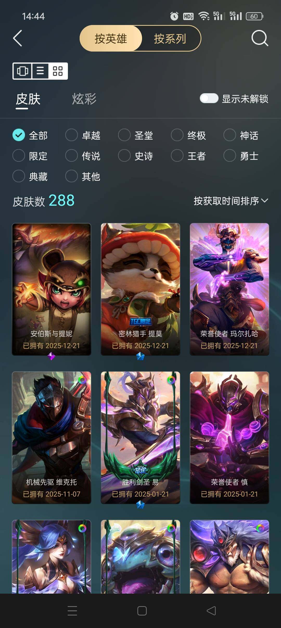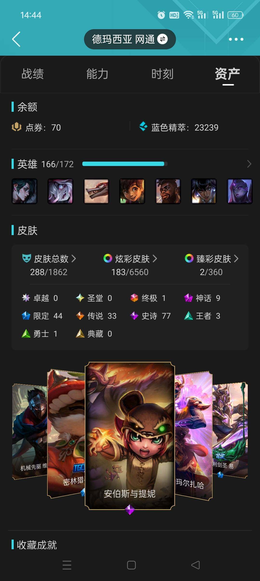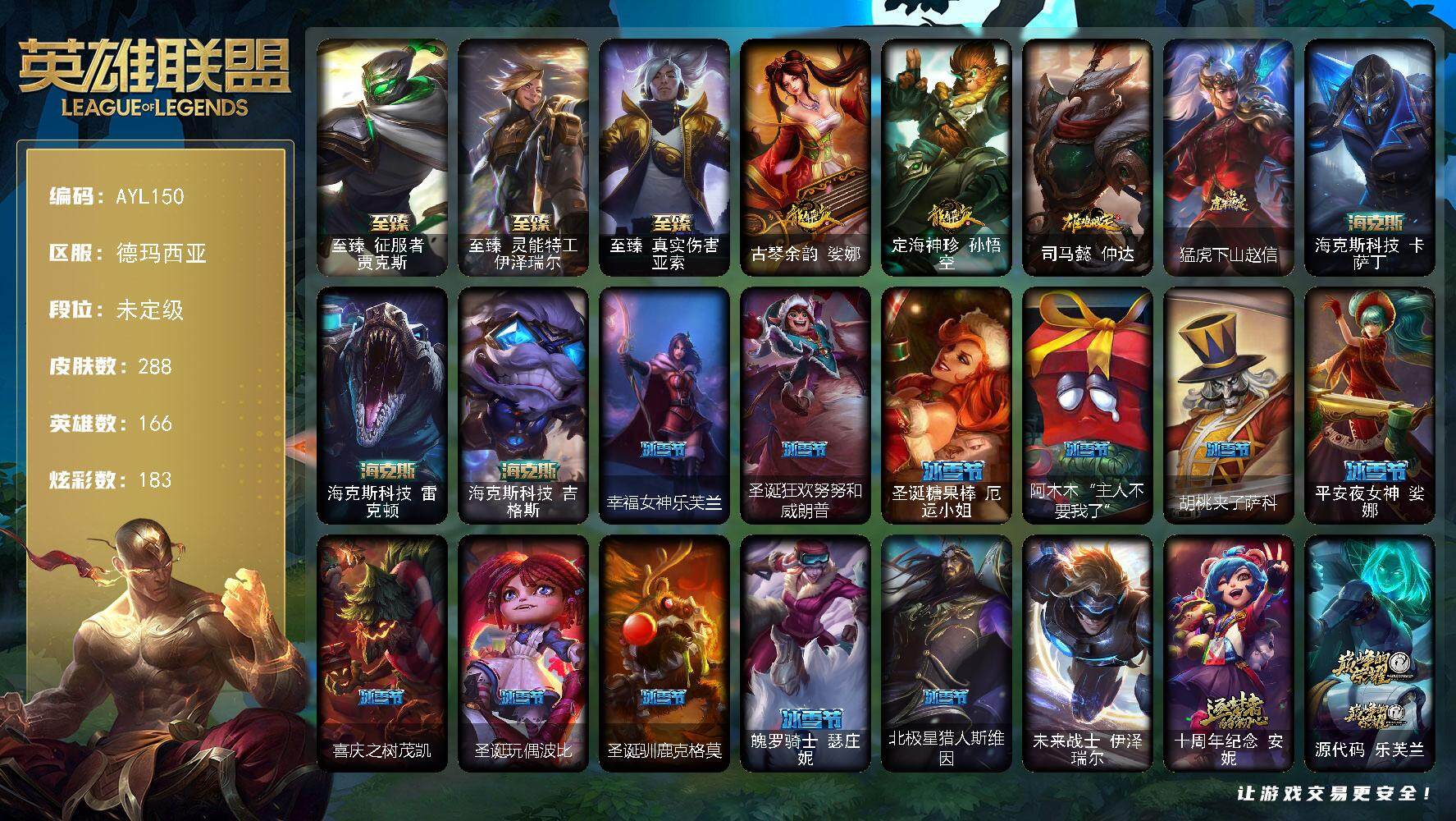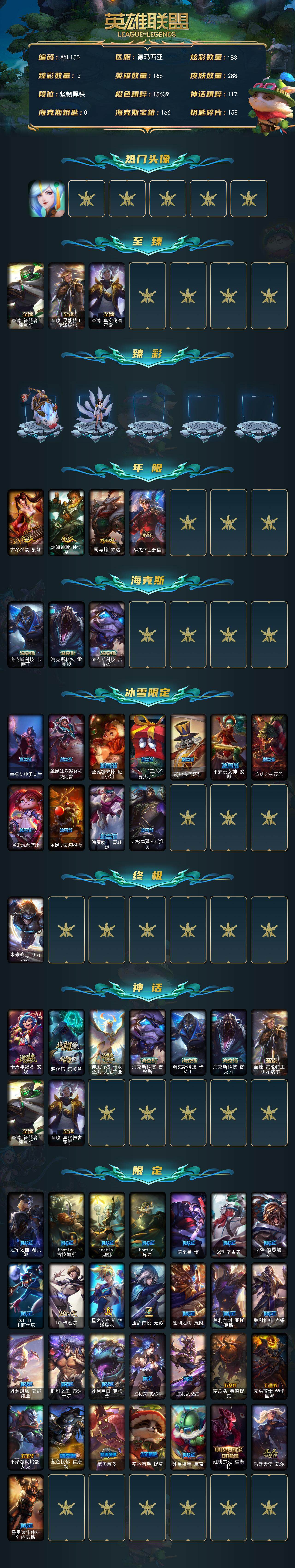[14861527]【店主推荐捡漏号】未定级段位-166英雄-288皮肤-183炫彩-1终极-9神话-44限定-33传说-77史诗