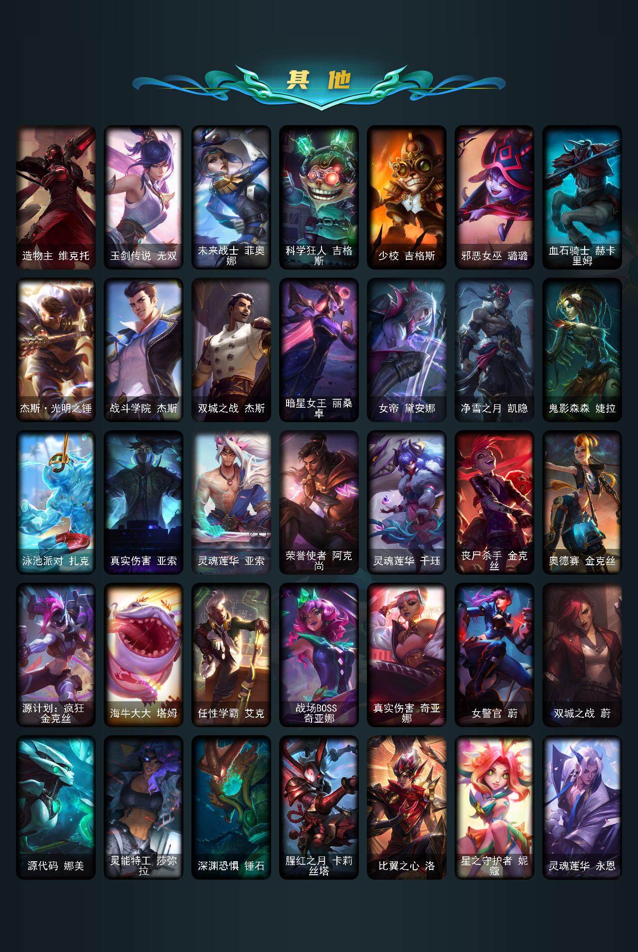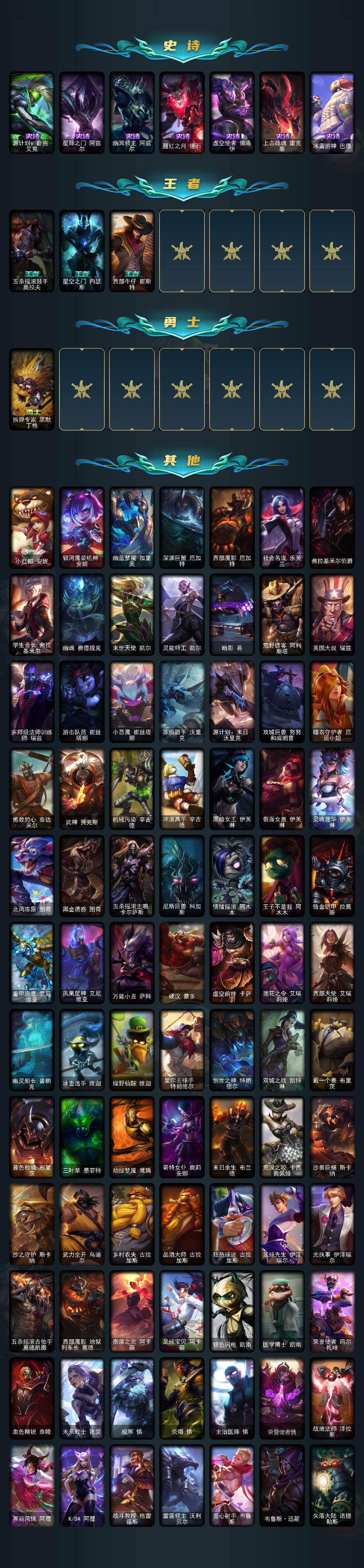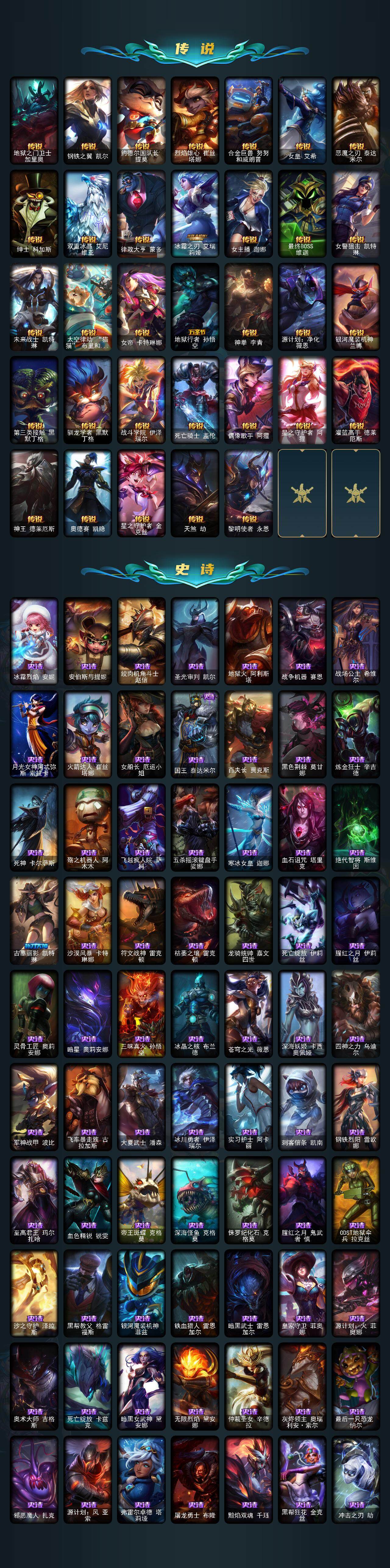 【传说皮肤】:地狱之门卫士加里奥,钢铁之翼凯尔,约德尔国队长提莫,烈焰雄心崔丝塔娜,合金巨兽努努和威朗普,女皇艾希,恶魔之刃泰达米尔,绅士科加斯,双重冰晶艾尼维亚,律政大亨蒙多,冰霜之刃艾瑞莉娅,女主播迦娜,最终BOSS维迦,女警狙击凯特琳,未来战士凯特琳,太空律动猫猫布里和里茨,女帝卡特琳娜,地狱行者孙悟空,神拳李青,源计划净化薇恩,银河魔装机神兰博,第三类接触黑默丁格,驯龙学者黑默丁格,战斗学院伊泽瑞尔,死亡骑士盖伦,偶像歌手阿狸,星之守护者阿狸,灌篮高手德莱厄斯,神王德莱厄斯,奥德赛凯隐,星之守护者金克丝,天煞劫,黎明使者永恩