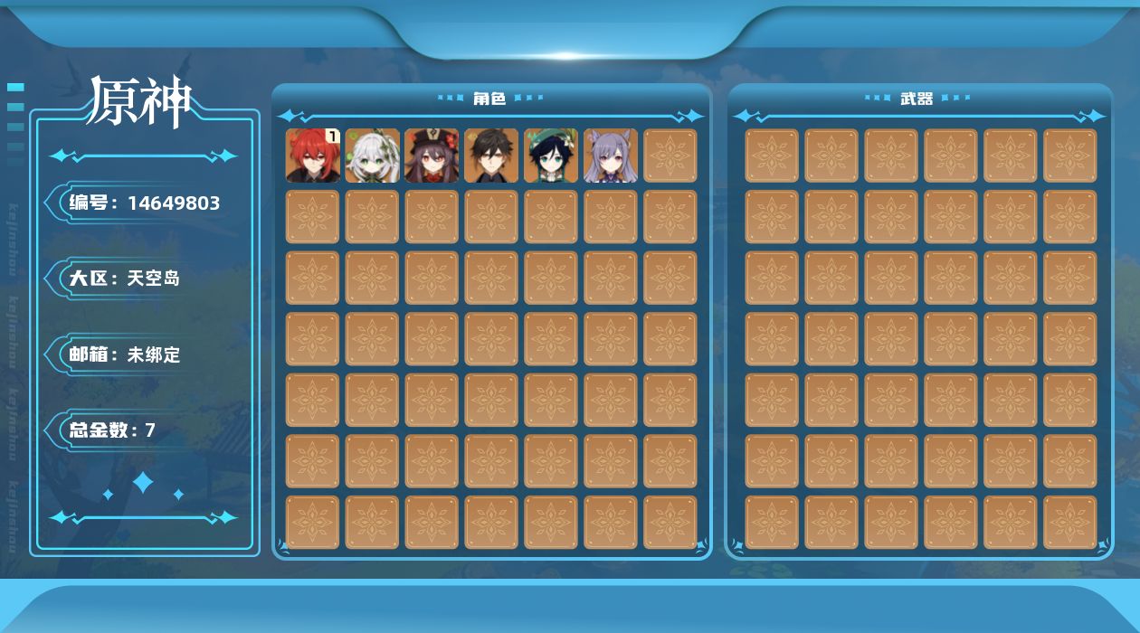 - [15334348]55级/15黄/男主/8个五星角色/4个五星武器 0命提纳里,1命雷电将军,0命枫原万叶,0命钟离,1命胡桃,0命莫娜,1命迪卢克,0命菈乌玛,精1最初的大魔术,精1和璞鸢,精1风鹰剑,精1血染荒城
