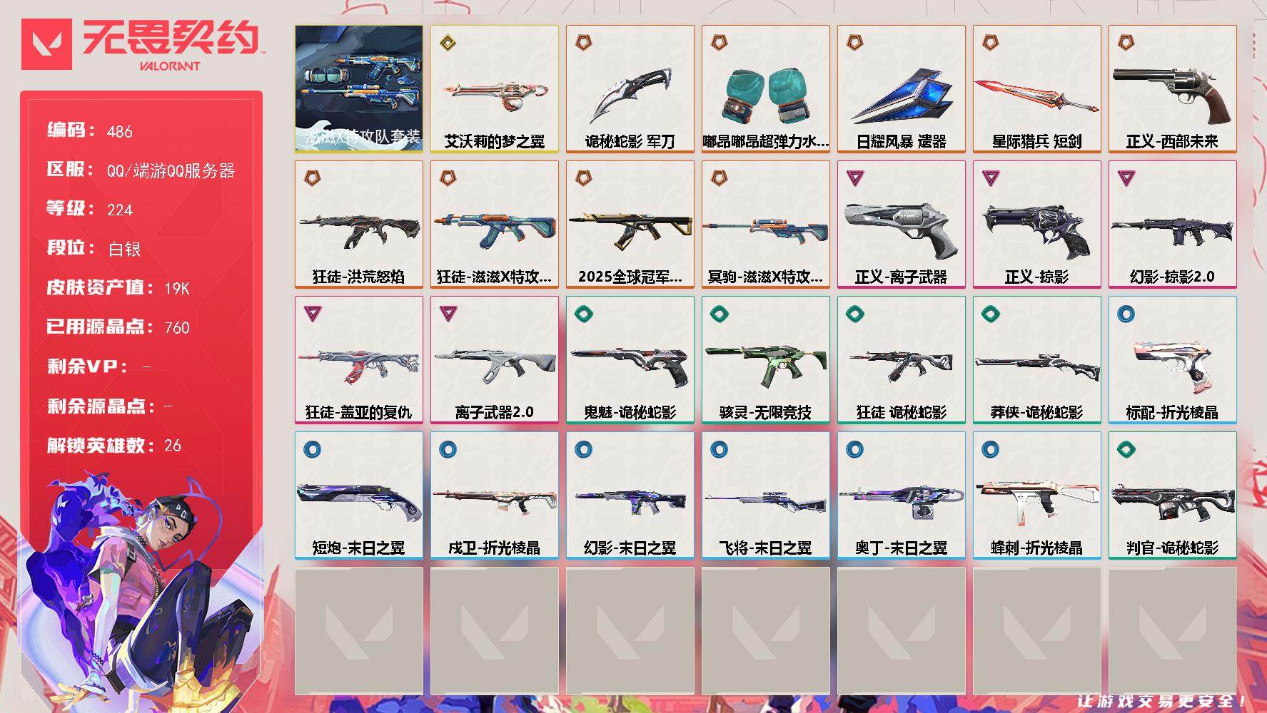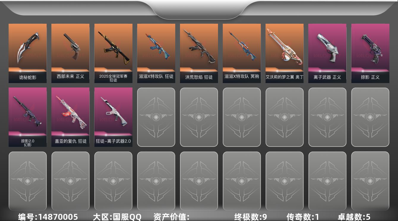 [14870005]【套装】:滋滋X特攻队套装 【英雄】:幻棱,炼狱,维斯,暮蝶,壹决,铁臂,捷风,雷兹,幽影,不死鸟,贤者,猎枭,蝰蛇,零,芮娜,奇乐,尚勃勒,霓虹,斯凯,夜露,K/O,海神,盖可,黑梦,钢锁 【近战武器】:近战武器-嘟昂嘟昂超弹力水球拳套,近战武器-诡秘蛇影 军刀,近战武器-日耀风暴 遗器,近战武器-星际猎兵 短剑 【狂徒】:狂徒-2025全球冠军赛,狂徒-洪荒怒焰,狂徒-滋滋X特攻队,狂徒-盖亚的复仇,狂徒-离子武器//2.0,狂徒-诡秘蛇影 【幻影】:幻影-掠影//2.0,幻影-末日之翼 【戍卫】:戍卫-折光棱晶 【冥驹】:冥驹-滋滋X特攻队 【飞将】:飞将-末日之翼 【莽侠】:莽侠-诡秘蛇影 【奥丁】:奥丁-艾沃莉的梦之翼,奥丁-末日之翼 【判官】:判官-诡秘蛇影 【骇灵】:骇灵-无限竞技 【蜂刺】:蜂刺-折光棱晶 【标配】:标配-折光棱晶 【正义】:正义-西部未来,正义-掠影,正义-离子武器 【鬼魅】:鬼魅-诡秘蛇影 【短炮】:短炮-末日之翼 【卡面】:分崩离析 卡面,无畏契约:暮蝶 卡面,排除故障 卡面,热舞环节 卡面,复活专家 卡面,红鳞松叶 卡面,Clutch 卡面,表象之下 卡面,无畏契约GO!第一卷:芮娜 卡面,无畏契约GO!第一卷:零 卡面,《双城之战》金克丝 卡面,暗枪 卡面,钢锁vs盖可 卡面,别冒尖 卡面,代号红色 卡面,新兵报到 卡面,V契约 卡面,无畏契约 卡面 【喷漆】:鼻尖上的蝴蝶 喷漆,伤心心 喷漆,审判之爪 喷漆,加油!加油! 喷漆,买装还是存钱 喷漆,关门放狗 喷漆,无畏契约GO!第一卷:零 喷漆,暴走萝莉 喷漆,胜利属于无畏契约 喷漆,GLHF 喷漆,无畏契约 喷漆 【挂饰】:无畏契约GO!第一卷 芮娜 挂饰,无畏契约GO!第一卷 零 挂饰,薰衣草之心 挂饰,动力机箱 挂饰,天外飞客 挂饰,《双城之战》魄罗 挂饰,无畏契约 纪念币 挂饰