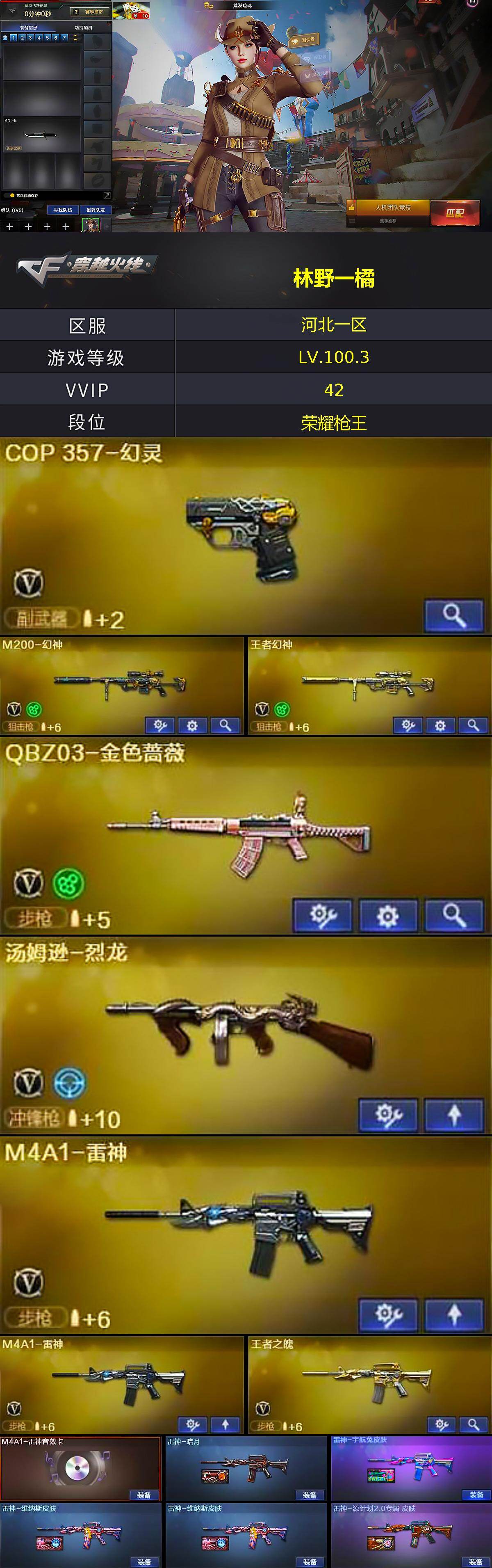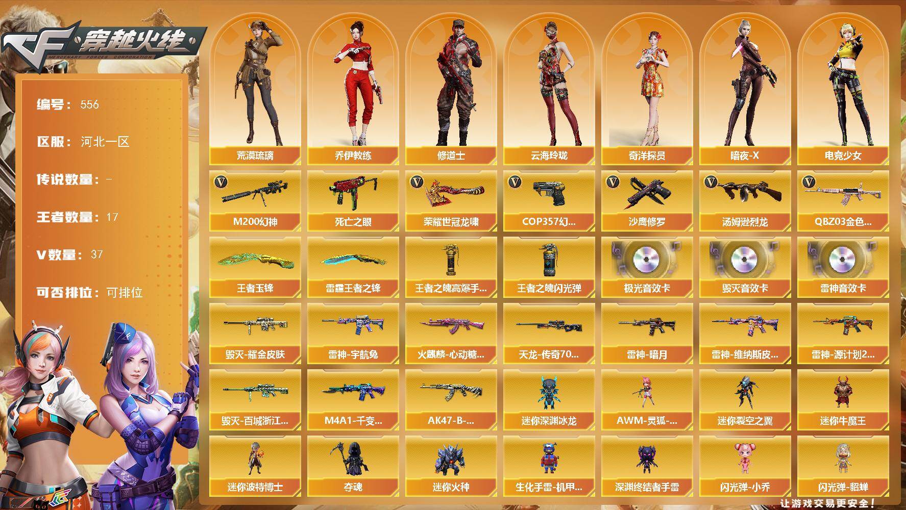 [14871897]河北一区-37V-17王者-0炫金 【热门武器】:QBZ03-金色蔷薇,M200-幻神,死亡之眼,汤姆逊-烈龙,COP 357-幻灵,沙鹰-修罗,荣耀世冠-龙啸 【王者炫金武器】:雷霆王者之锋,王者玉锋,王者之魄高爆手雷,王者之魄闪光弹*2 【音效卡】:M4A1-雷神音效卡,Barrett-毁灭音效卡,Barrett-极光音效卡 【皮肤】:雷神-暗月,雷神-宇航兔皮肤,雷神-维纳斯皮肤*2,雷神-源计划2.0专属 皮肤,火麒麟-心动糖果,毁灭耀金皮肤,毁灭-百城浙江 皮肤,M4A1-千变-孔明皮肤,AK47-B-常胜将军-刘备,AWM-天龙-传奇70KG 【角色】:荒漠琉璃,奇洋探员,乔伊教练,修道士,云海玲珑,暗夜-X,电竞少女,芳心审判者,飞虎队-X,虎妞,嘉年华灵狐,0号玩家,灵狐者-X,龙儿,龙儿-小淘气,麻雀,曼陀罗-X,潘多拉-X,潘多拉-甜心教官,斯沃特-X,维纳斯,新娜塔莎,影武者-X 【人偶武器】:AWM-灵狐-15周年嘉年华,迷你深渊冰龙,迷你裂空之翼,迷你牛魔王,迷你波特博士*5,夺魂*2,迷你火种*3,生化手雷-机甲核心*3,深渊终结者手雷,闪光弹-小乔,闪光弹-貂蝉,高爆手雷-大乔 【暴走生化】:死亡之眼,超级对讲机 【挑战大师】:冰龙粉碎者-白马银枪,激光毁灭者III-白马银枪*2,激光毁灭者III,试炼破坏者III 【英雄级武器】:AK47-火麒麟,M4A1-雷神*2,无影-神兵利器,黑武士-锦绣游龙,QBZ03-金色蔷薇,烈火-动感闪耀,王者之魄-觉醒版,AK-47-猩红传说*4,AK47-B-常胜将军,AWM-天龙,Barrett-毁灭,Barrett-极光,M200-幻神,王者幻神-觉醒版,汤姆逊-烈龙,沙鹰-修罗,COP 357-幻灵,天神-动感闪耀,屠龙*2,幻灵之锋*2,屠龙-动感闪耀,龙啸-热带奇洋,荣耀世冠-龙啸,王者之锋-觉醒版,王者之啸-觉醒版*2,王者之击-觉醒版,高爆手雷-幻灵,手雷-动感闪耀,手雷-热带奇洋,闪光弹-幻灵,烟雾弹-幻灵*2,M4A1-赤狱骑士 【道具】:CFS限定背包,奇洋探员-海龟背包,炫彩背包,超级背包,哔哩哔哩名片,救世主-黑桃战神,绿色巨人,灵魂忍者*2,变异宝贝,迷雾幽灵,生化弹匣,夺命之镰,防化服*3,金色流光-枪王排位*2,星辰流光-枪王排位,巅峰赛先锋-金色流光,枪王排位28赛