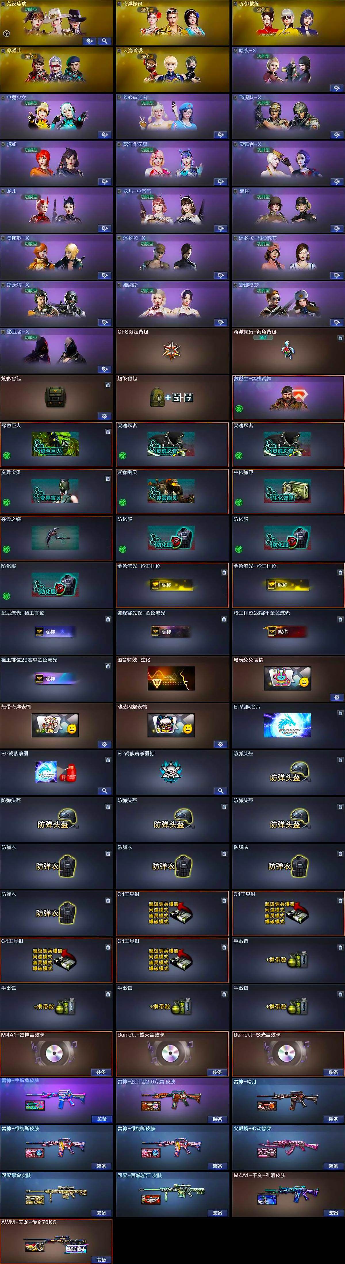 【道具】:CFS限定背包,奇洋探员-海龟背包,炫彩背包,超级背包,哔哩哔哩名片,救世主-黑桃战神,绿色巨人,灵魂忍者*2,变异宝贝,迷雾幽灵,生化弹匣,夺命之镰,防化服*3,金色流光-枪王排位*2,星辰流光-枪王排位,巅峰赛先锋-金色流光,枪王排位28赛