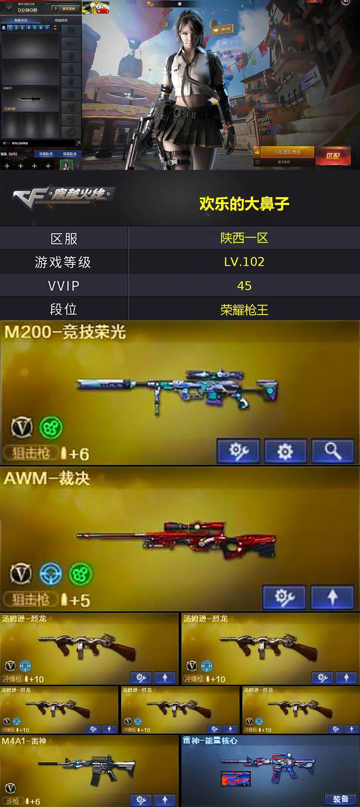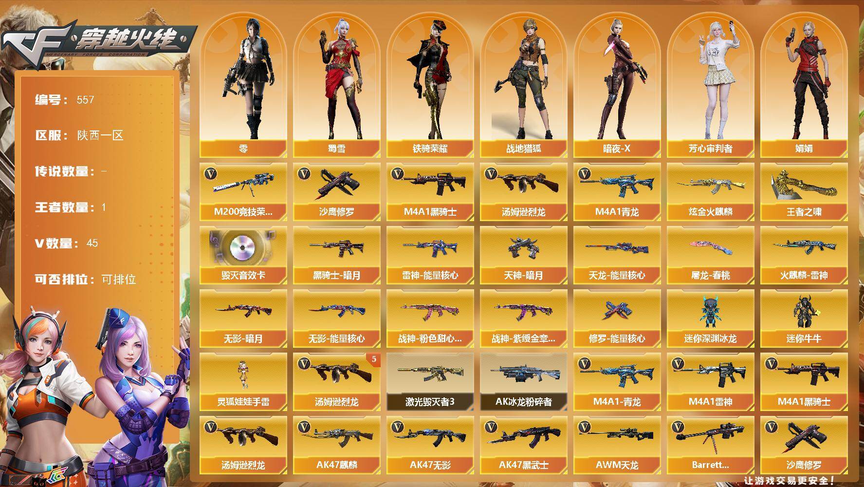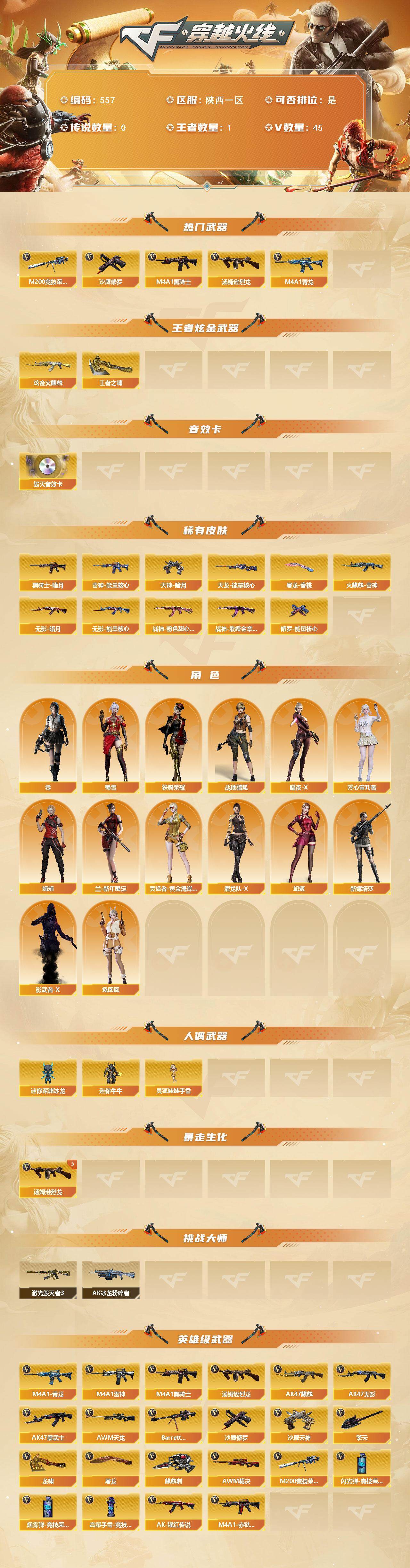 [14872165]陕西一区-45V-1王者-1炫金 【热门武器】:M4A1-青龙,M200-竞技荣光,M4A1-黑骑士,汤姆逊-烈龙*5,沙鹰-修罗*3 【王者炫金武器】:王者之啸,炫金火麒麟 【音效卡】:Barrett-毁灭音效卡 【皮肤】:雷神-能量核心,火麒麟-雷神,黑骑士-暗月,无影-暗月*2,无影-能量核心,战神-粉色甜心皮肤*2,战神-紫绶金章皮肤,天龙-能量核心,修罗-能量核心,天神-暗月,屠龙-春桃 皮肤 【角色】:零,战地猎狐,暗夜-X,芳心审判者,娟娟,兰-新年限定,灵狐者-黄金海岸,潜龙队-X,蛇姬,蜀雪,铁骑荣耀,兔囡囡,新娜塔莎,影武者-X 【人偶武器】:迷你深渊冰龙,迷你牛牛,灵狐娃娃手雷 【挑战大师】:AK47-冰龙粉碎者,激光毁灭者III 【英雄级武器】:AK47-麒麟,M4A1-雷神,M4A1-黑骑士,AK47-无影,AK47-黑武士,M4A1-青龙,AK-47-猩红传说*4,AWM-天龙,Barrett-毁灭,AWM-裁决,M200-竞技荣光,汤姆逊-烈龙*5,沙鹰-修罗*3,沙鹰-天神*2,屠龙*4,龙啸,擎天*2,麒麟刺,高爆手雷-竞技荣光*3,闪光弹-竞技荣光*3,烟雾弹-竞技荣光*2,M4A1-赤狱骑士 【道具】:BS战队炫彩背包,云山科技背包,亚洲杯纪念炫彩背包,古蛇迷踪炫彩背包,战舰背包,炫彩背包,背包-洛丽塔,超级背包,救世主-黑桃战神,黄金生化钩,绿色巨人,灵魂忍者,变异宝贝,迷雾幽灵,生化弹匣,夺命之镰,防化服*3,流光-再燃火线,枪王排位29赛季金色流光,C4-沙漠,防弹头盔*10,防弹衣*9,C4工具钳*7,手雷包*6 【特殊枪械】:1黑骑士,5烈龙