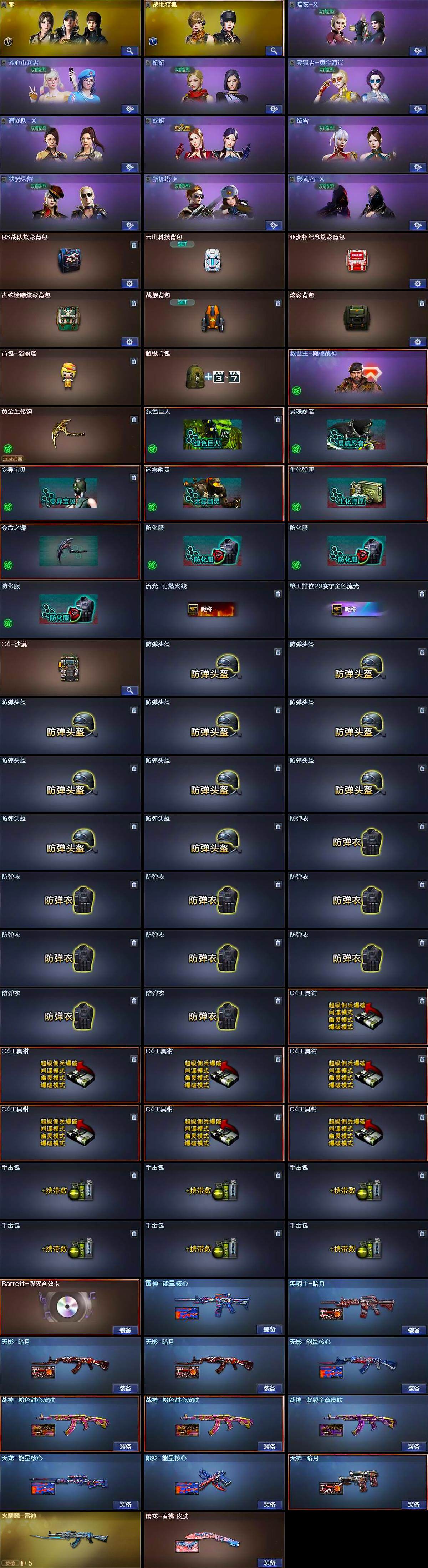 【道具】:BS战队炫彩背包,云山科技背包,亚洲杯纪念炫彩背包,古蛇迷踪炫彩背包,战舰背包,炫彩背包,背包-洛丽塔,超级背包,救世主-黑桃战神,黄金生化钩,绿色巨人,灵魂忍者,变异宝贝,迷雾幽灵,生化弹匣,夺命之镰,防化服*3,流光-再燃火线,枪王排位29赛季金色流光,C4-沙漠,防弹头盔*10,防弹衣*9,C4工具钳*7,手雷包*6