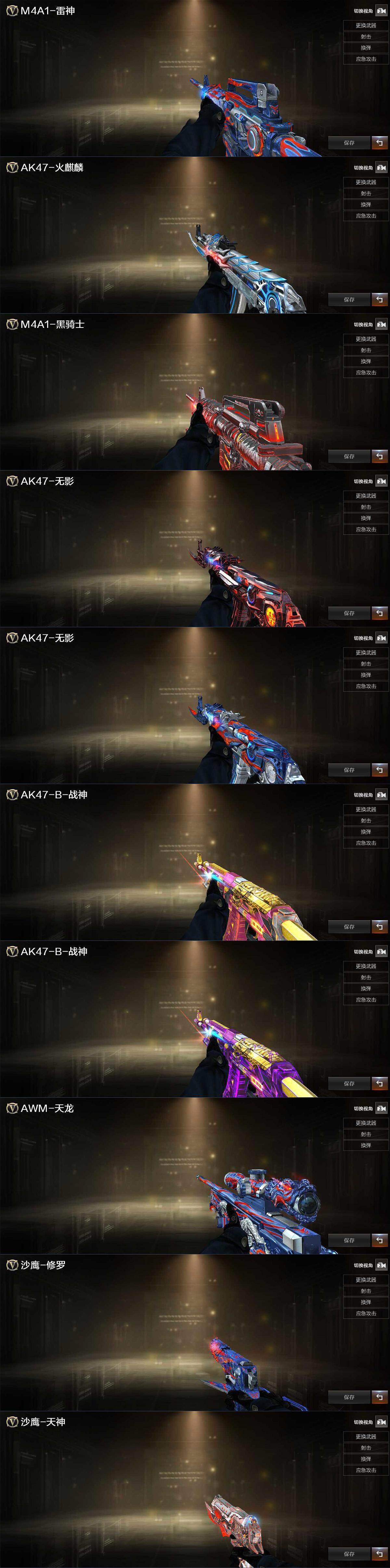 【英雄级武器】:AK47-麒麟,M4A1-雷神,M4A1-黑骑士,AK47-无影,AK47-黑武士,M4A1-青龙,AK-47-猩红传说*4,AWM-天龙,Barrett-毁灭,AWM-裁决,M200-竞技荣光,汤姆逊-烈龙*5,沙鹰-修罗*3,沙鹰-天神*2,屠龙*4,龙啸,擎天*2,麒麟刺,高爆手雷-竞技荣光*3,闪光弹-竞技荣光*3,烟雾弹-竞技荣光*2,M4A1-赤狱骑士