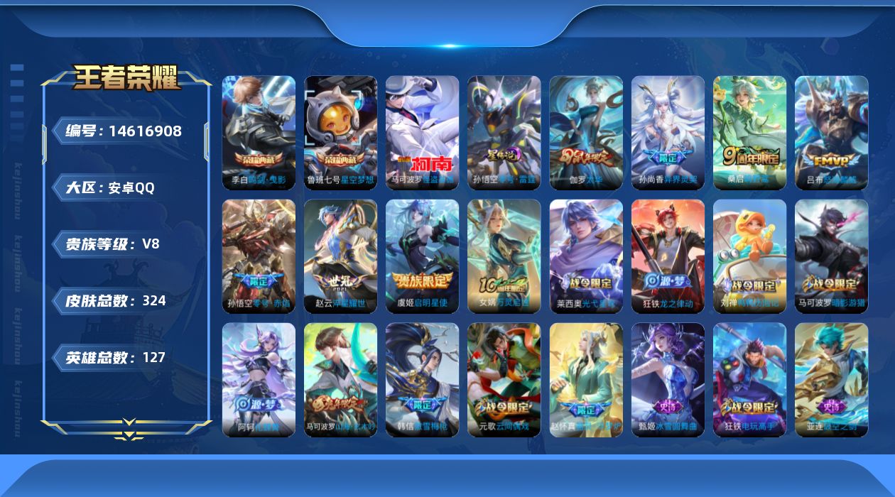 [14616908]【店主推荐捡漏号!可直接换绑】,安卓Q-V8-最强王者段位-127英雄-324皮肤-2典藏皮肤-1珍品传说-8传说-90史诗-1星元
