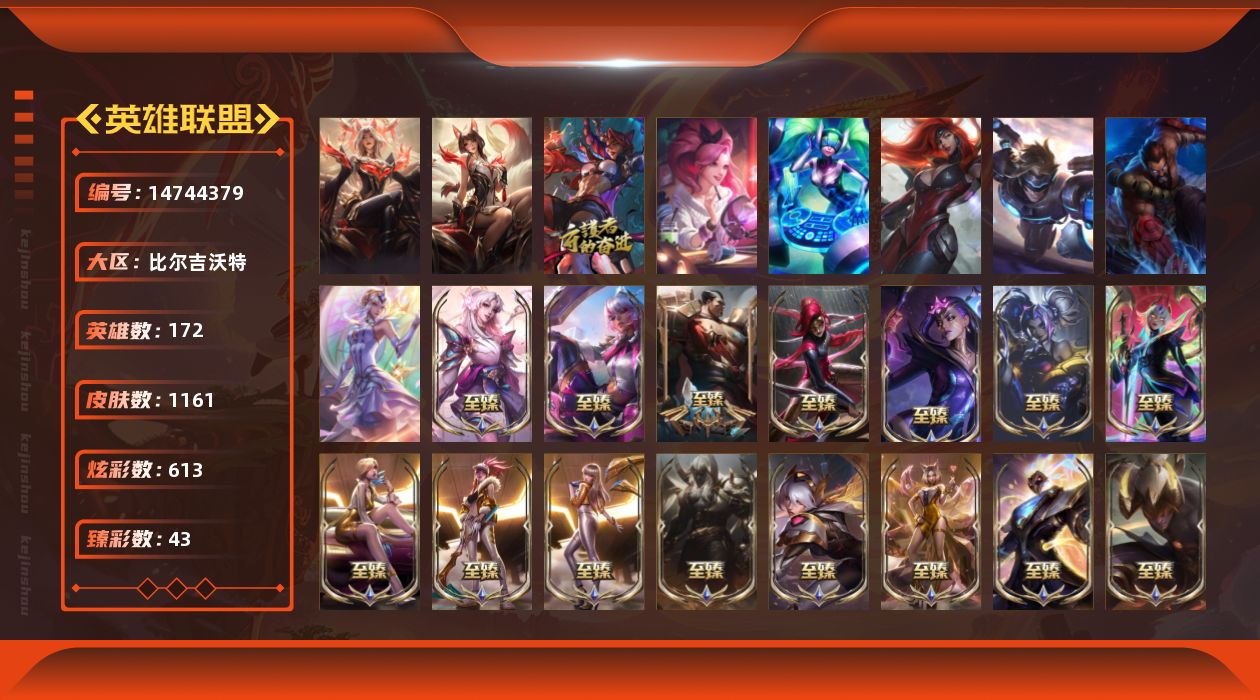 黄金段位-172英雄-1161皮肤-613炫彩-9终极-46神话-213限定-117传说-131史诗