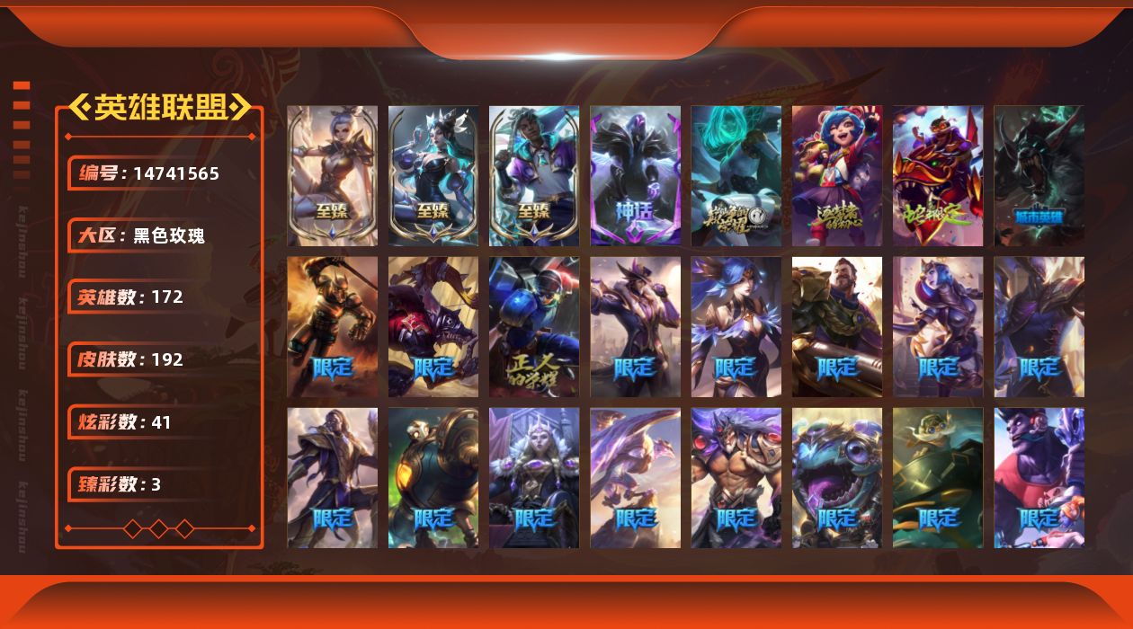 [14741565]铂金段位-172英雄-192皮肤-41炫彩-0终极-6神话-25限定-21传说-43史诗