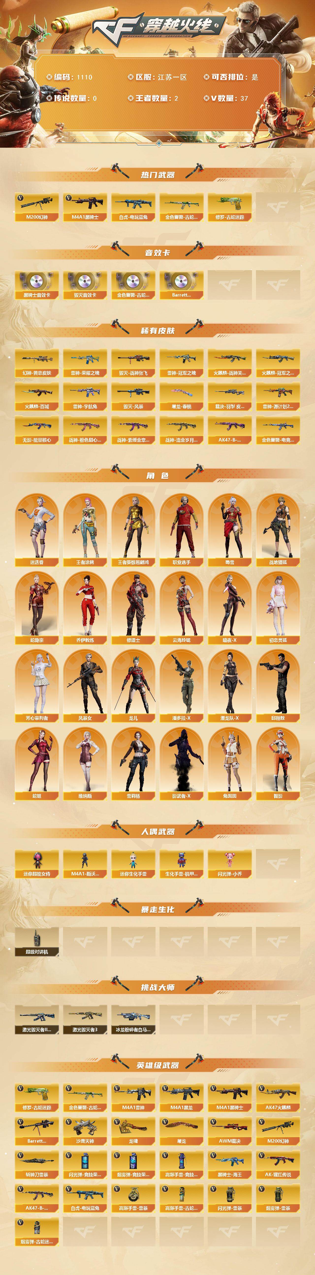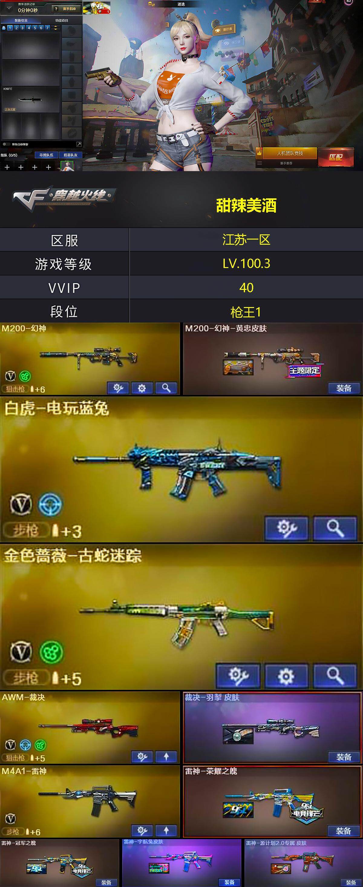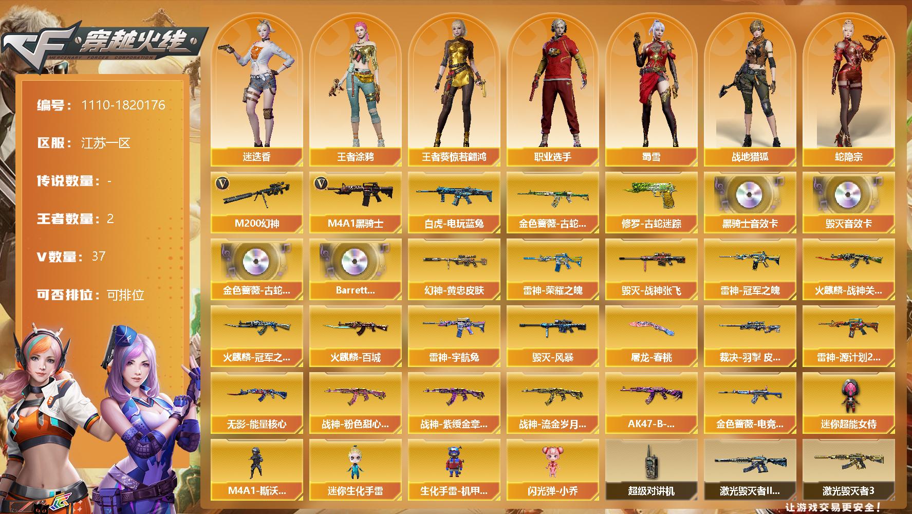 [14884683]江苏一区-37V-2王者-0炫金 【热门武器】:M200-幻神,金色蔷薇-古蛇迷踪,修罗-古蛇迷踪,白虎-电玩蓝兔,M4A1-黑骑士 【音效卡】:M4A1-黑骑士音效卡,Barrett-毁灭音效卡,QBZ03-金色蔷薇-古蛇迷踪音效卡,Barrett-碧霄极光音效卡 【皮肤】:M200-幻神-黄忠皮肤,金色蔷薇-电竞之星 皮肤,裁决-羽掣 皮肤,雷神-荣耀之魄,雷神-冠军之魄,雷神-宇航兔皮肤