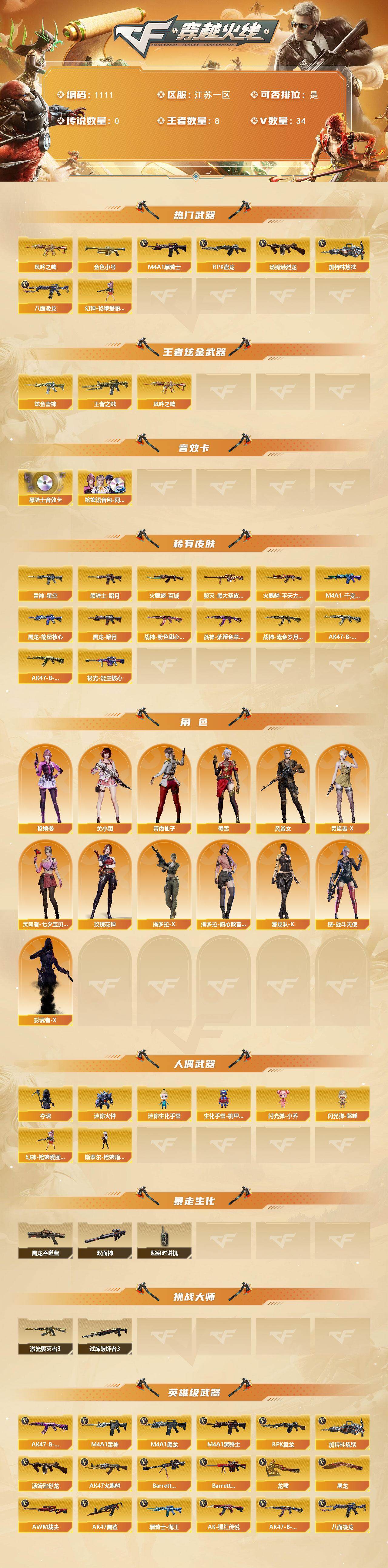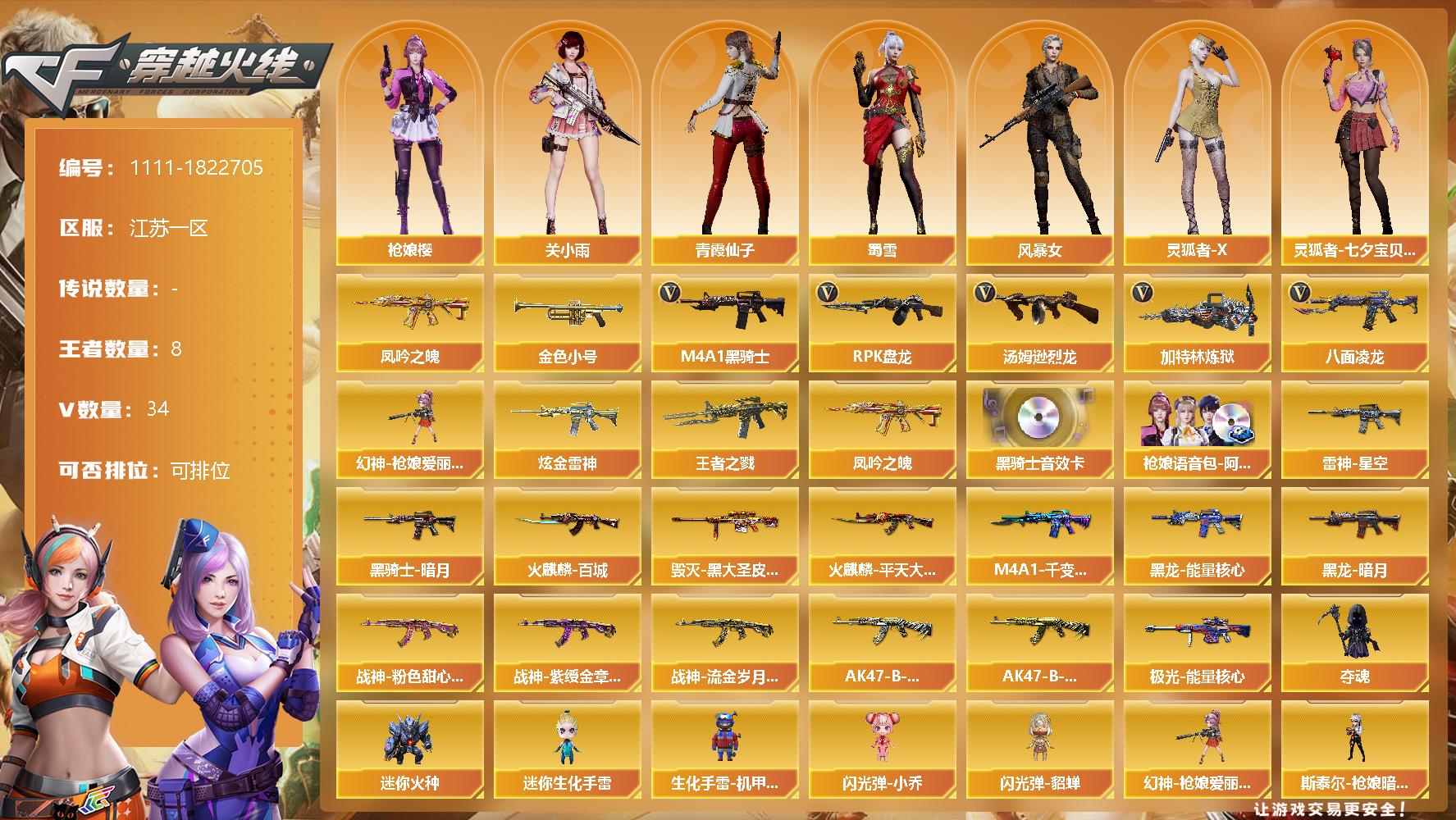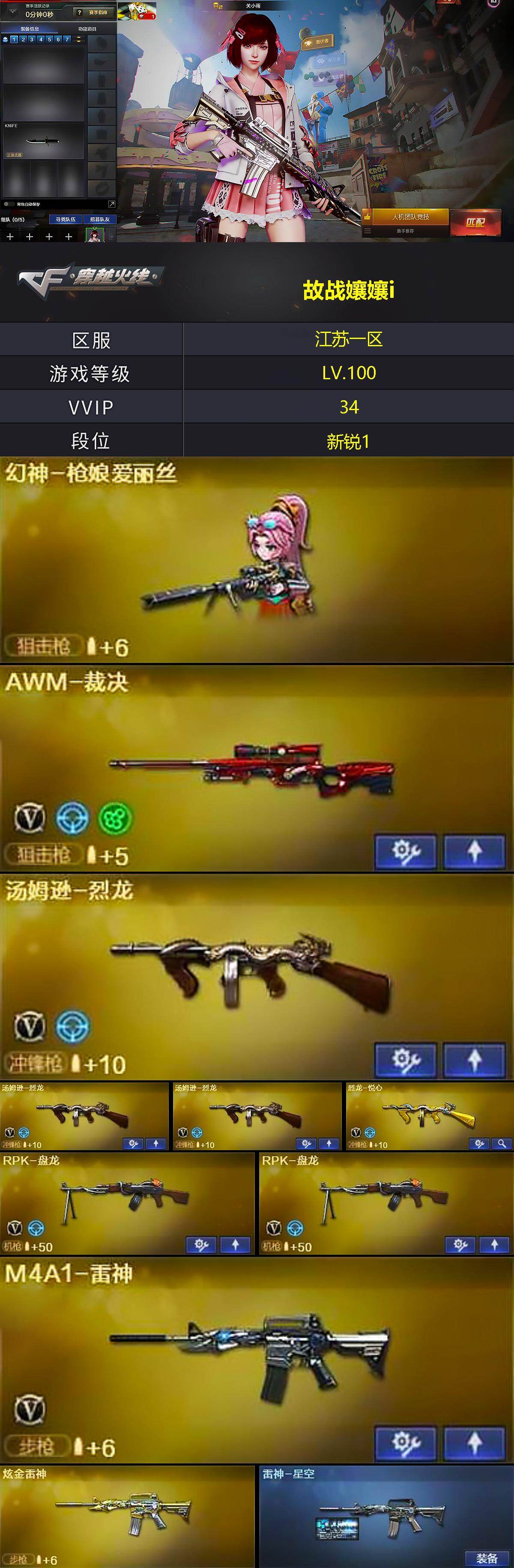 [14885279]江苏一区-34V-8王者-1炫金 【热门武器】:八面凌龙,凤吟之魄,金色小号,M4A1-黑骑士,汤姆逊-烈龙*3,RPK-盘龙*2,加特林-炼狱,幻神-枪娘爱丽丝 【王者炫金武器】:王者之戮,凤吟之魄,炫金雷神 【音效卡】:M4A1-黑骑士音效卡,枪娘语音包-阿敏 【皮肤】:雷神-星空,火麒麟-平天大圣,火麒麟-百城,毁灭-黑大圣皮肤*2,M4A1-千变-孔明皮肤*2,黑龙-能量核心,黑龙-暗