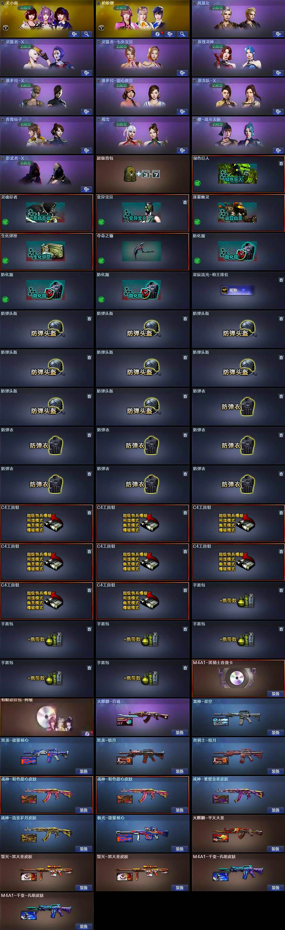 - [15242399]移动专区-37V-1王者-0炫金 【热门武器】:Scar Light-白虎,QBZ03-街机,沙鹰-修罗,炽芒蝶刃 【王者炫金武器】:王者星霆 【皮肤】:火麒麟-心动糖果 【角色】:华,暗夜-X,嘉年华灵狐,猎狐者-追月,潘多拉-X,斯沃特-X,蜀雪,维纳斯,影武者-X 【人偶武器】:AWM-灵狐-15周年嘉年华,灵狐娃娃手雷 【暴走生化】:超级对讲机 【挑战大师】:激光毁灭者III-白马银枪 【英雄级武器】:AK47-火麒麟,Scar Light-白虎,无影-神兵利器,QBZ03-云龙,黑武士-锦绣游龙,沙鹰-修罗,沙鹰-天神,COP 357-云龙*2,炽芒蝶刃,高爆手雷-雷霆,高爆手雷-云龙*7,闪光弹-雷霆,闪光弹-云龙*6,烟雾弹-雷霆,烟雾弹-云龙*7 【道具】:全能枪王背包,女皇终结者-魔龙之吻,生化弹匣,夺命之镰,防化服,金色流光-枪王排位,星辰流光-枪王排位,枪王排位28赛季金色流光,炽雪表情,防弹头盔,防弹衣,C4工具钳,手雷包 【特殊枪械】:1白虎