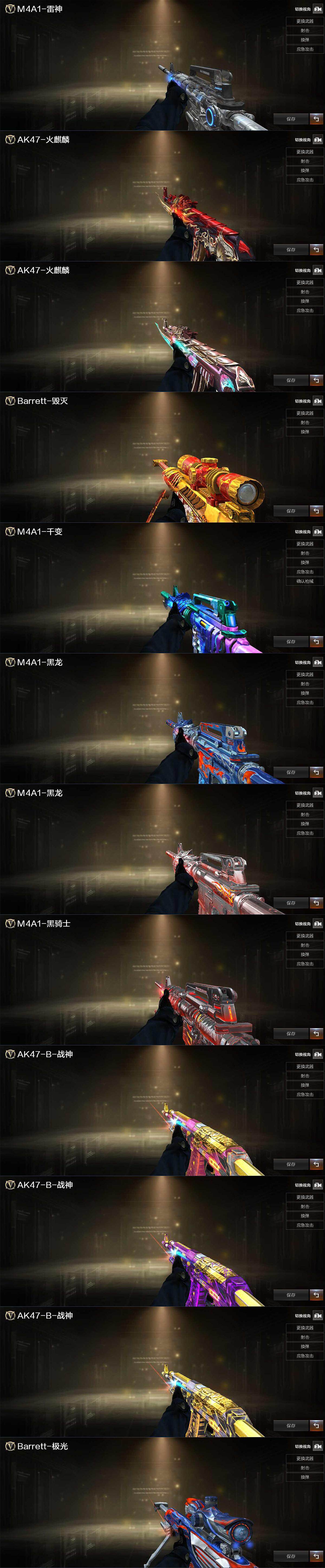 【热门武器】:八面凌龙,凤吟之魄,金色小号,M4A1-黑骑士,汤姆逊-烈龙*3,RPK-盘龙*2,加特林-炼狱,幻神-枪娘爱丽丝